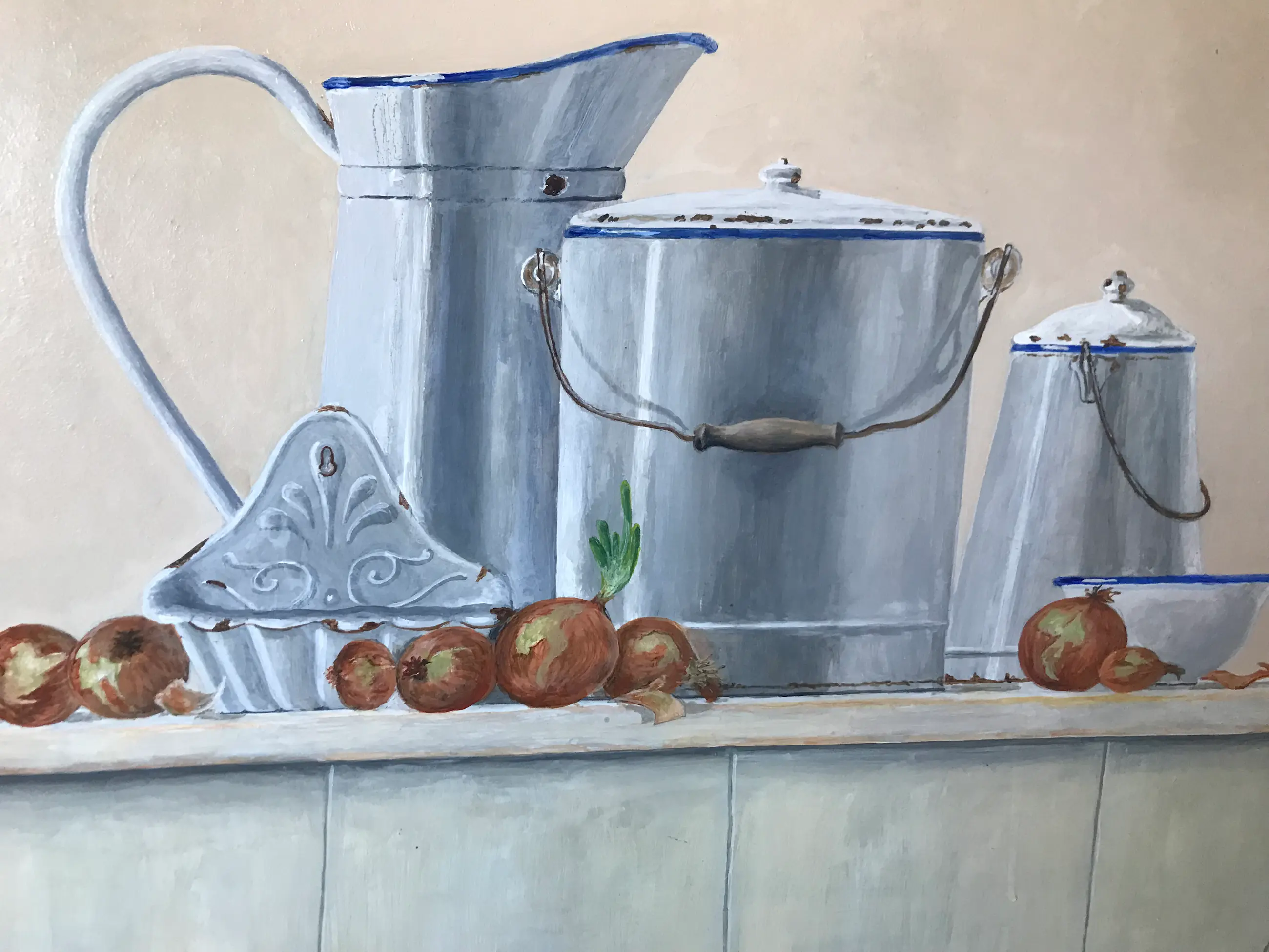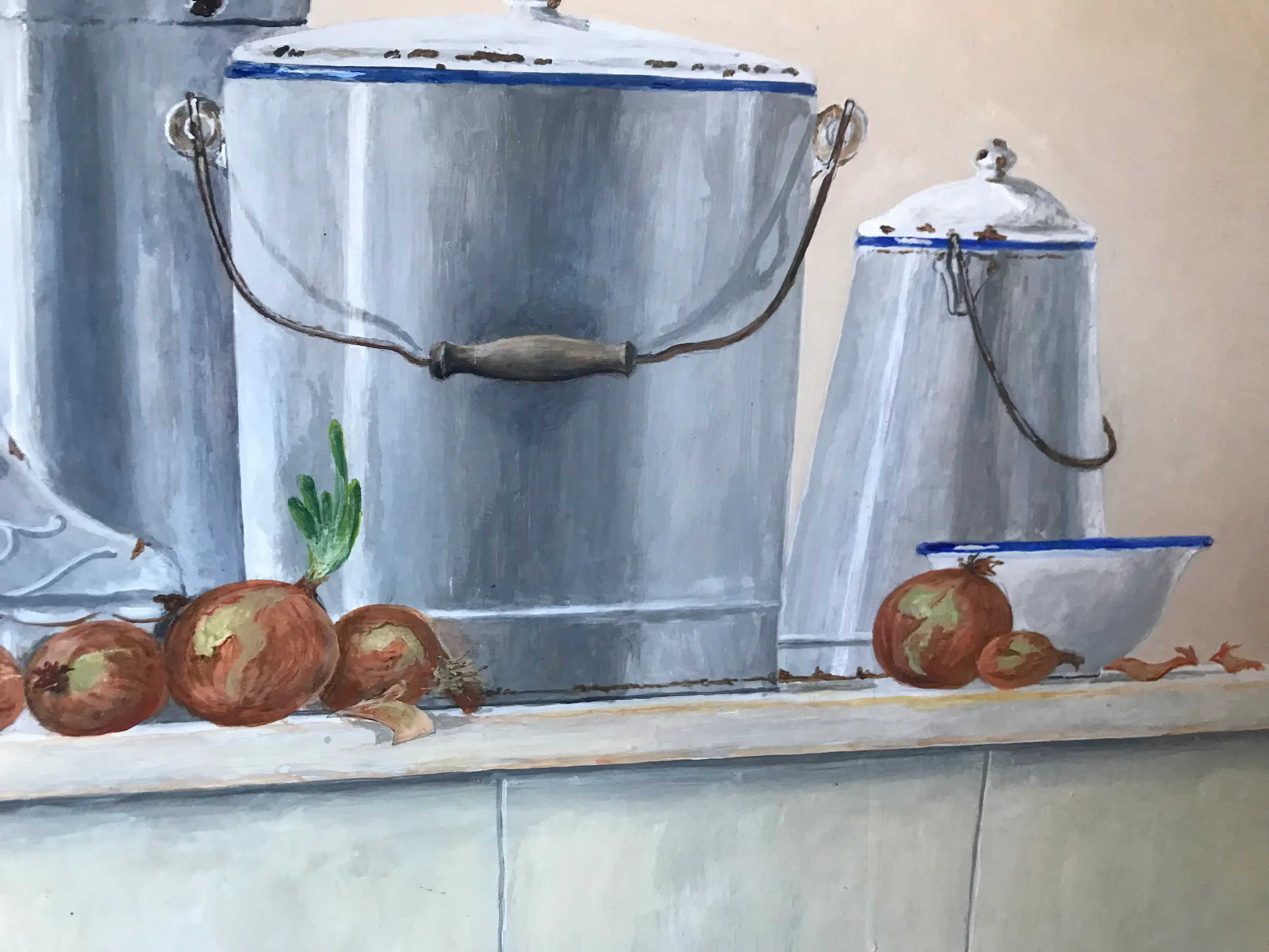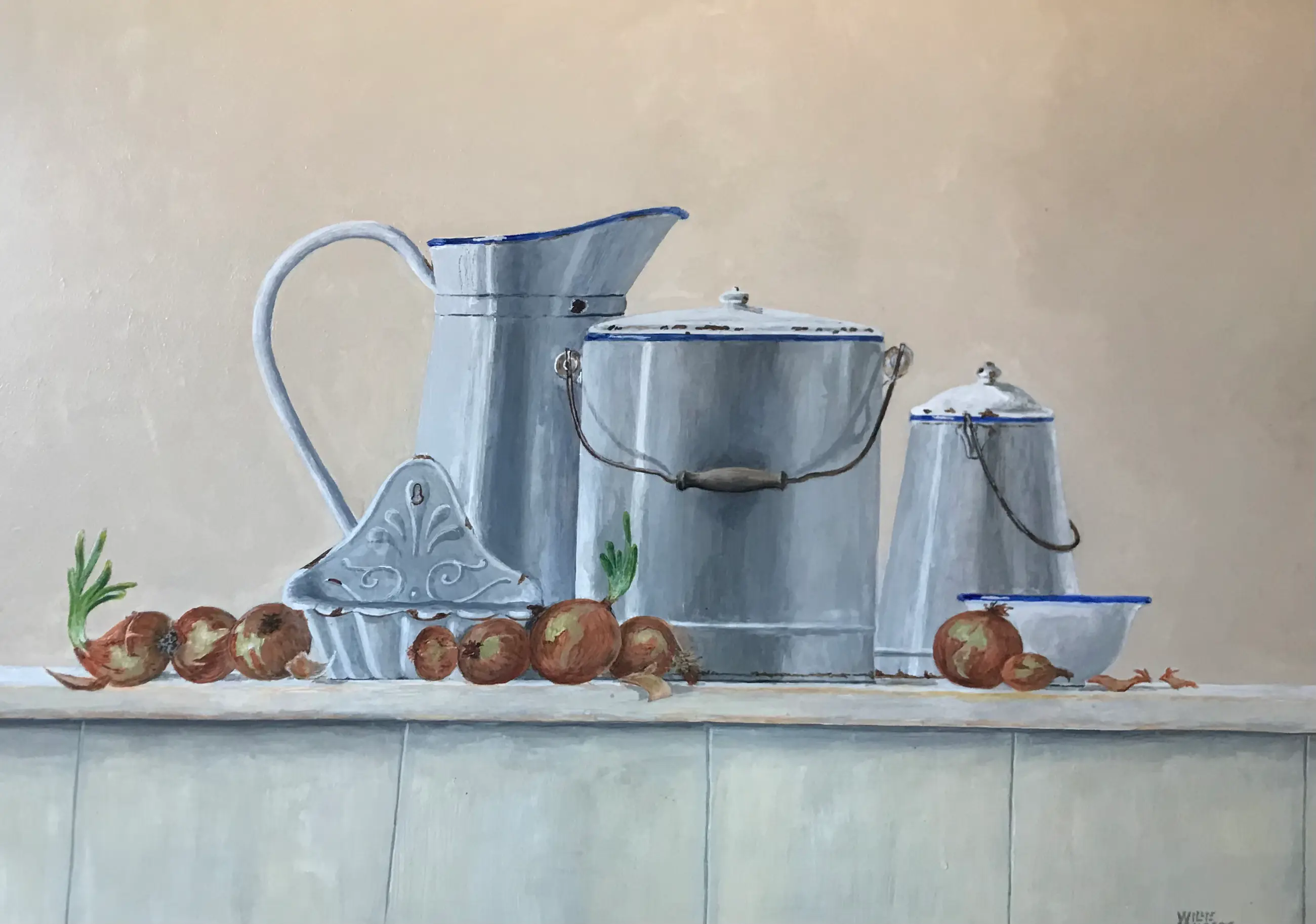 Wit emaille pannen en kan, enigszins met een beetje roest. Met blauw randje.Aangevuld met uien.