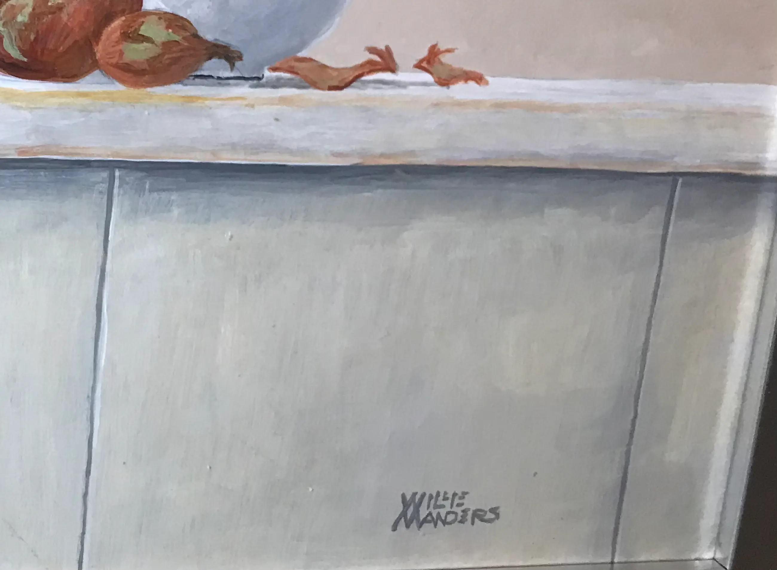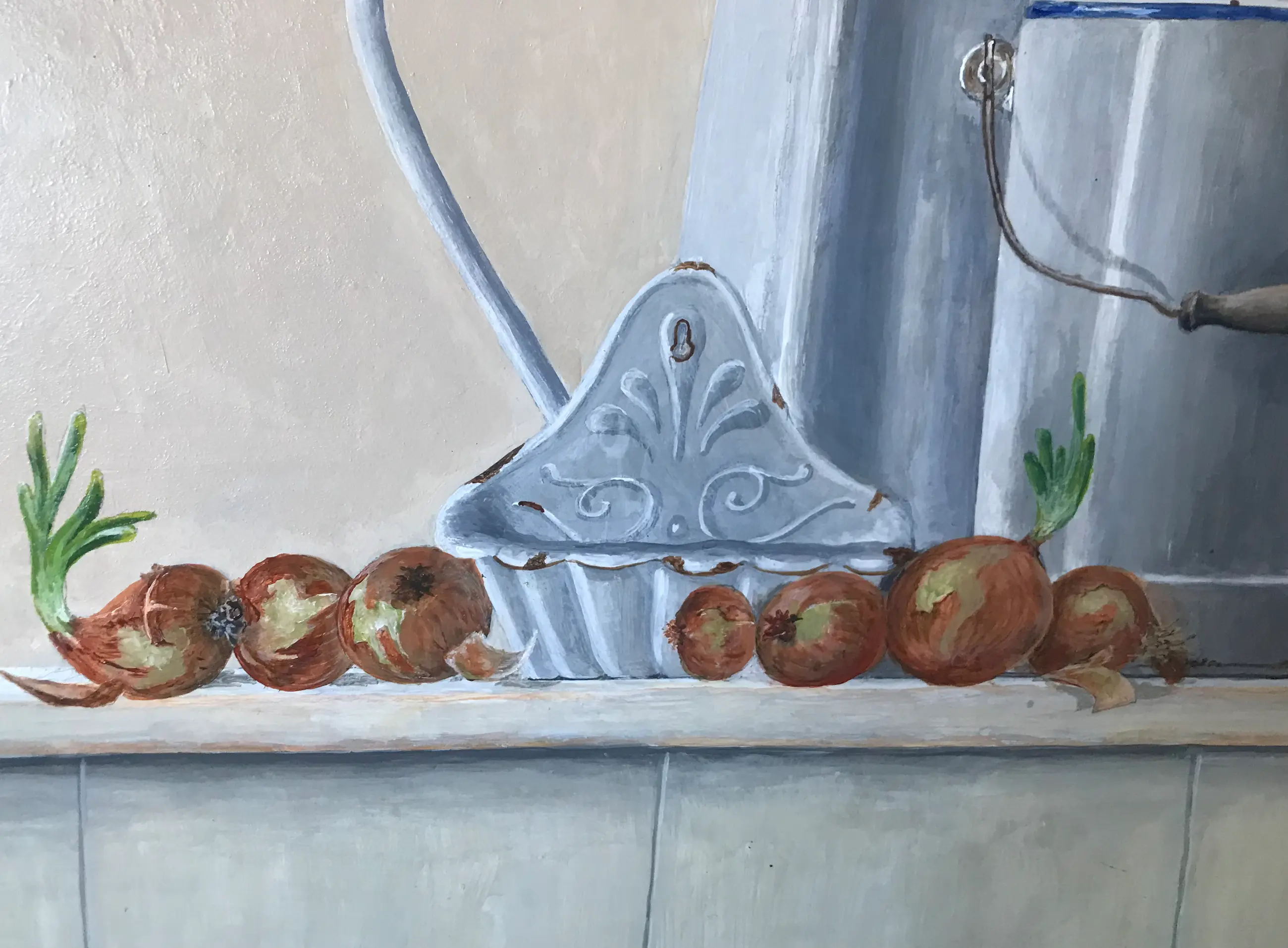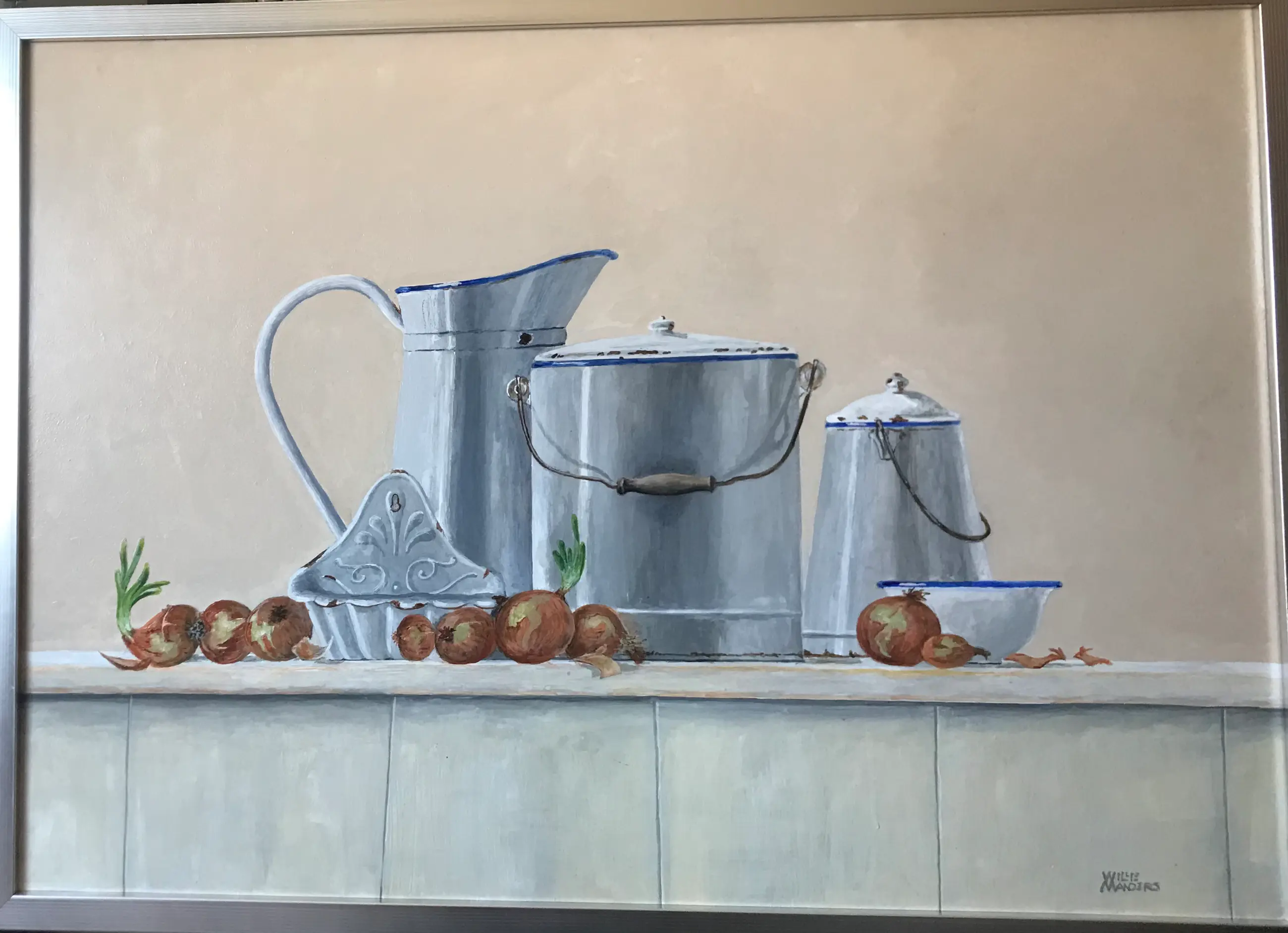 Wit emaille pannen en kan, enigszins met een beetje roest. Met blauw randje.Aangevuld met uien.