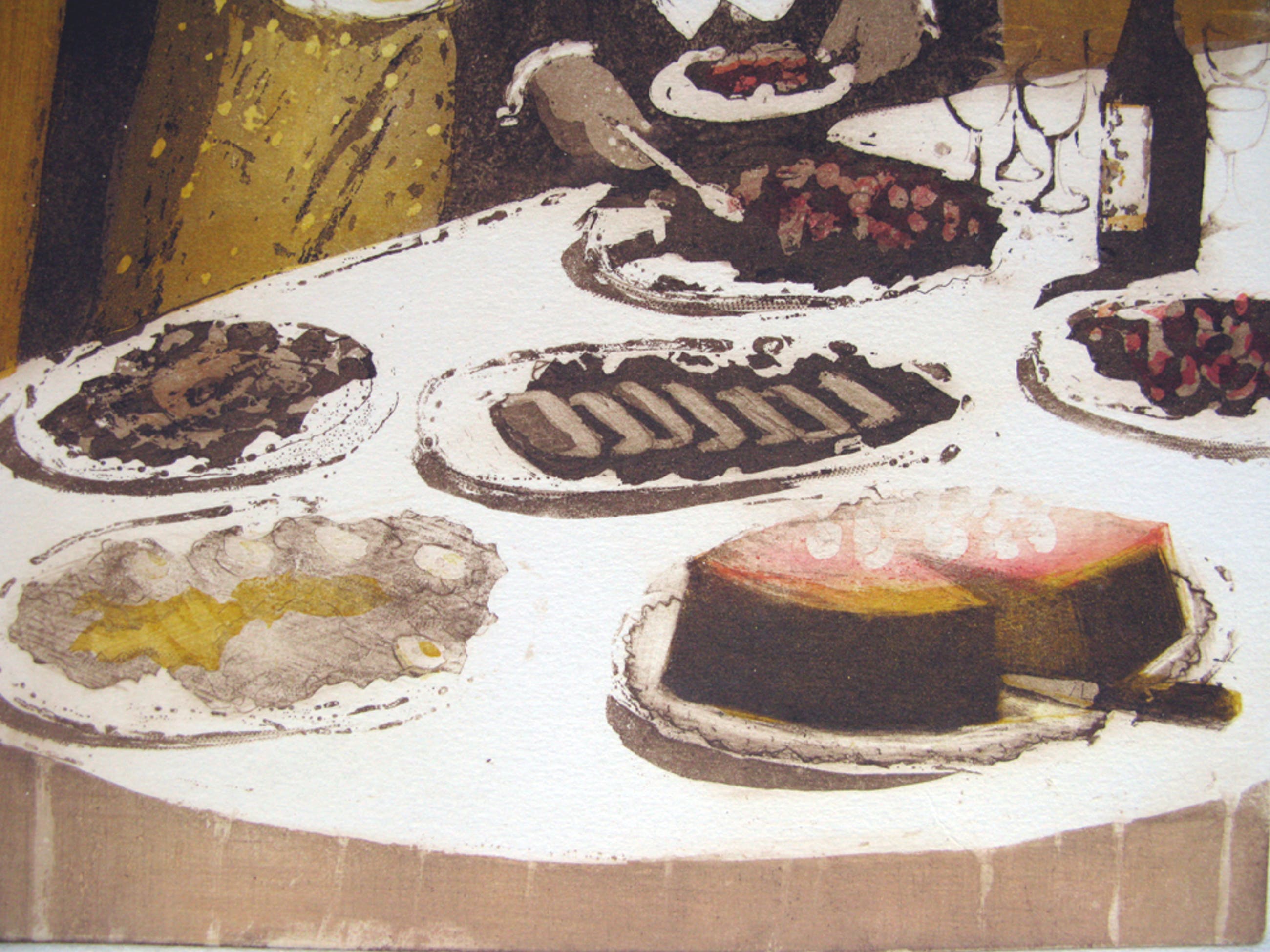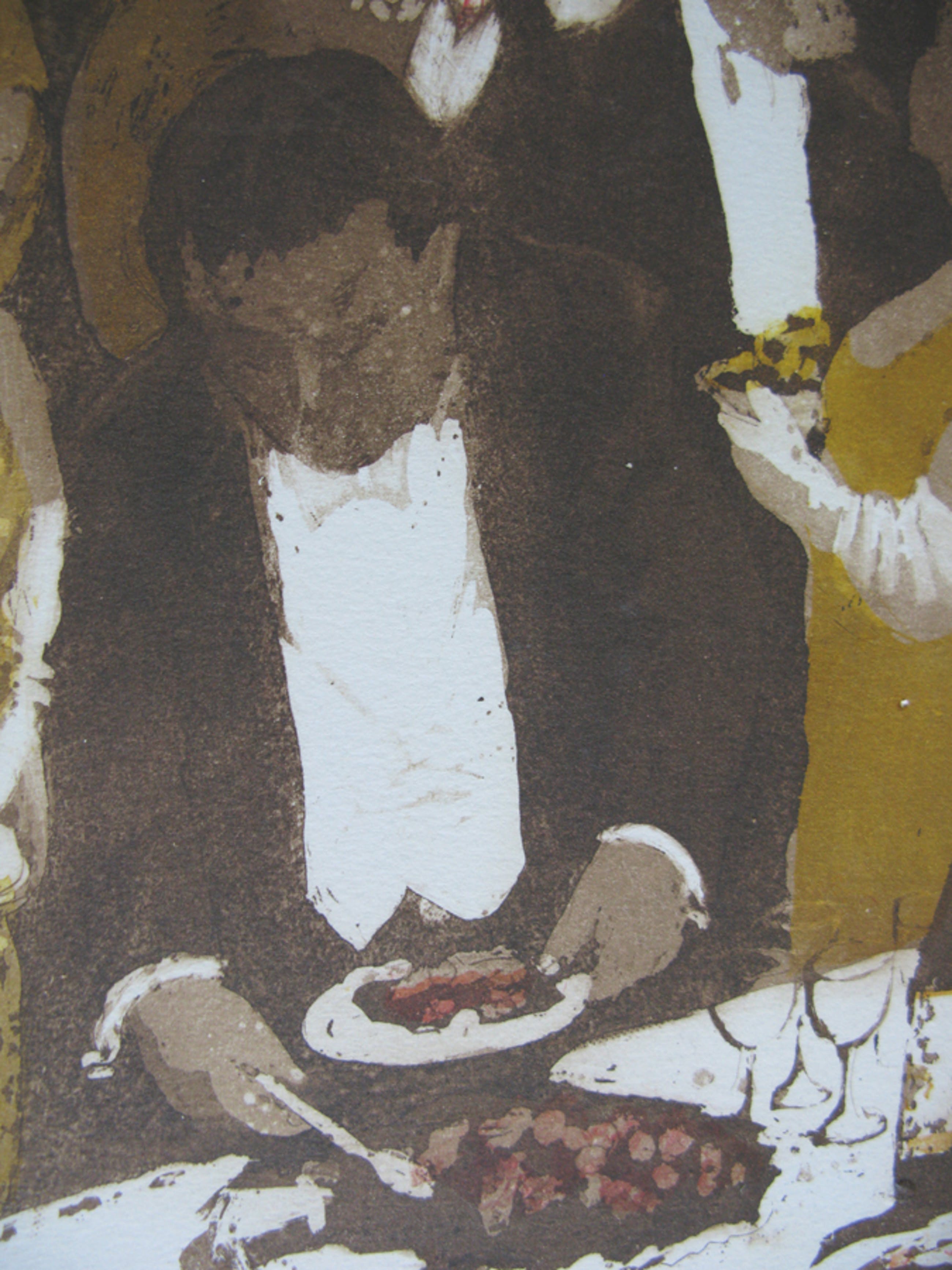 Zezullen er smakelijk van eten, het gaat er deftig aan toe. De afmeting van het werk betreft het gehele blad, de afmeting van de afbeelding is 35 x 25.