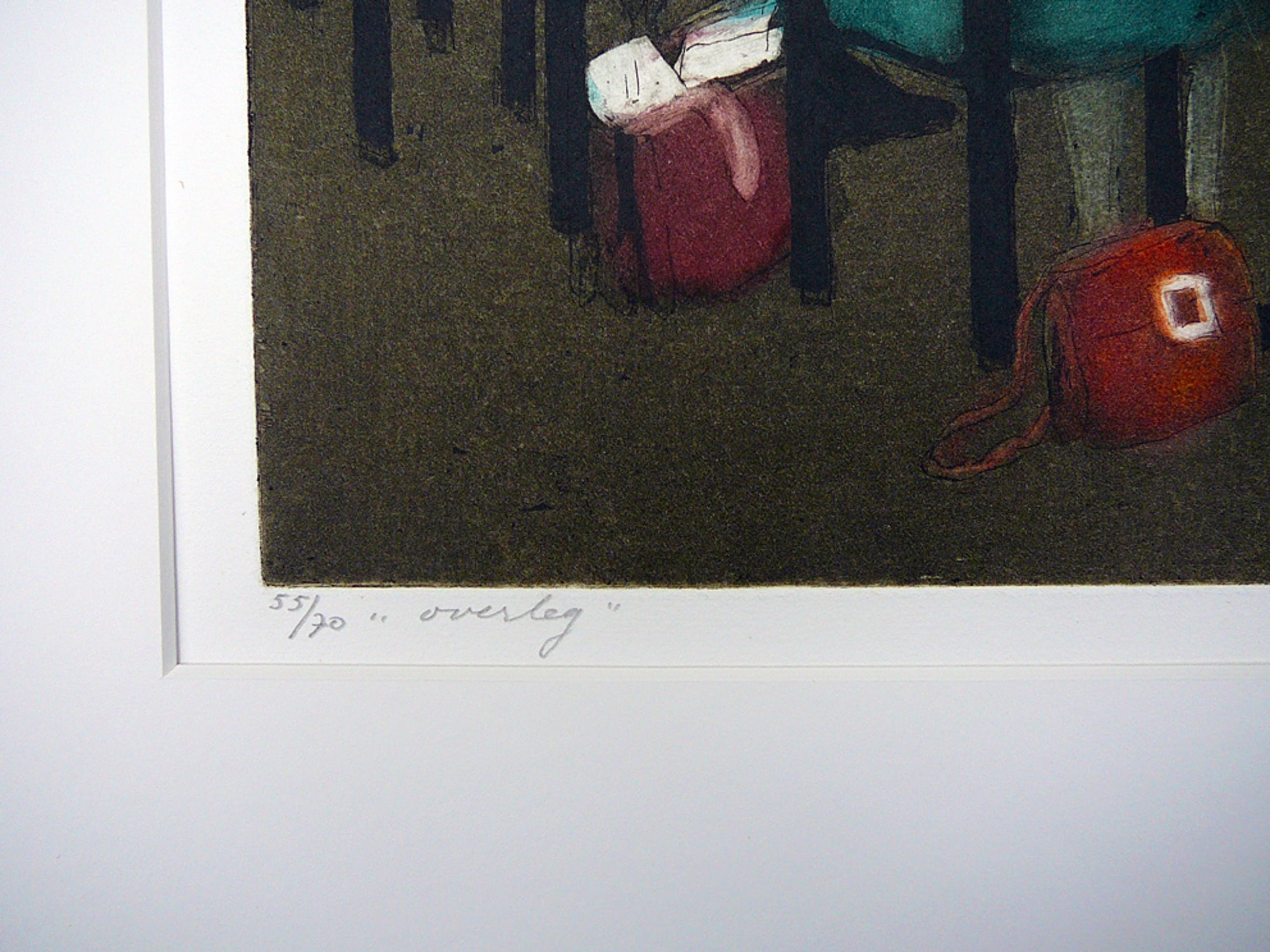 Gekleurde ets van Willy Belinfante. Titel: Overleg. Genummerd 55/70. Het werk is rechtsonder gesigneerd door de kunstenaar.