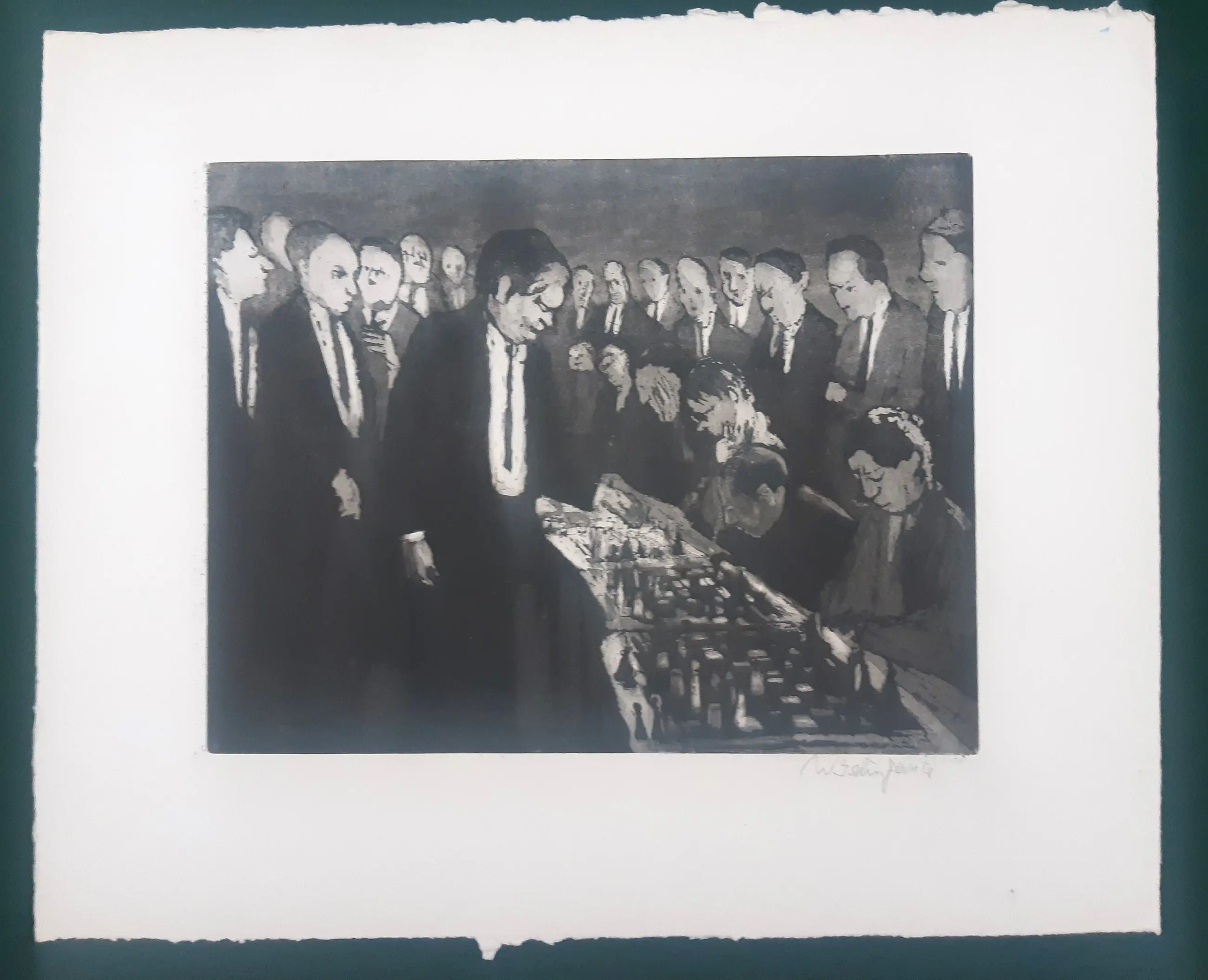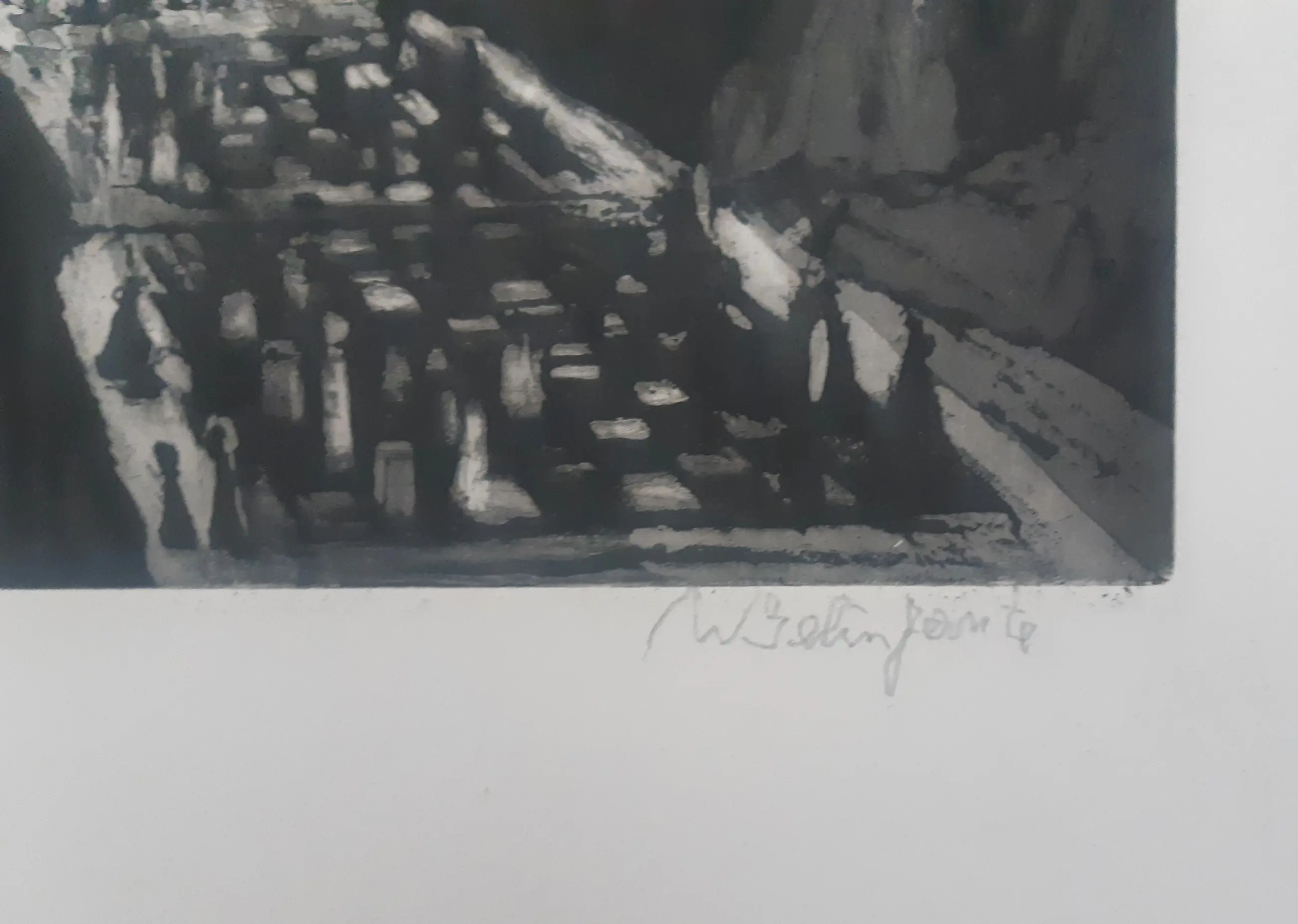 Ets/aquatint van Willy (Wies) Belinfante, met potlood door de maker gesigneerd. De afbeelding is 23 x 30 cm. De ets verkeert in nieuwstaat, is nooit ingelijst geweest.