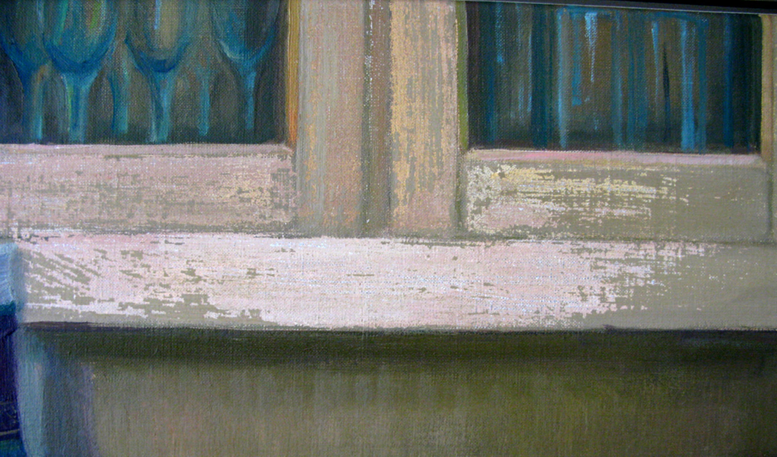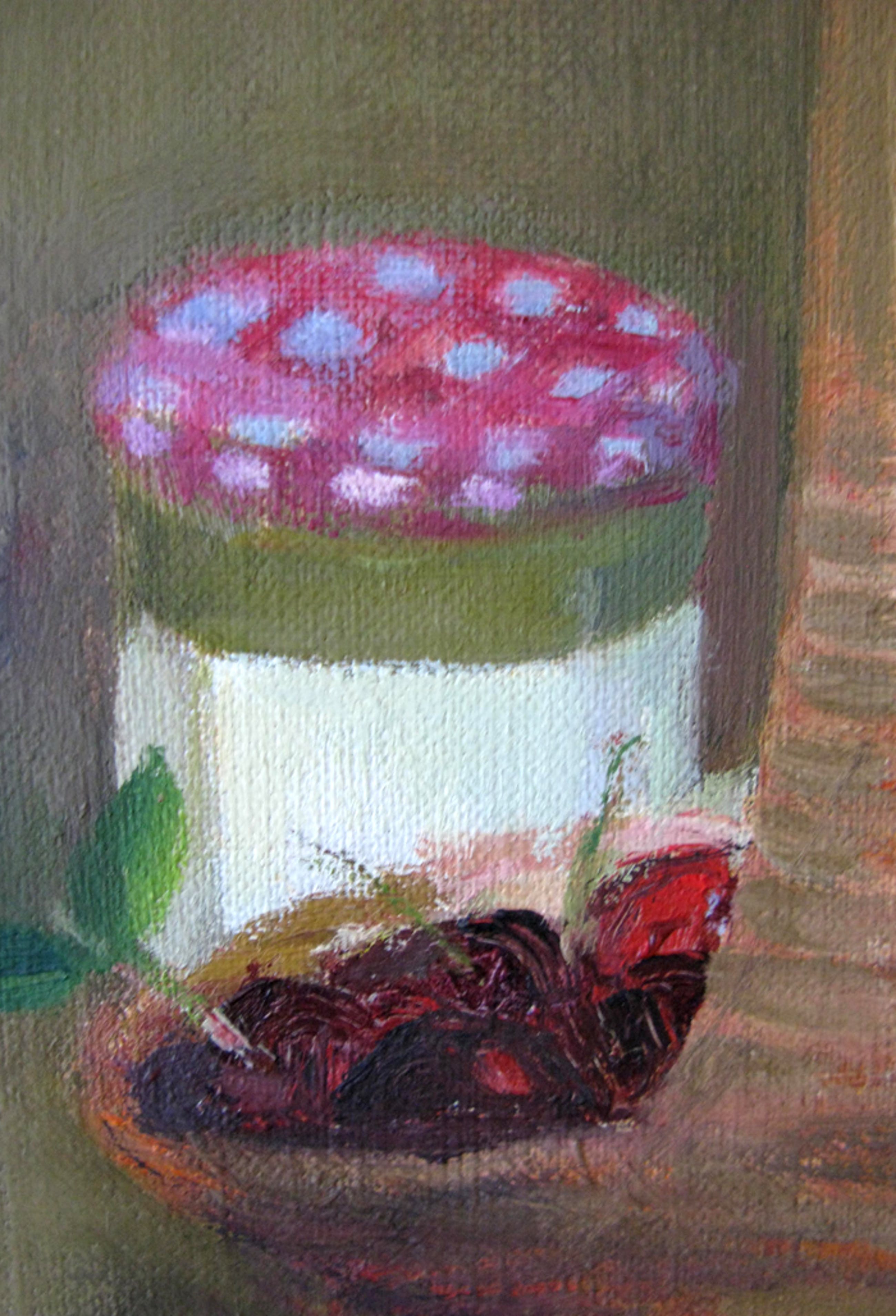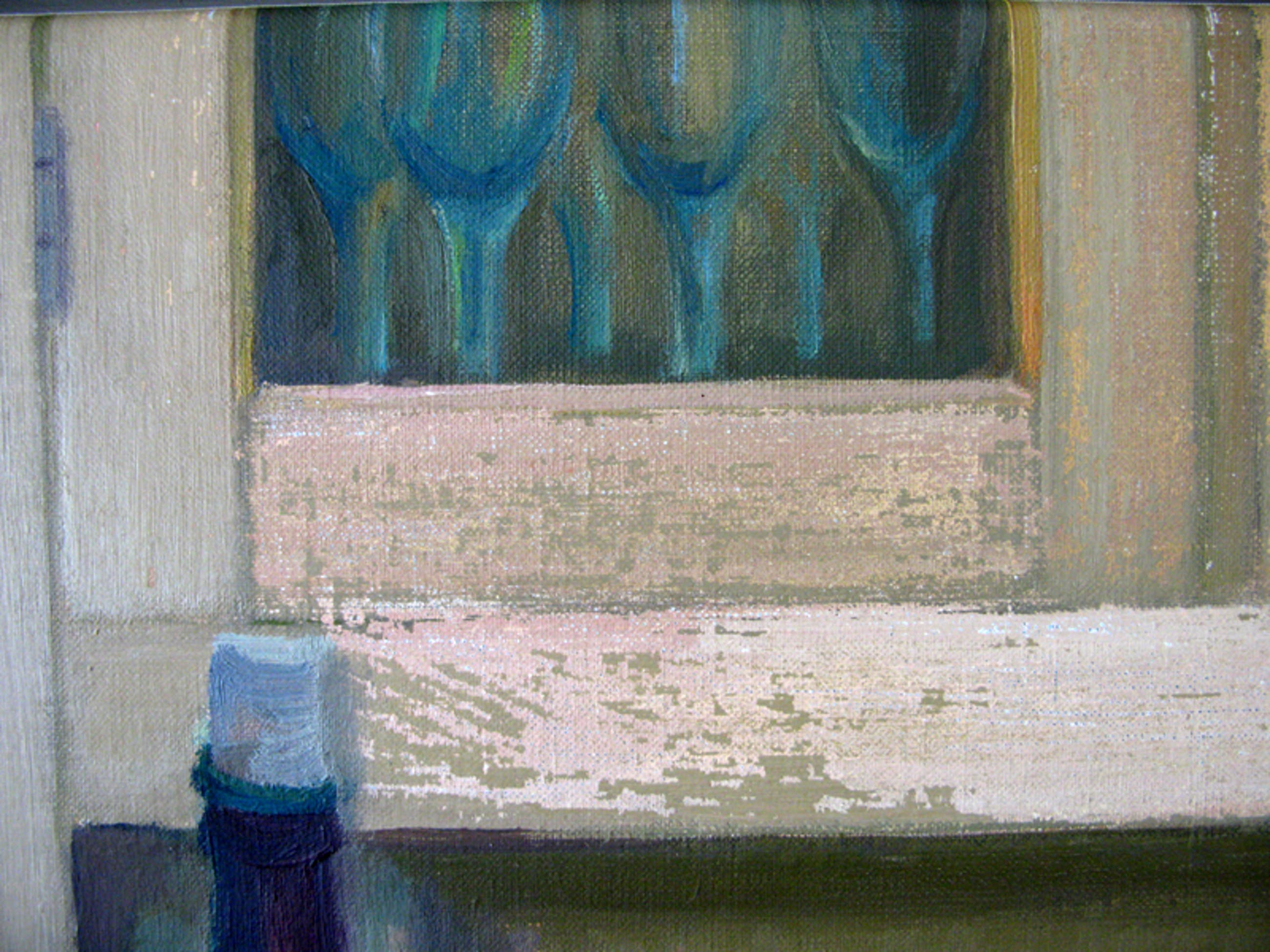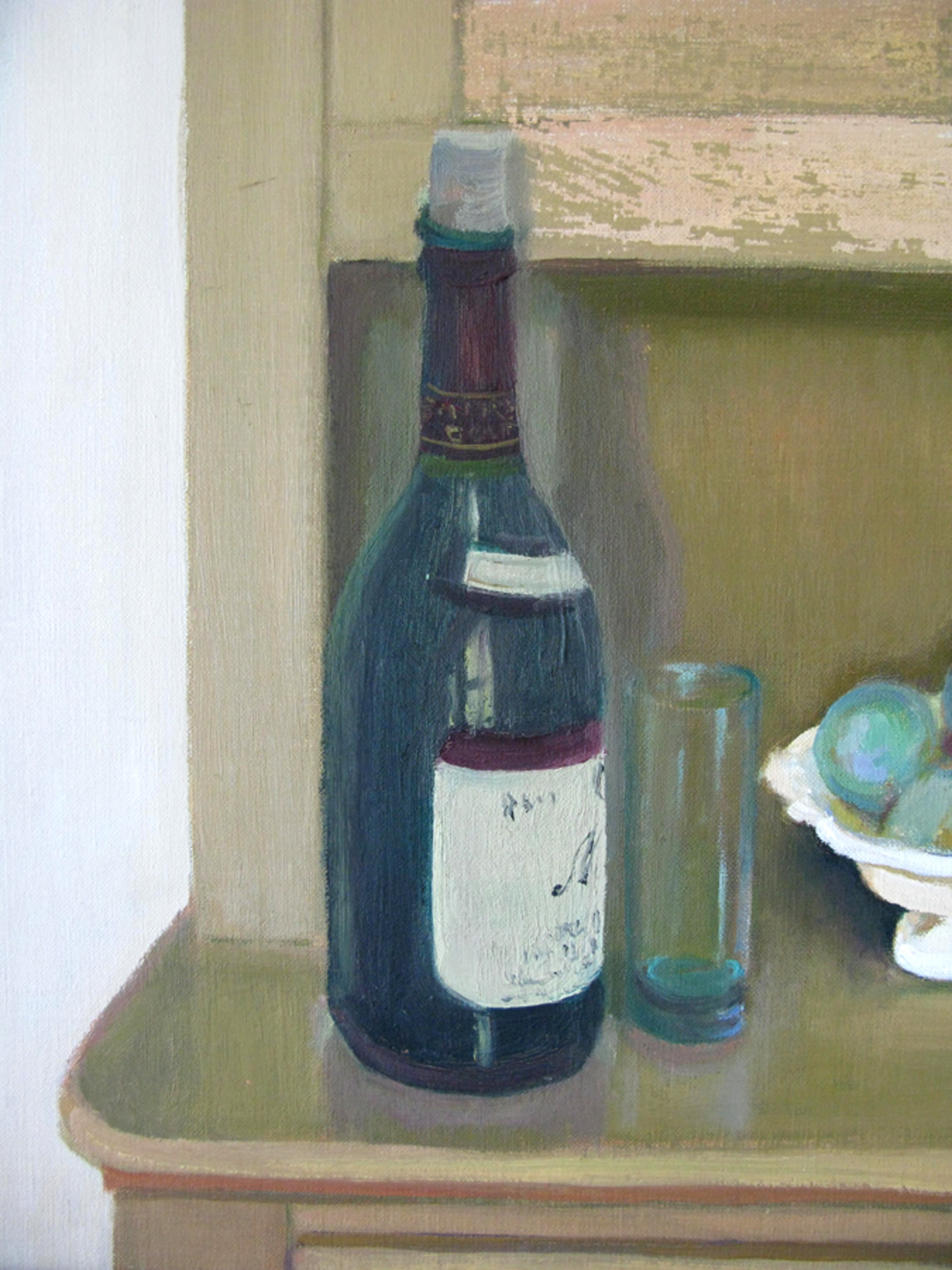 Dit stilleven ademt overduidelijk een Franse sfeer, het geliefde verblijfsland van de kunstenares. Door het gebruik van contrasterende verf heeft de kunstenaar de ouderdom en gebruik van de kast benadrukt (zie detail-afbeeldingen). De herkomst van het schilderstuk is uit het atelier van de kunstenaar. De conditie is uitstekend.