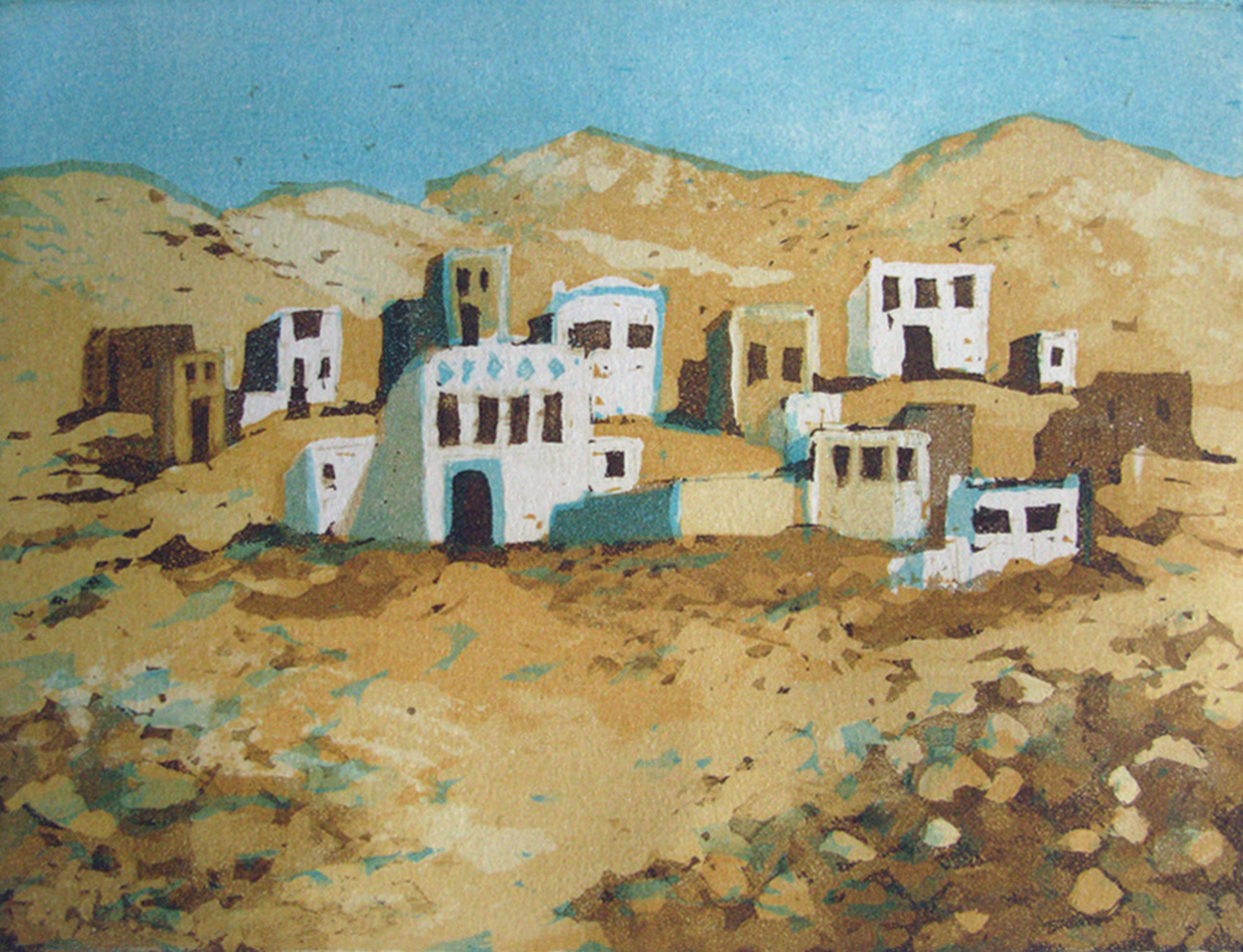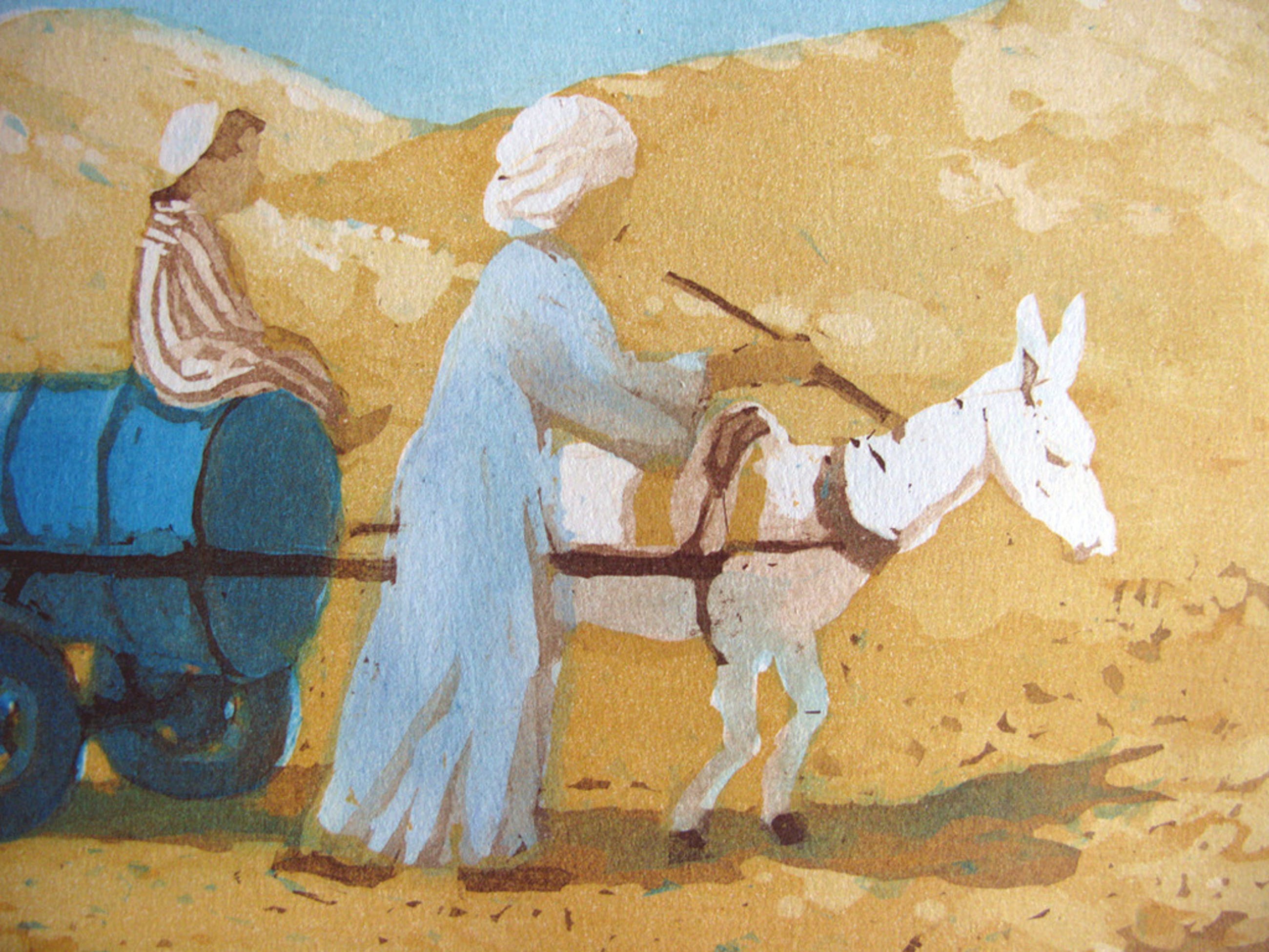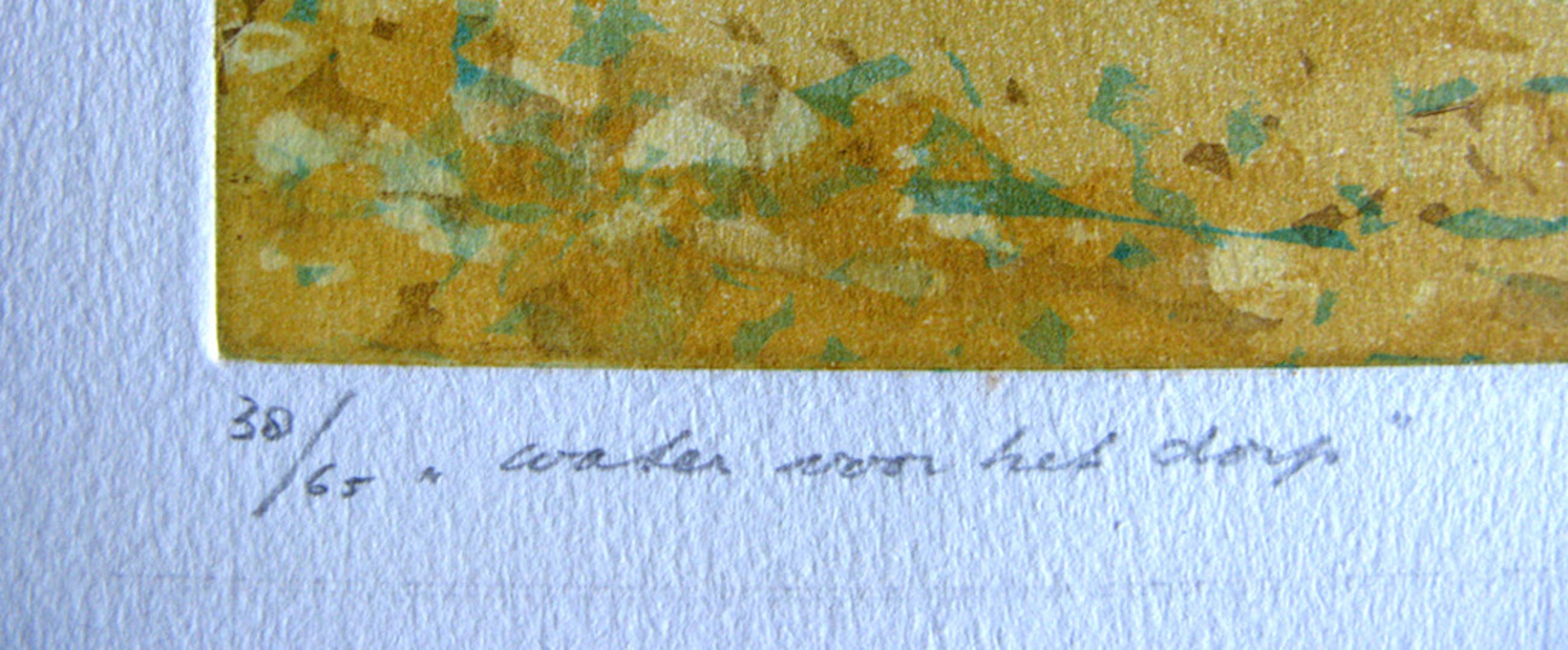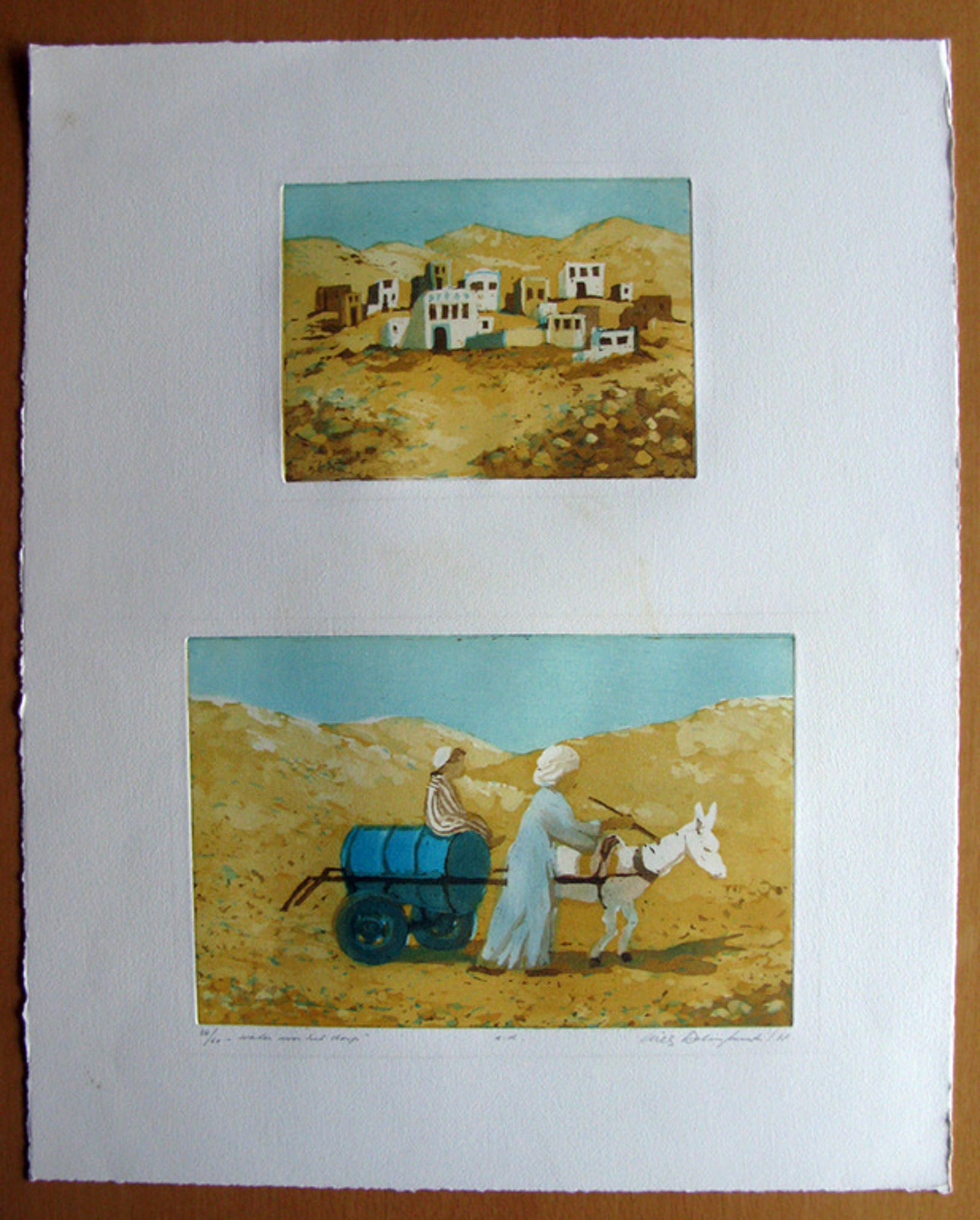 Twee etsen op één blad. De onderste afbeelding (afmeting 16 x 24) toont het vervoer van het water en de bovenste afbeelding (afmeting 12 x 16) het dorp. De afmeting van het gehele blad is 48 x 37. De kunsternaar heeft onder de onderste afbeelding titel, oplage en handtekening geplaatst. De afdruk van beide kleuretsen is zeer geslaagd. Rond beide afbeeldingen is een nauwelijks waarneembare rand van het passe-partout waarin de ets was geplaatst zichtbaar, de conditie is daarom goed te noemen. De ets is uit 1988 en wordt zonder lijst aangeboden. De verzending is aangetekend.