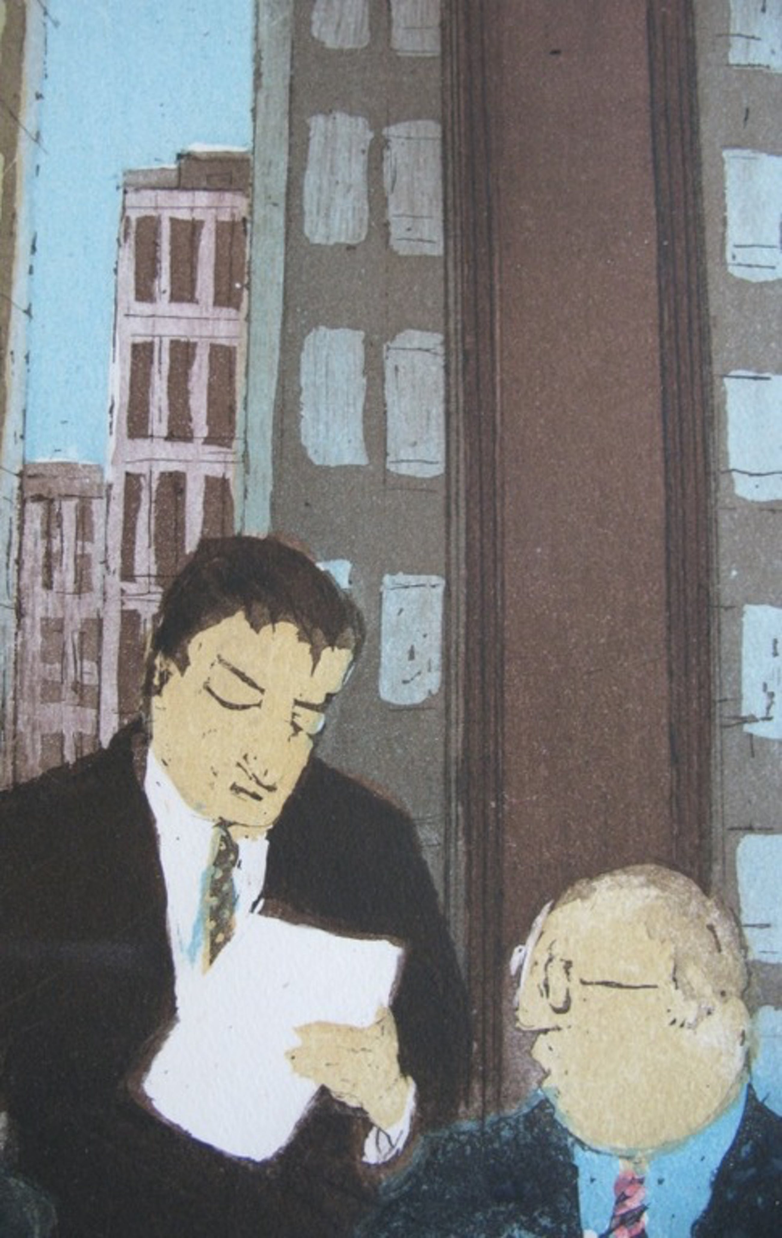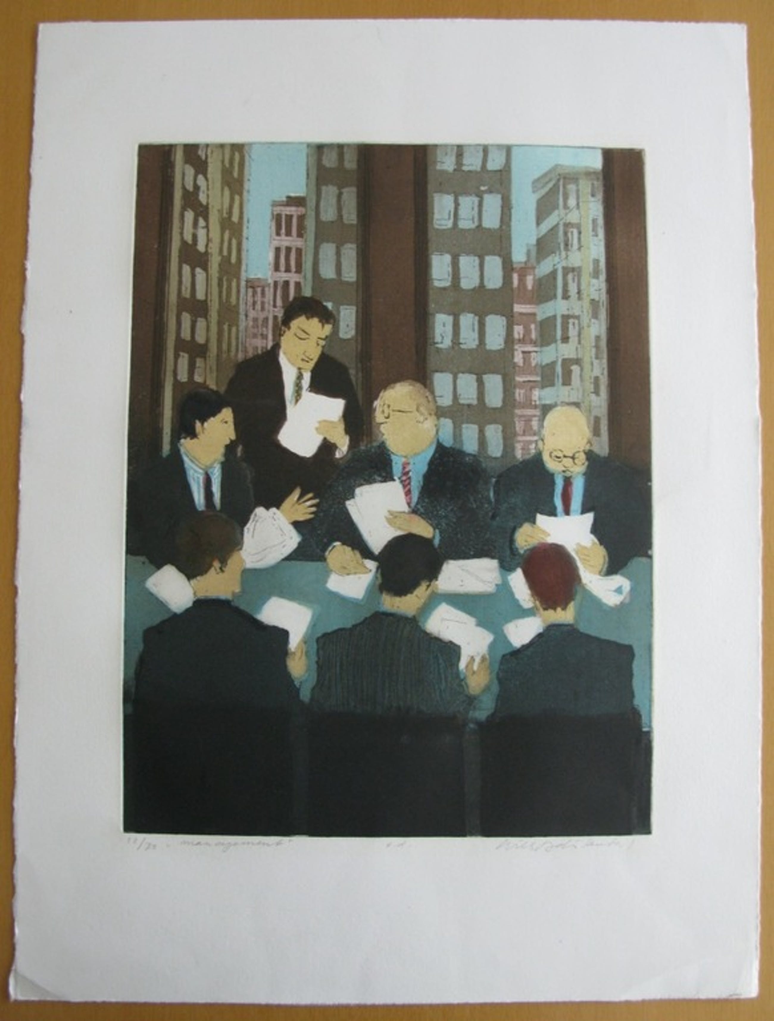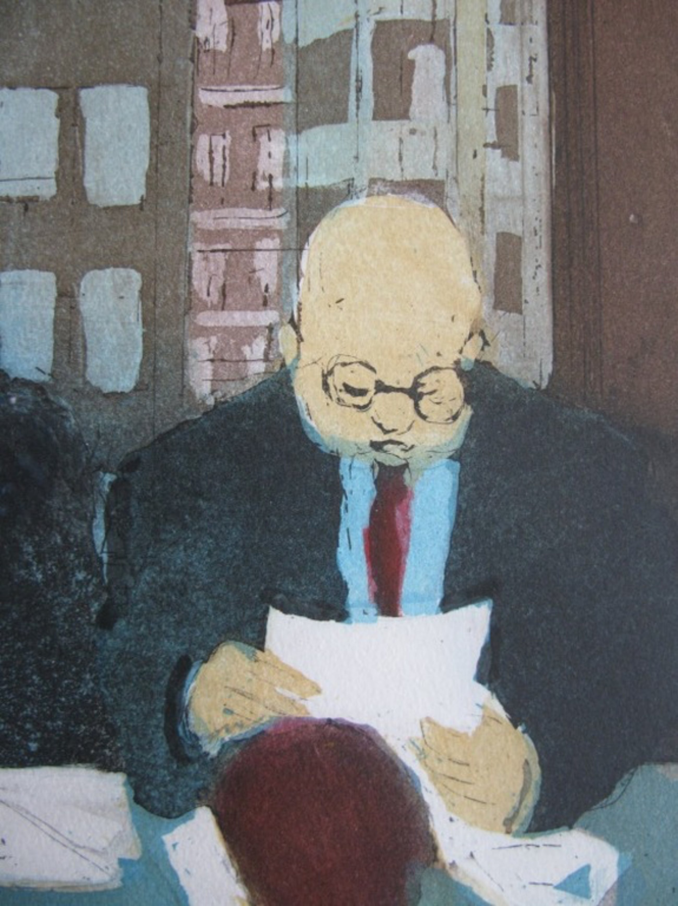 "Als u de stukken even goed nakijkt, dan kunnen wij een besluit nemen". Je hoort het ze zeggen op deze kleurets. De afbeelding meet 40 x 30 en de afmeting van het gehele blad is 57 x 42. De ets is door de kunstenaar van titel, oplage 13/75 en handtekening voorzien. Voor een bedrag van € 10 wordt het kunstwerk goed verpakt bij PostNL aangeboden voor een aangetekende verzending. Deze kosten zijn voor rekening van de koper.