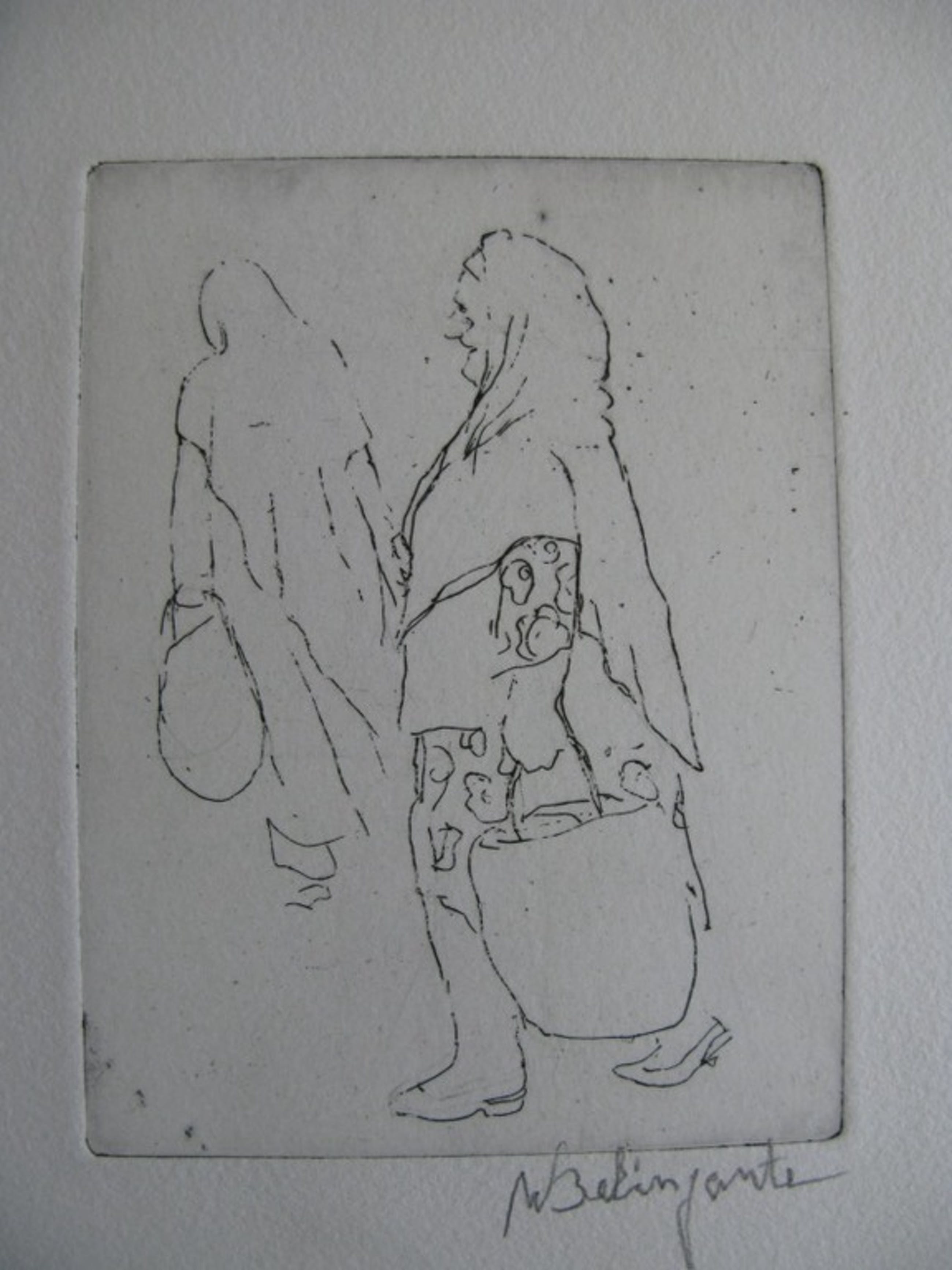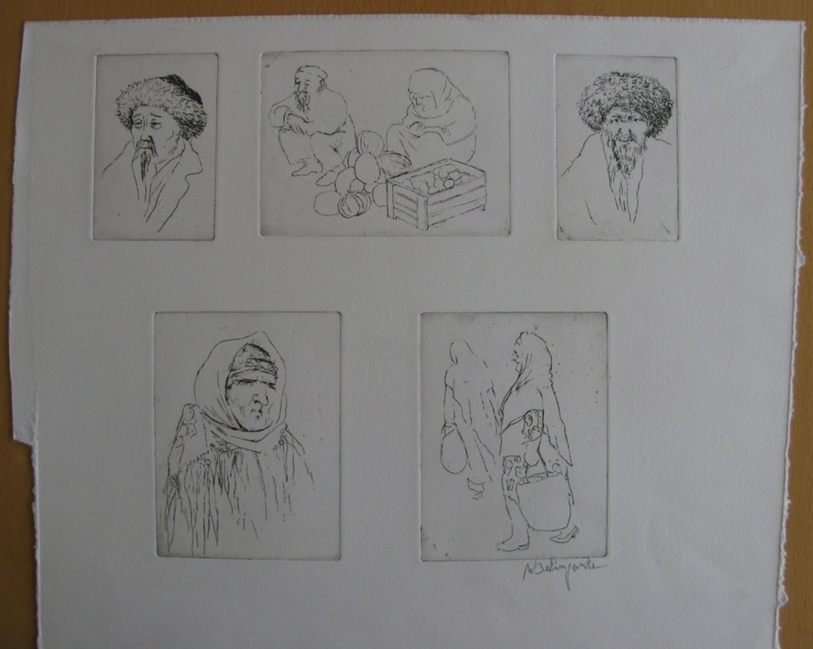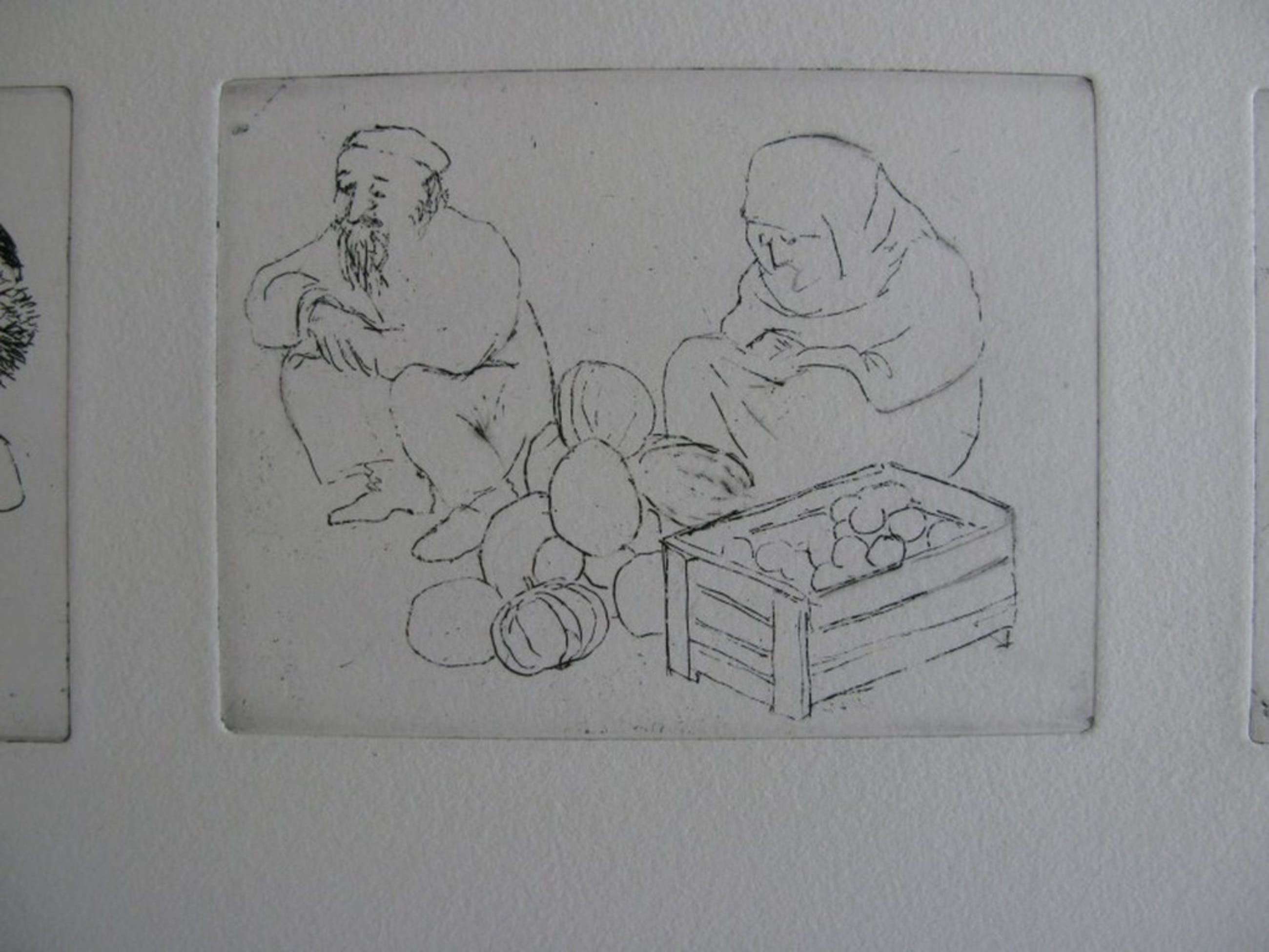 Vijf afbeeldingen op één blad met een volledige afmeting van 31 x 37. Afmetingen van de etsen op de bovenste rij links 9 x 6, middelste 9 x 12 en rechts 9 x 6. Afmeting van de twee etsen op de onderste rij 12 x 9 elk. Het blad is door de kunstenaar gesigneerd, de handtekening is duidelijk later geplaatst. Het blad is aan de linker- en onderzijde niet zorgvuldig afgesneden. Voor een bedrag van € 10 wordt dit blad goed verpakt aangeboden bij PostNL voor een aangetekende verzending binnen Nederland.