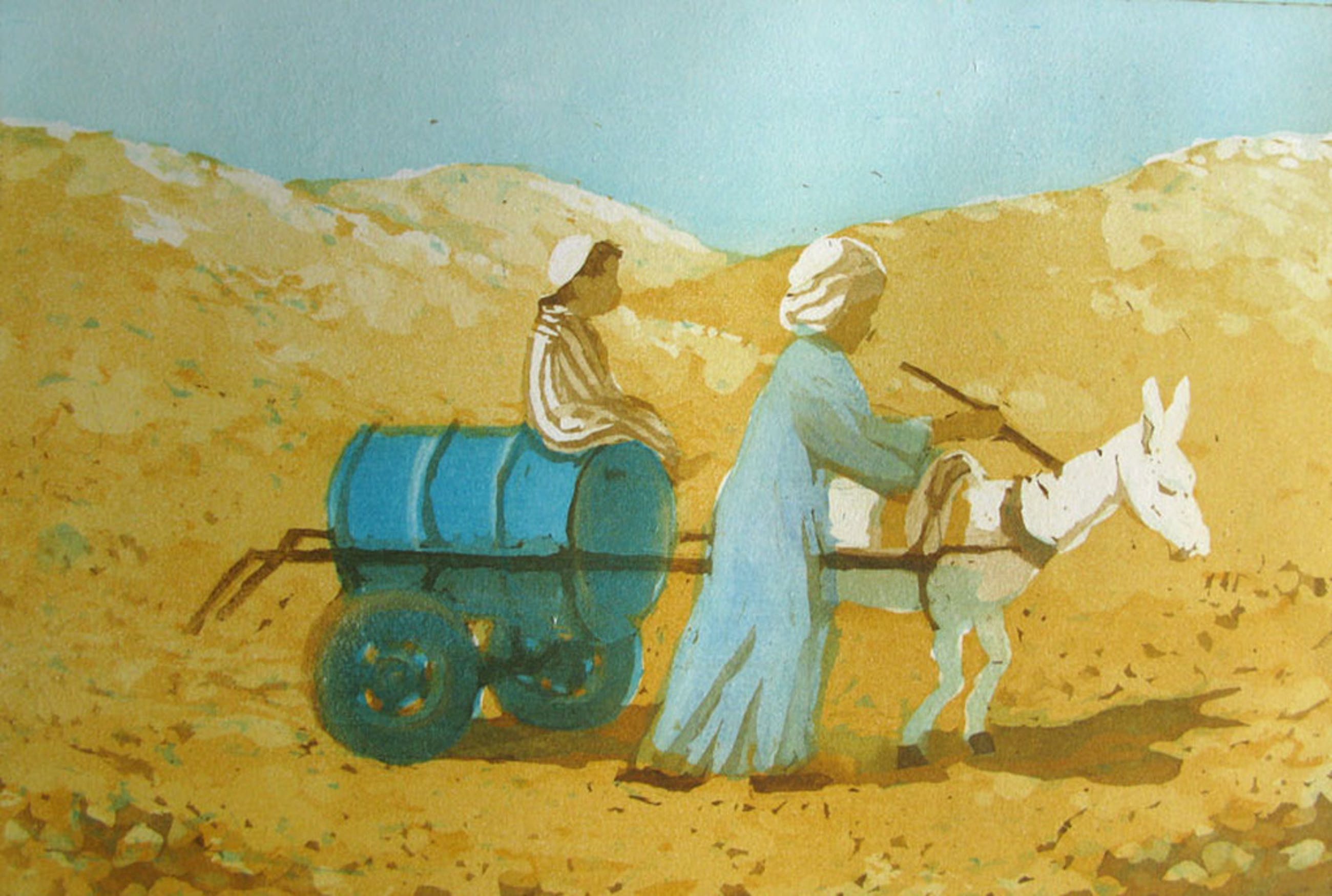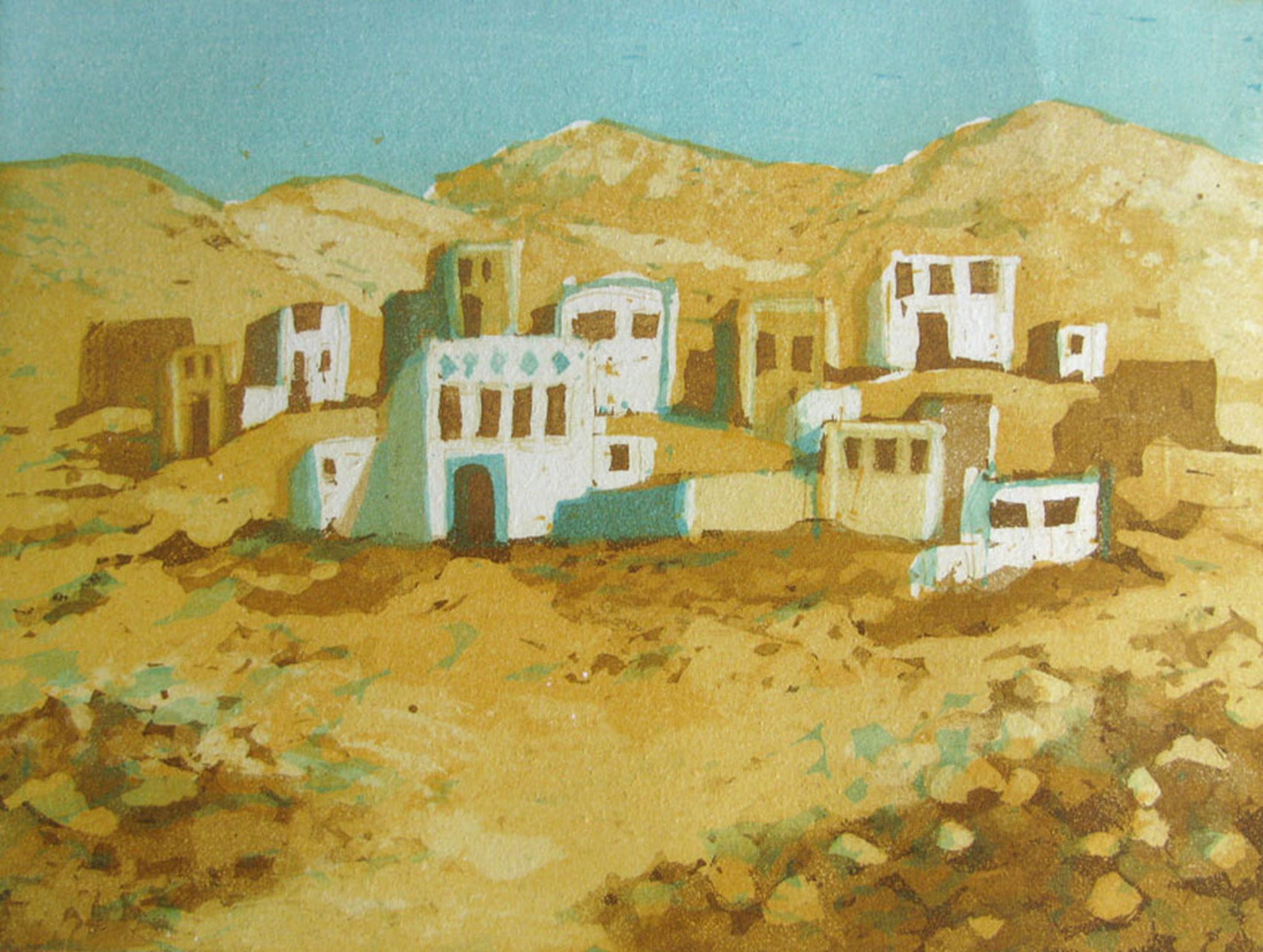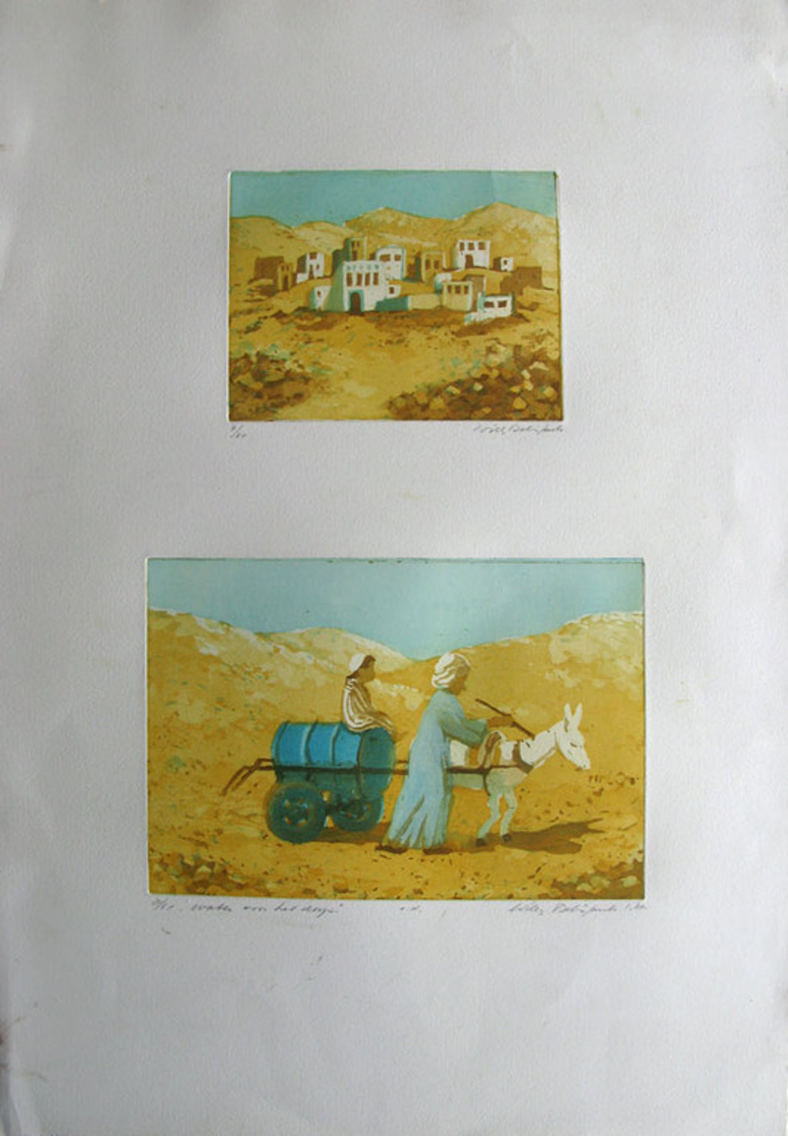 Twee afbeeldingen op één blad (afmeting 56 x 40). Op de ene afbeelding staat het dorp (12 x 16) en op de andere afbeelding zijn de "waterbrengers" afgebeeld (16 x 24). Beide afbeelding zijn met potlood gesigneerd en van oplage 8/65 voorzien. Bij de afbeelding van de "Waterbrengers" is de titel vermeld. Het jaartal is 1988. Voor een bedrag van € 10 wordt het werk goed verpakt via PostNL aangetekend binnen Nederland verzonden. Deze kosten zijn voor rekening van de koper.