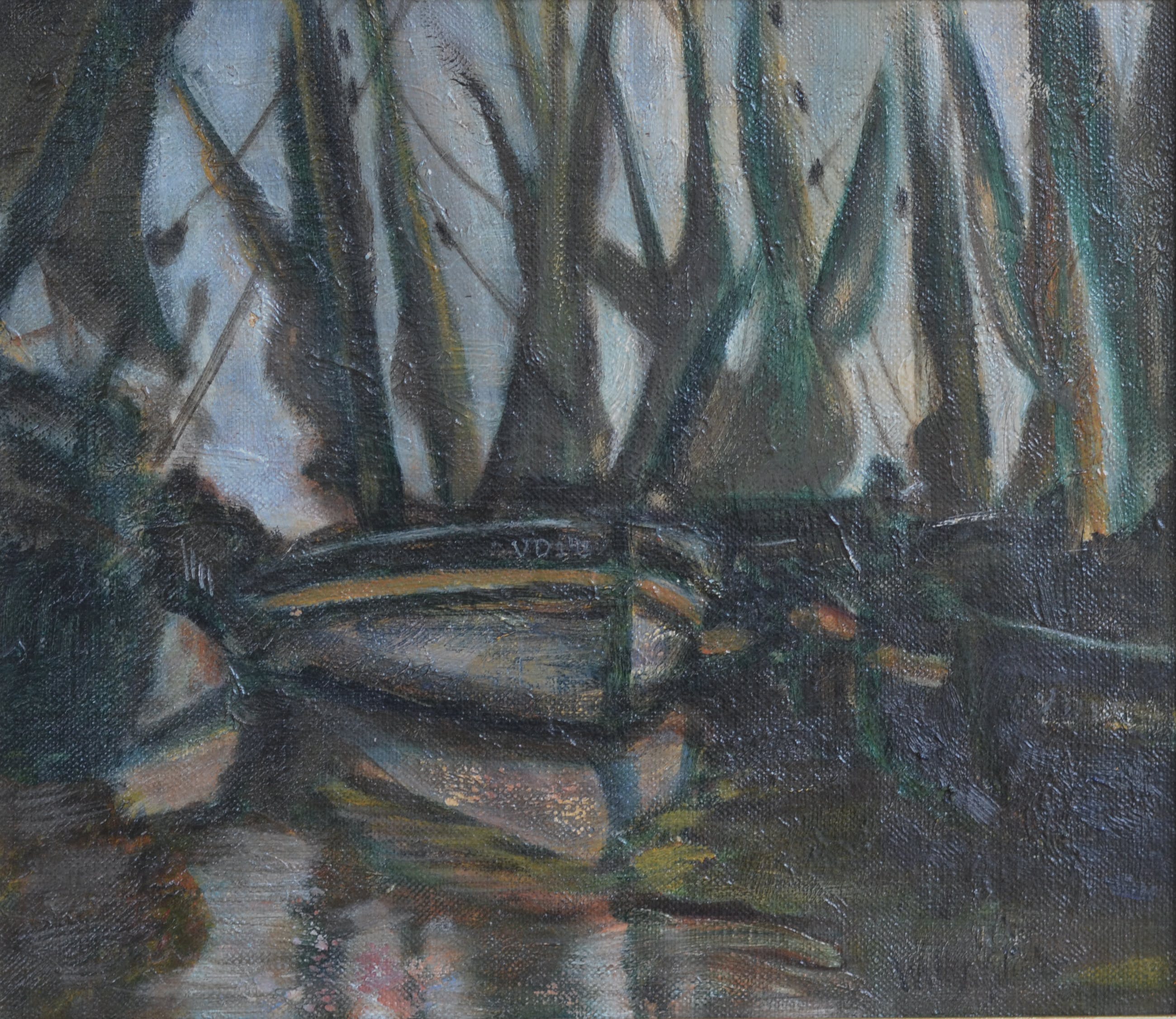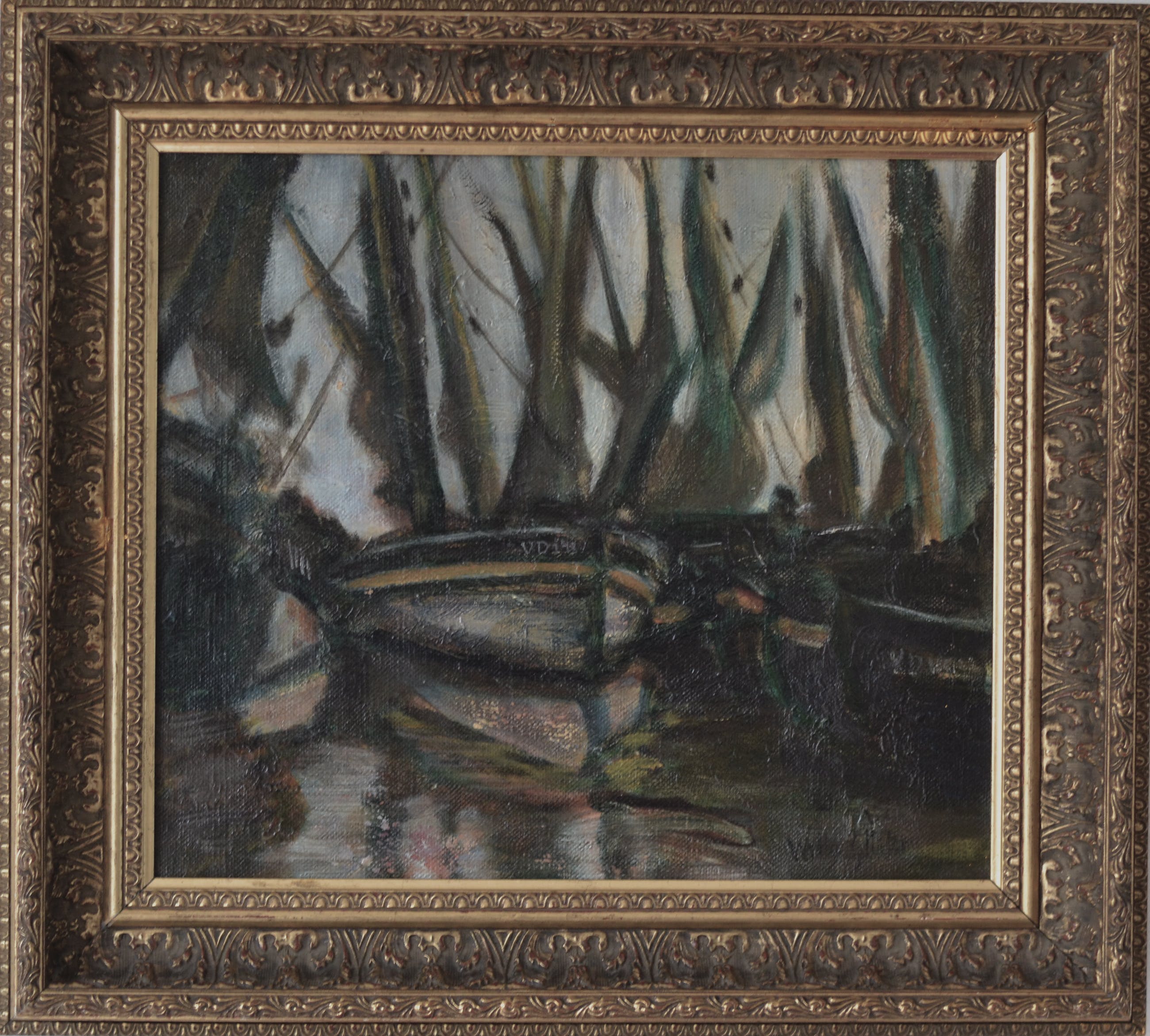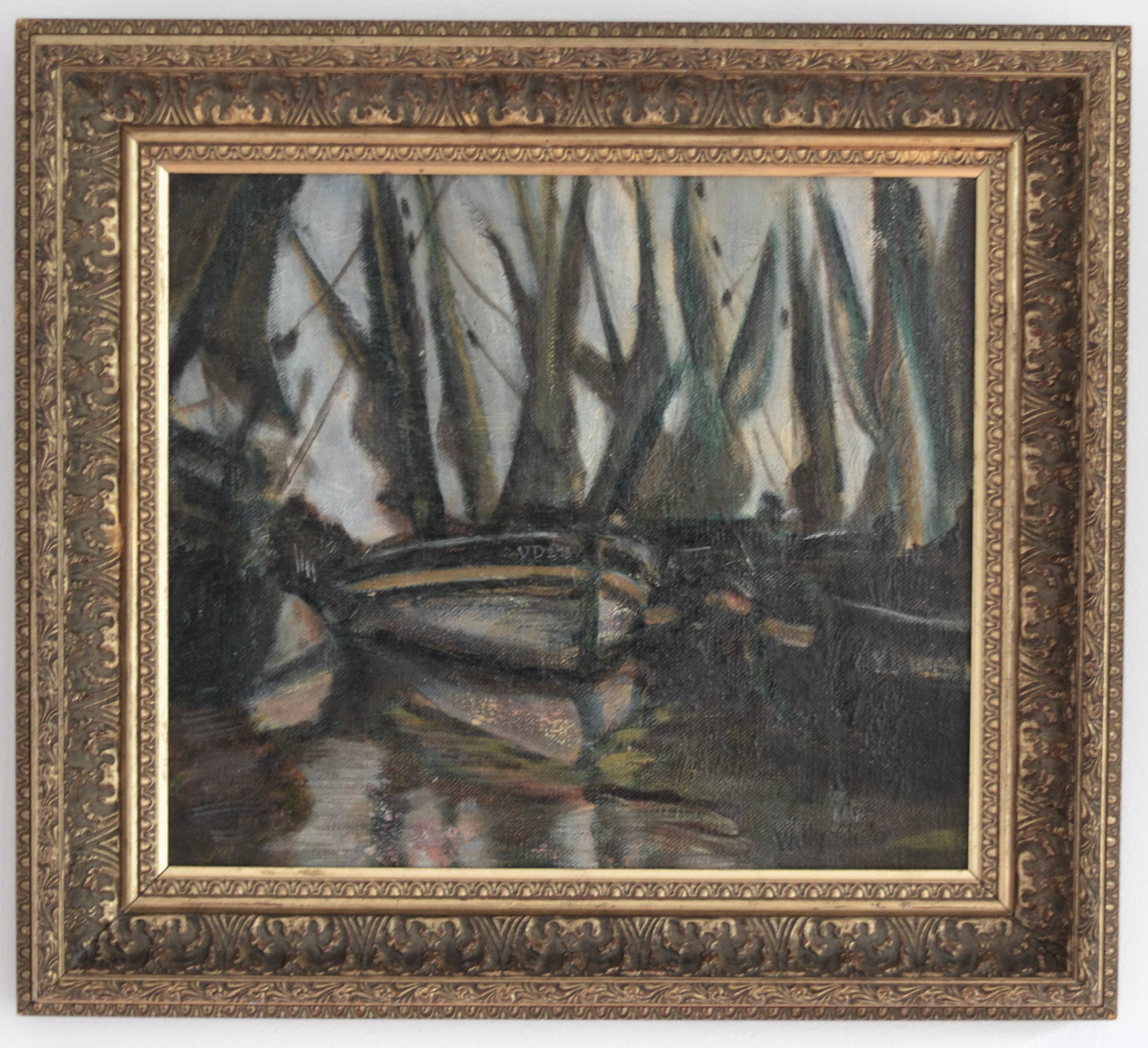 Gekocht bij een veiling met titel "Bootje tussen bomen", maar ik houd het op bootjes met masten/zeilen.