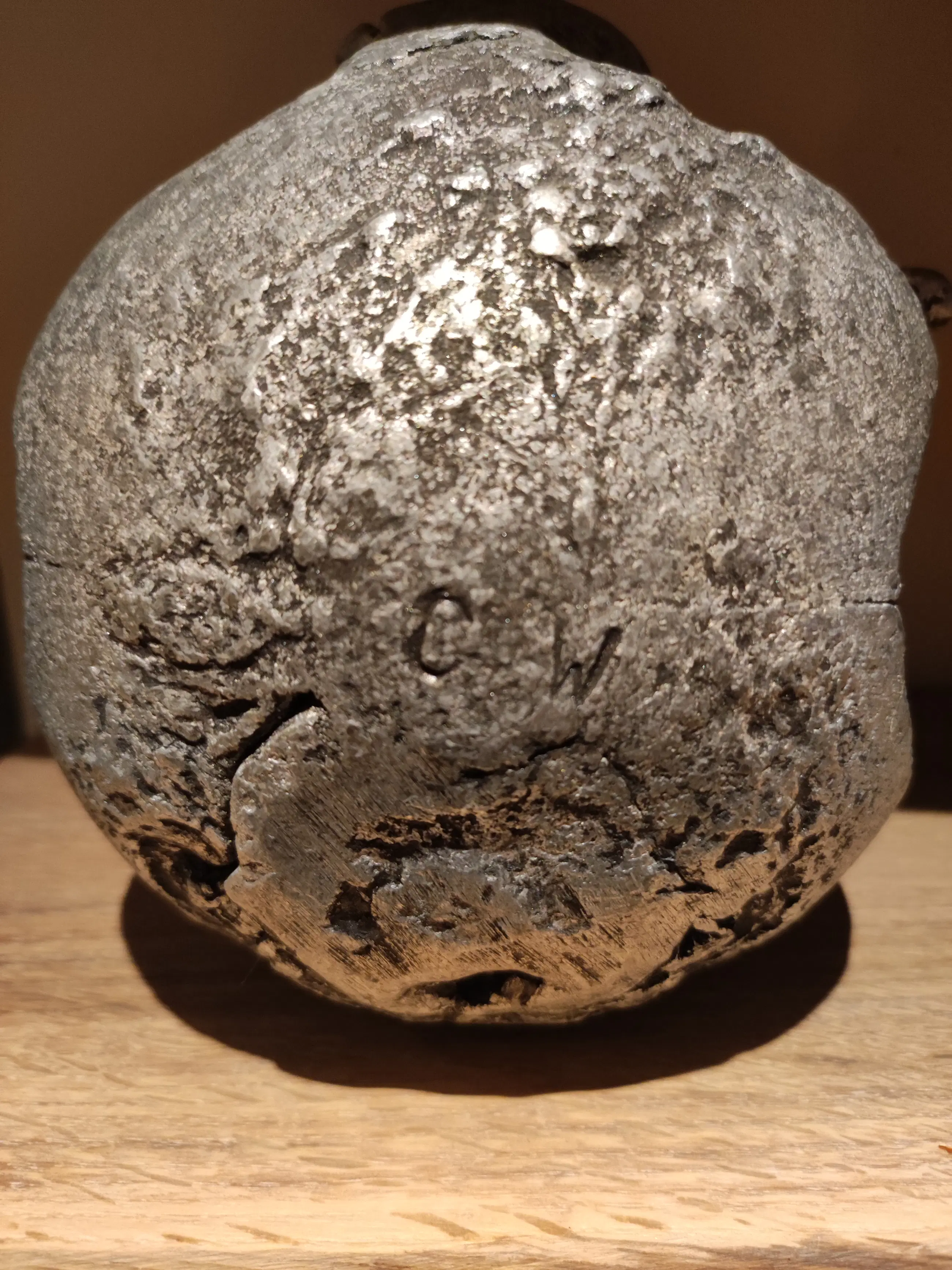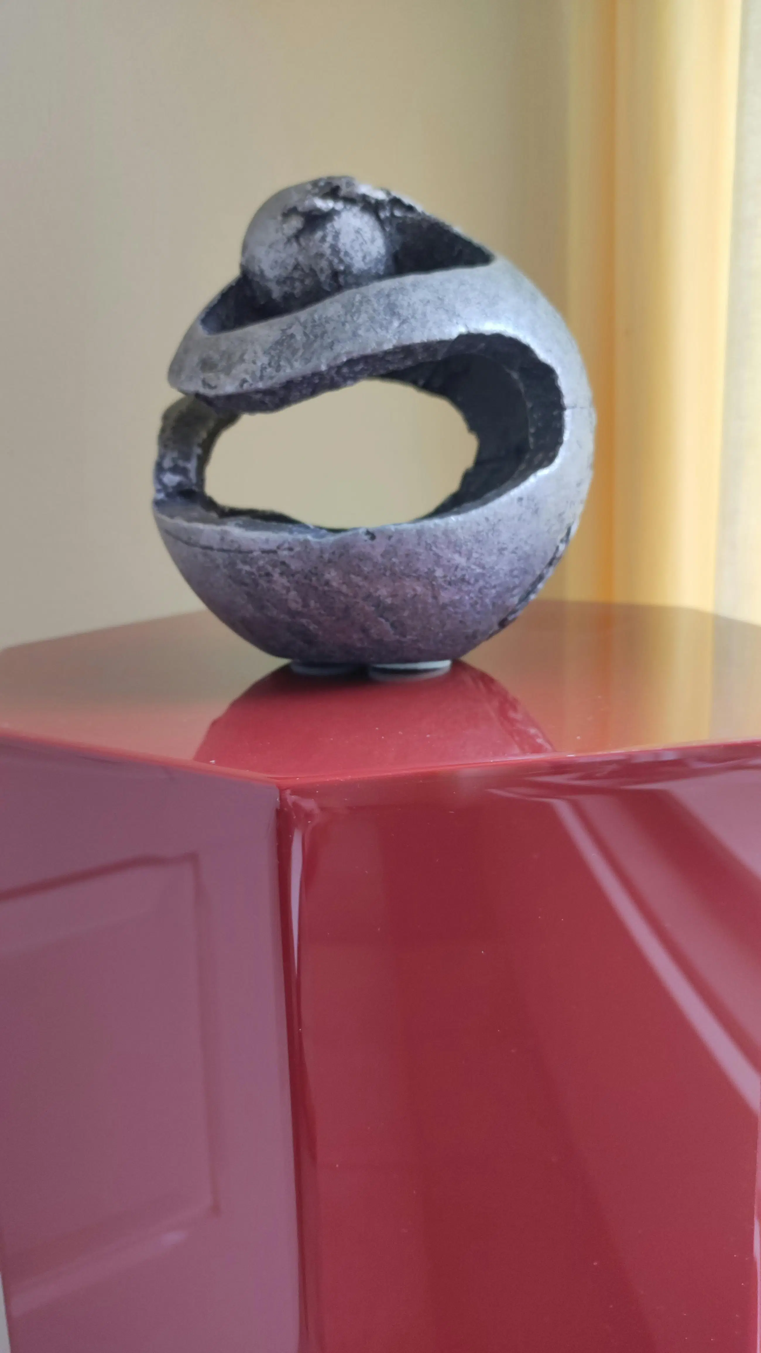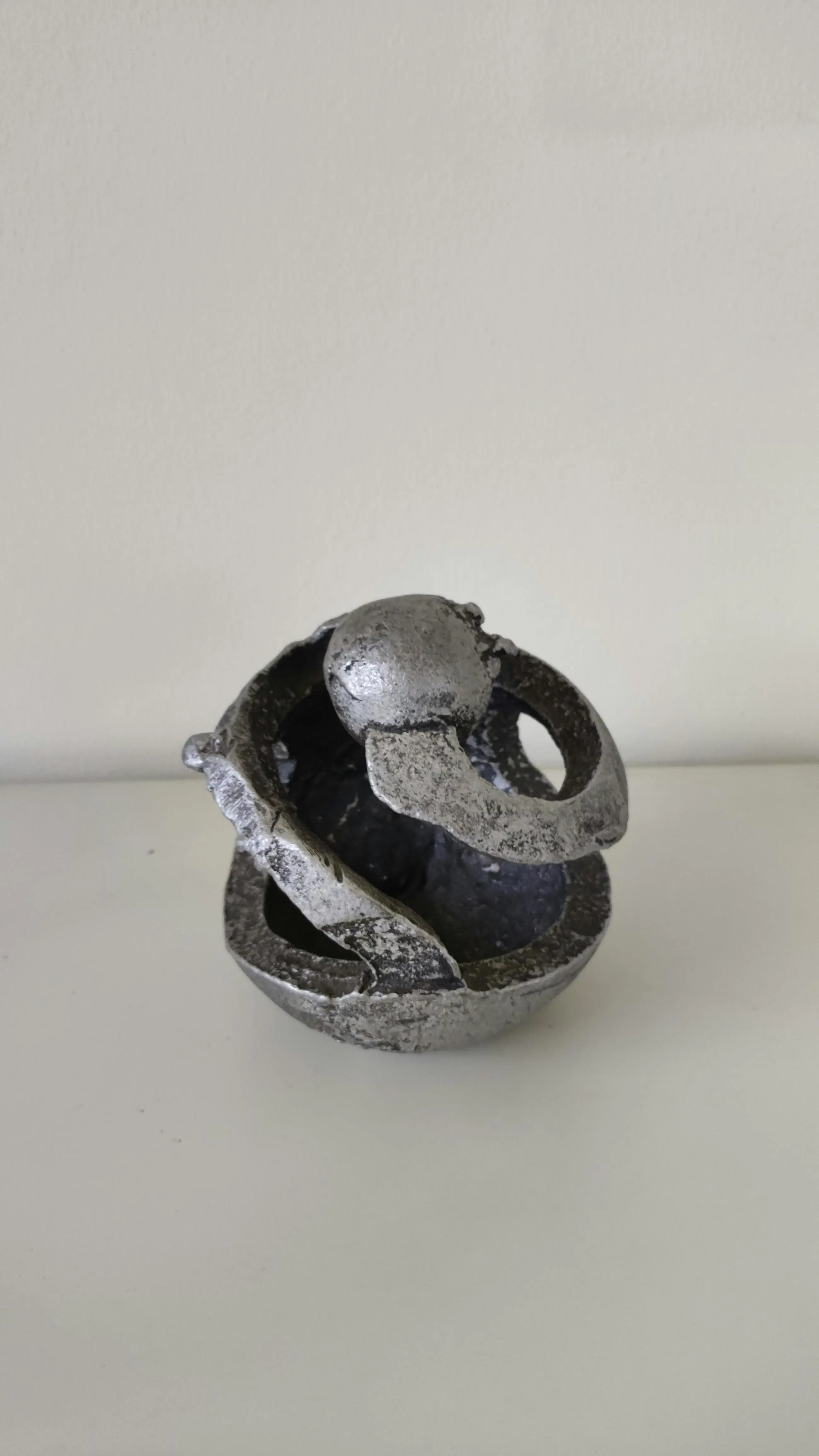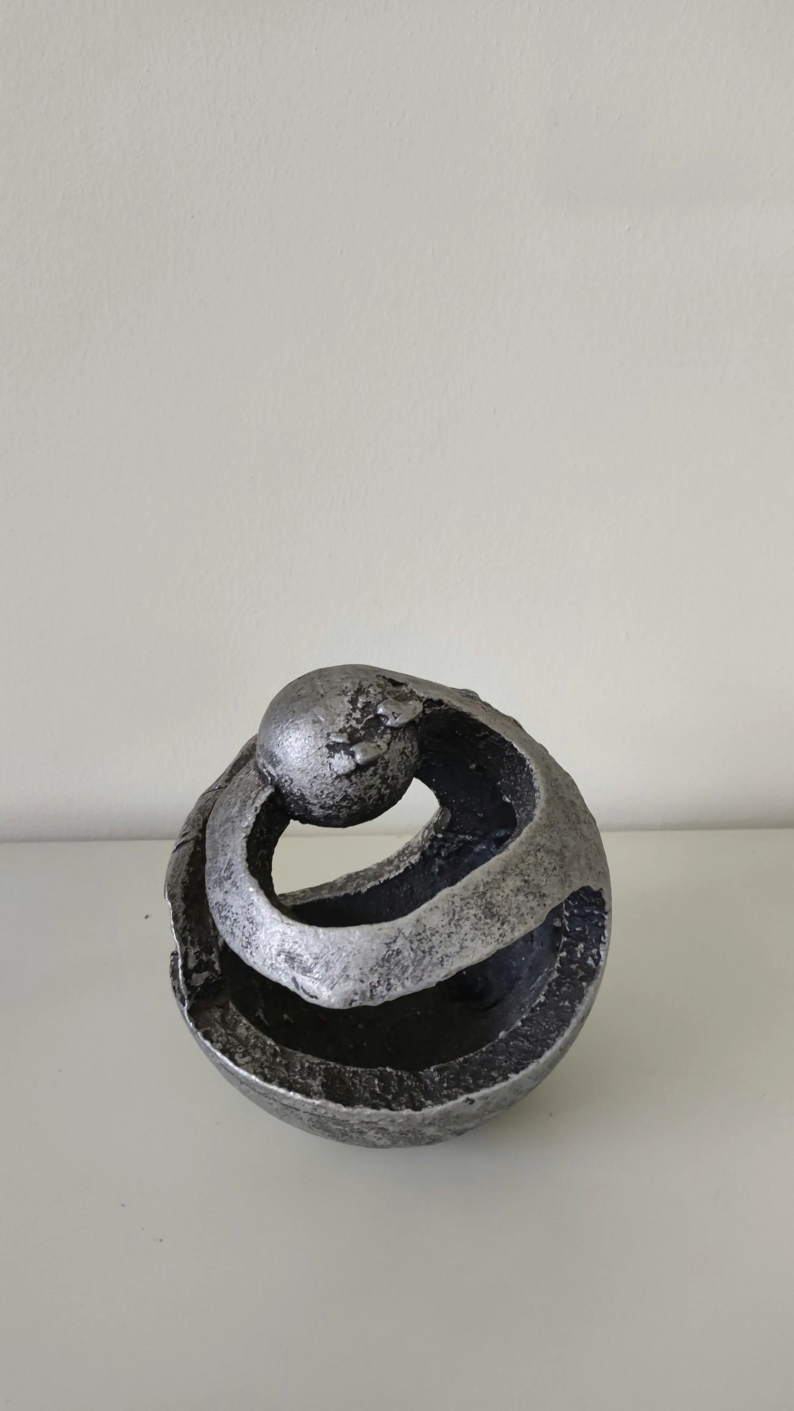 Abstracte aluminium sculptuur in een opengewerkte bolvorm. Figuur zit voorovergebogen en ondersteunt zijn hoofd. Zeldzaan object in het werk van Willy Ceysens