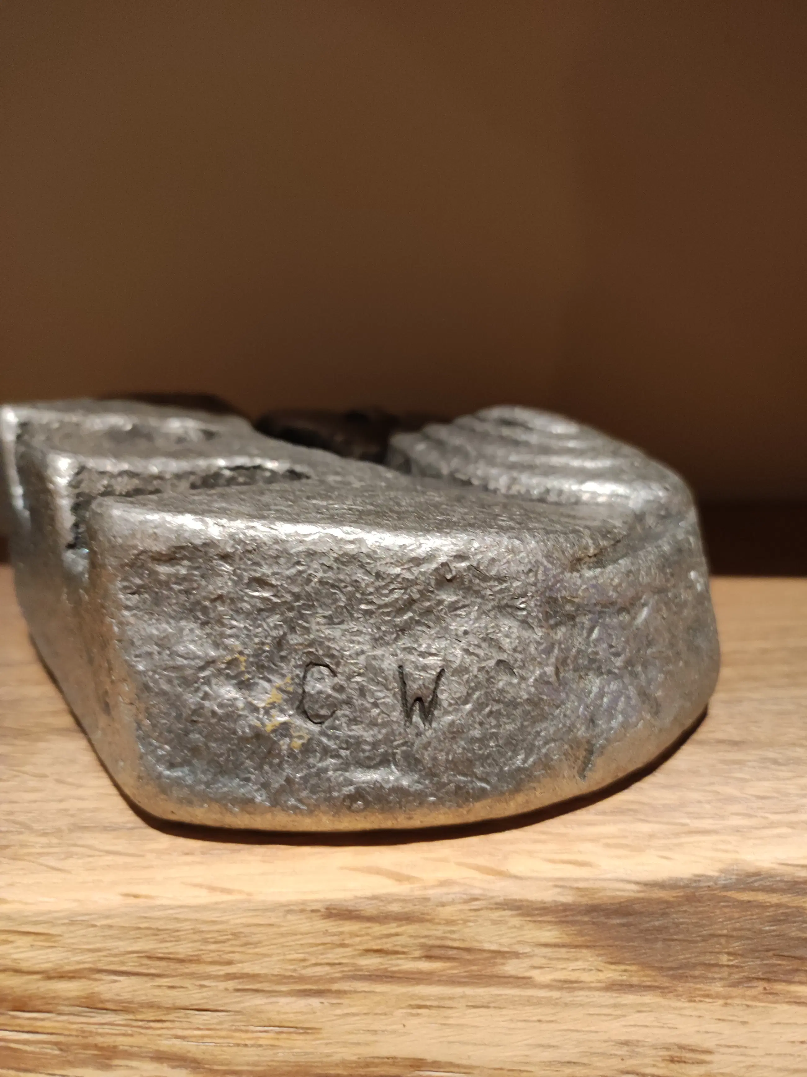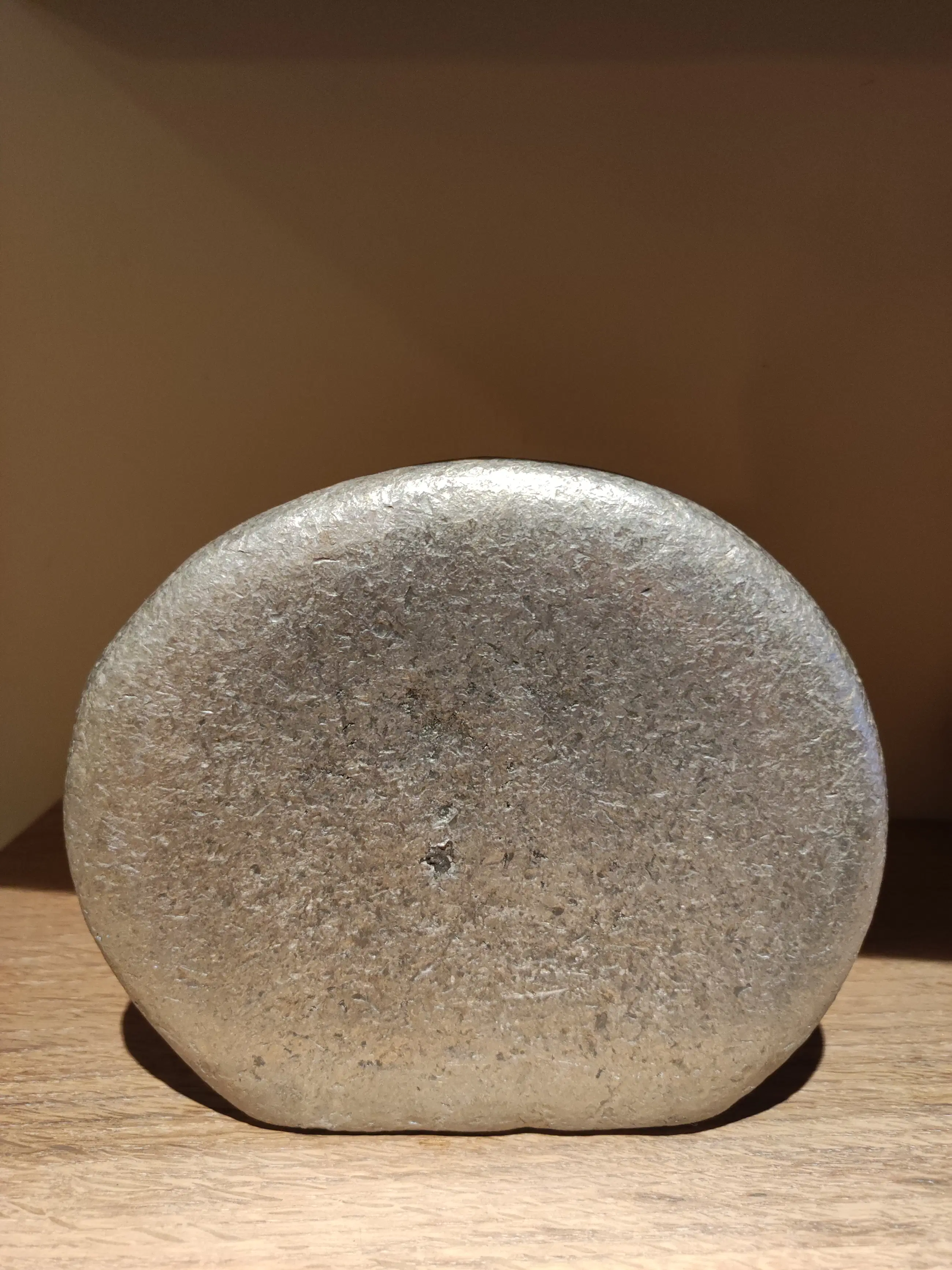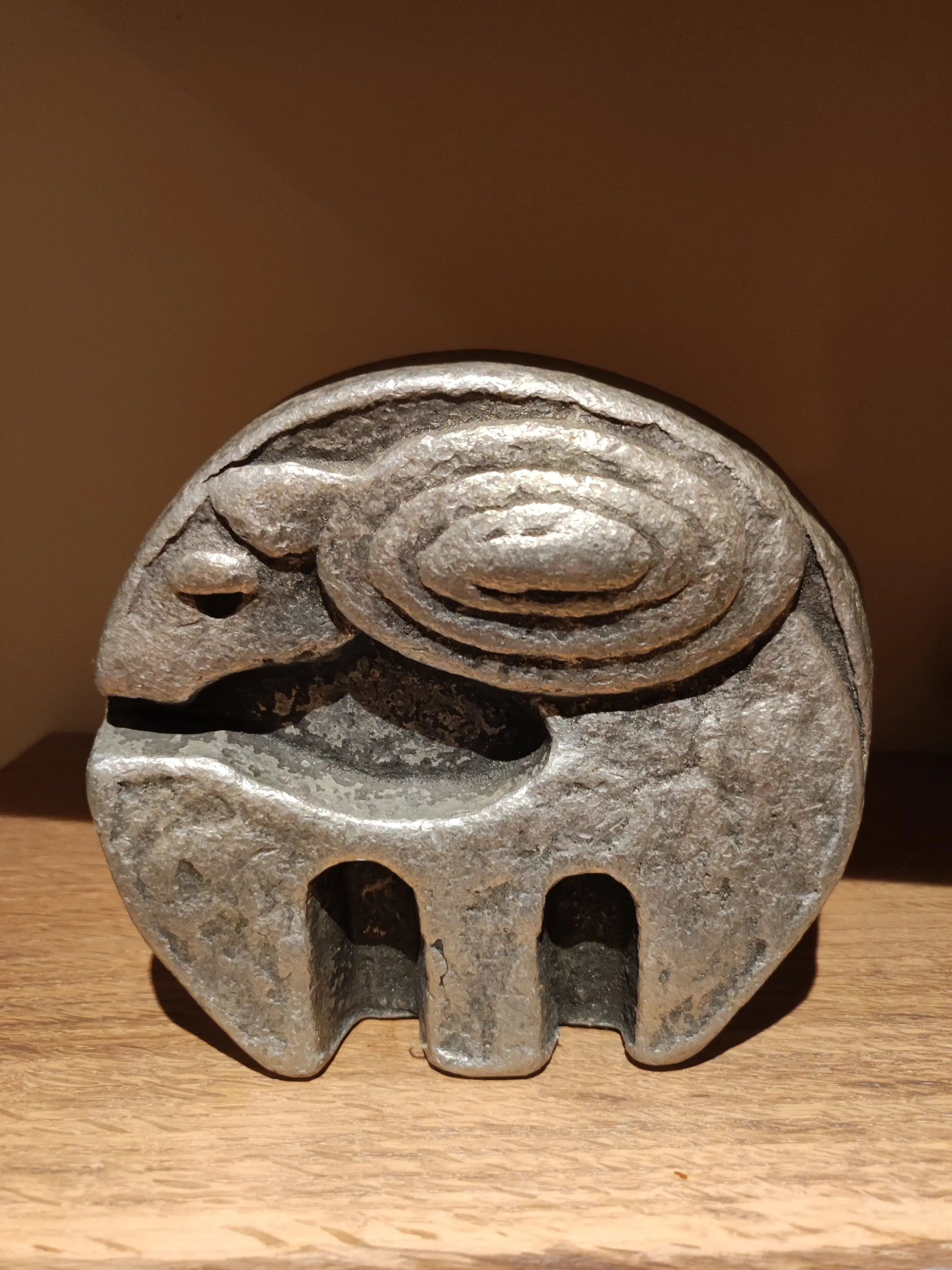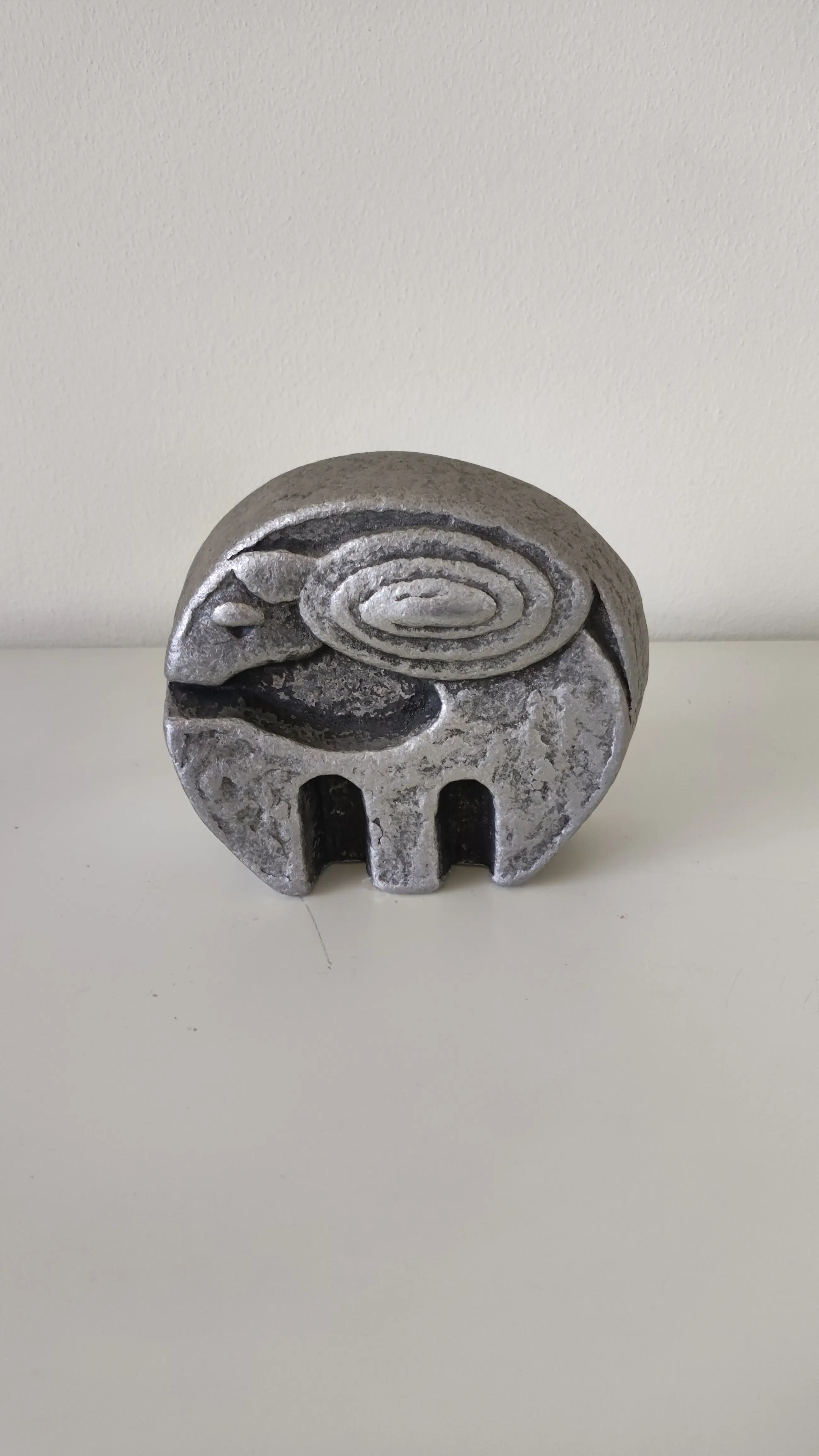 Dikke ronde plak van massief aluminium met een abstracte dieren voorstelling. Kan rechtop staan.