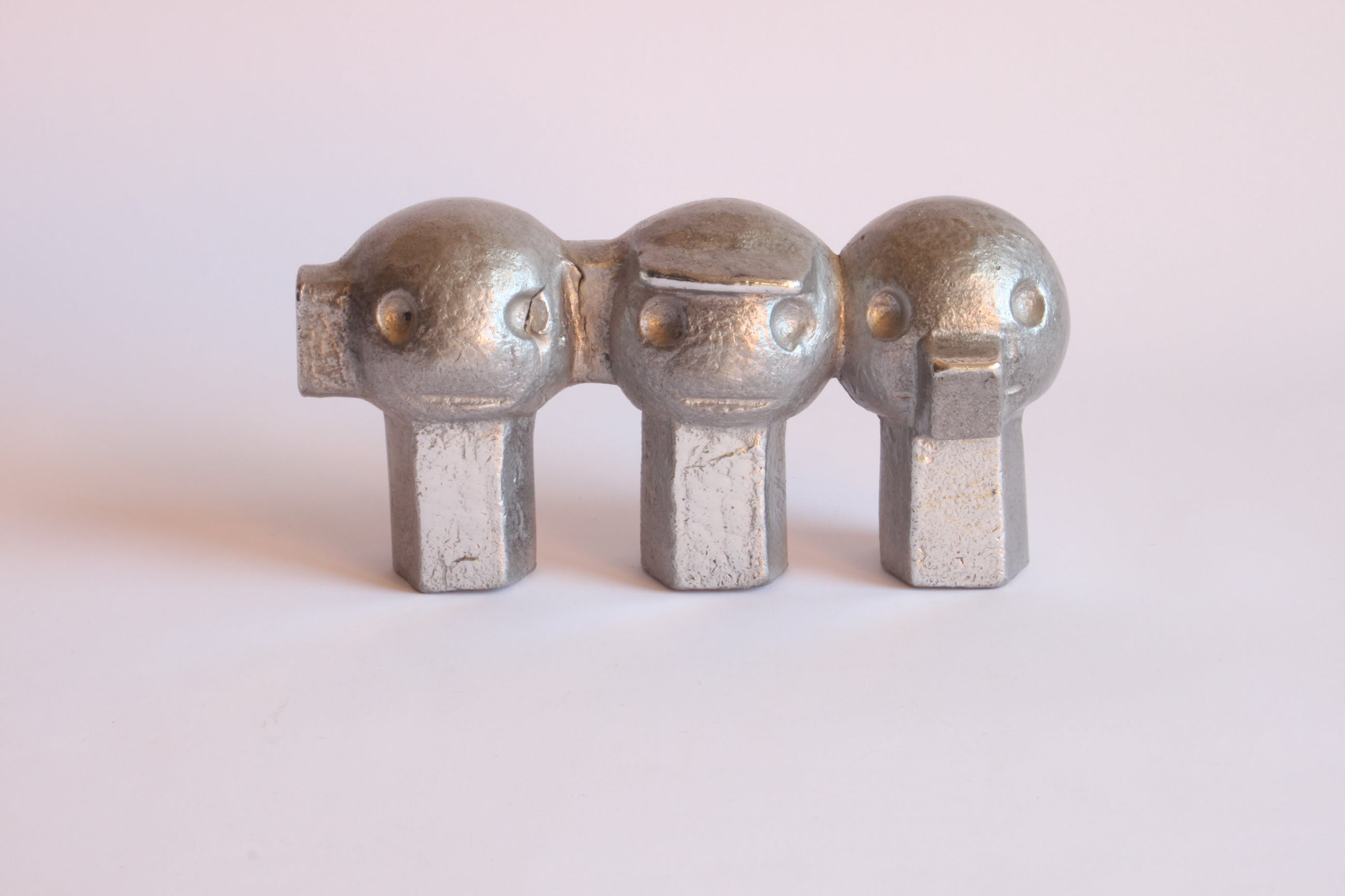 Drie wijze aapjes van het gezegde: horen zien en zwijgen. Volledig in aluminium, gemonogrammeerd.