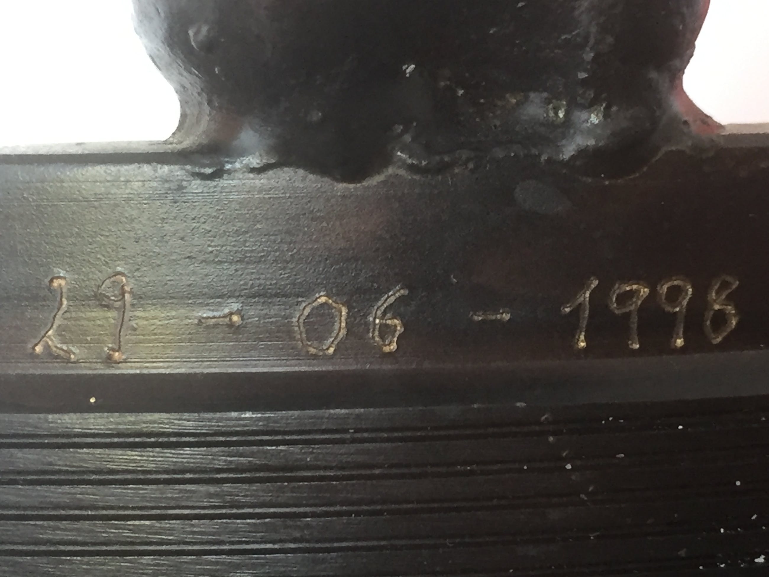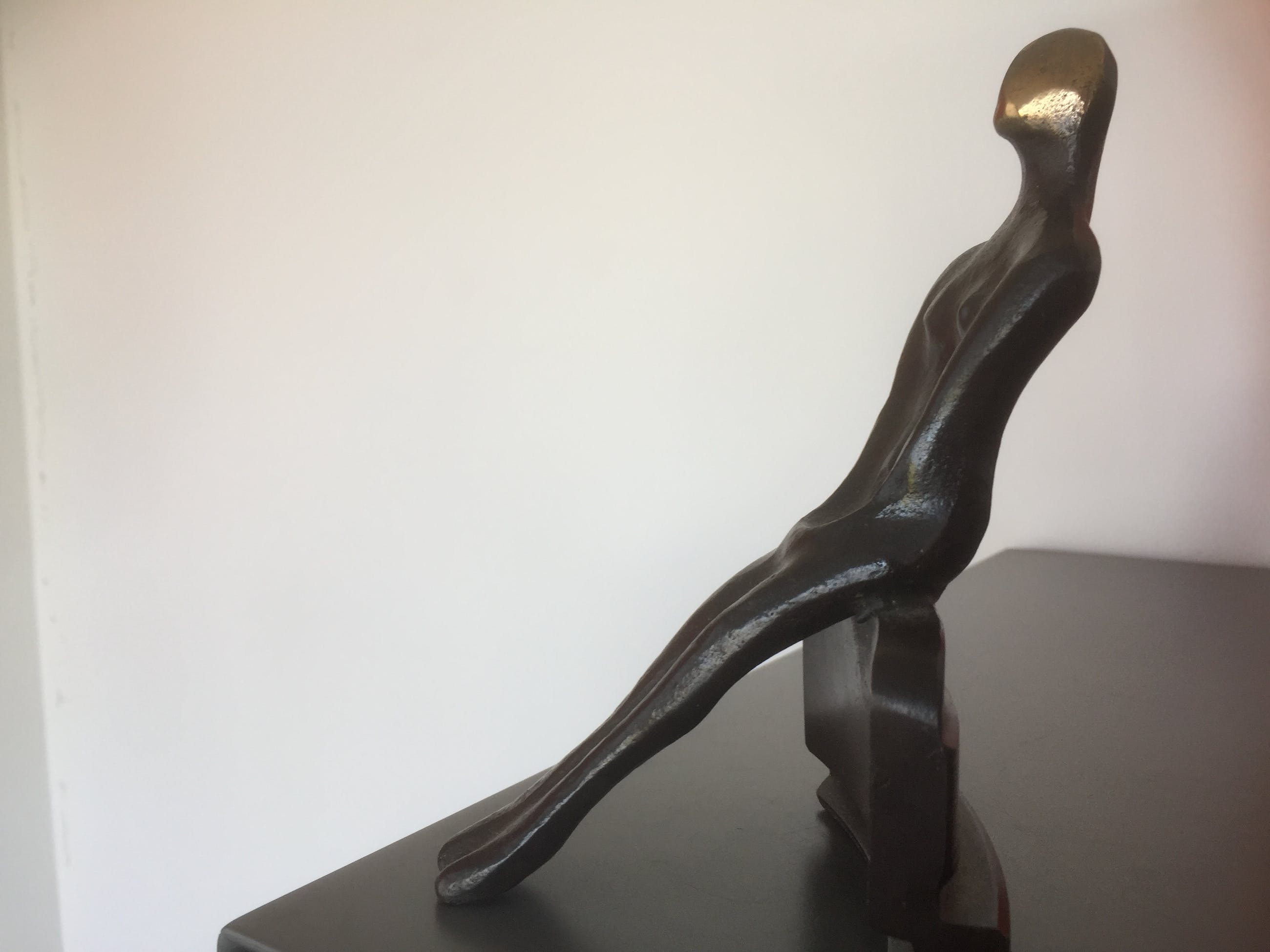 Gedateerd 29 - 06 - 1998 deze vrouw zittend op een rand met handen in haar schoot uitgevoerd in mooi glad /gepolijst bewerkt brons in tegenstelling met zijn werk in grof aluminium