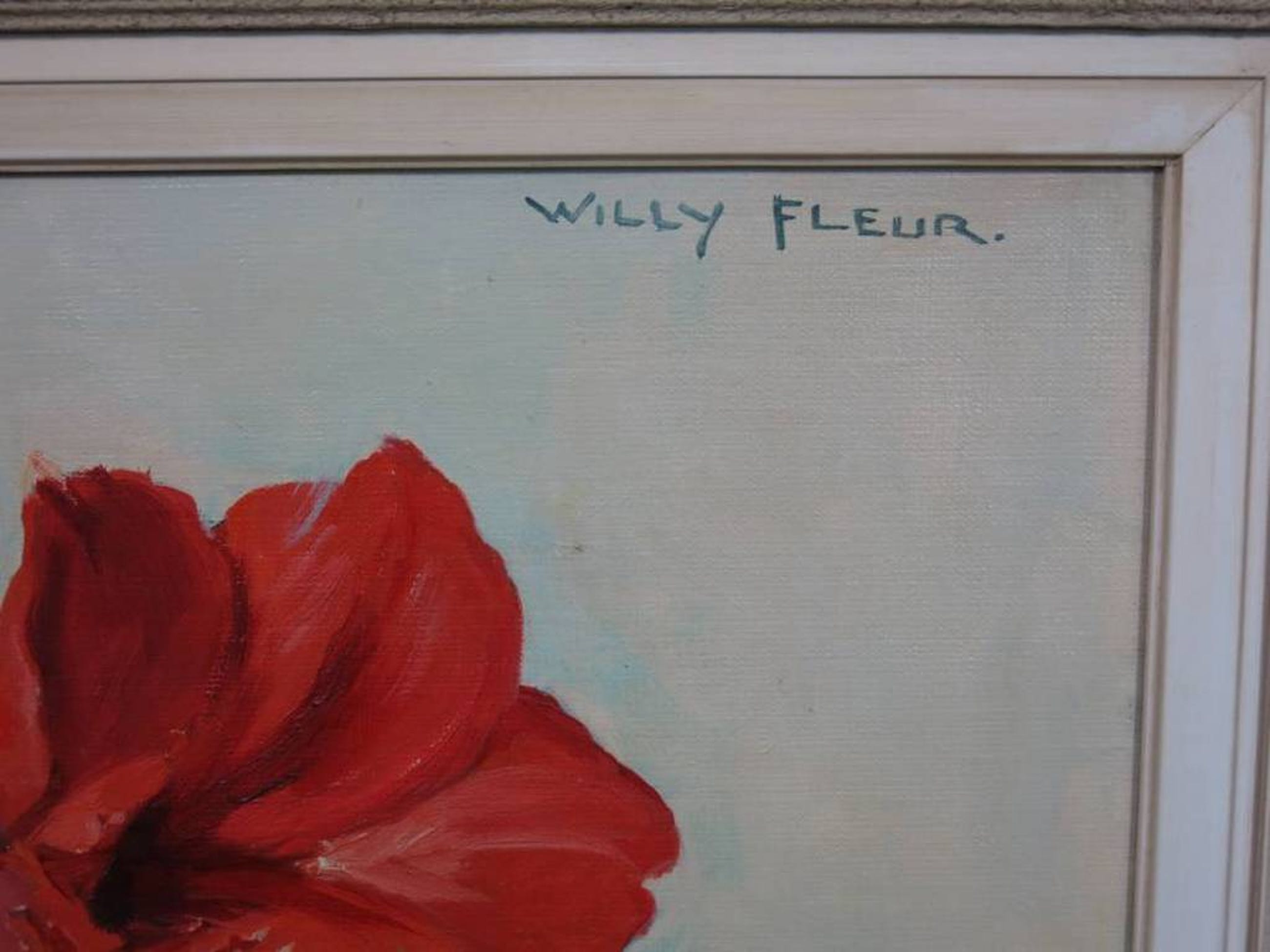 Mooi en groot schilderij van Amaryllissen in een versierde kan door kunstenaar Willy Fleur. Met achterop een stempel en sticker van Roelofs Kunsthandels uit Amsterdam.