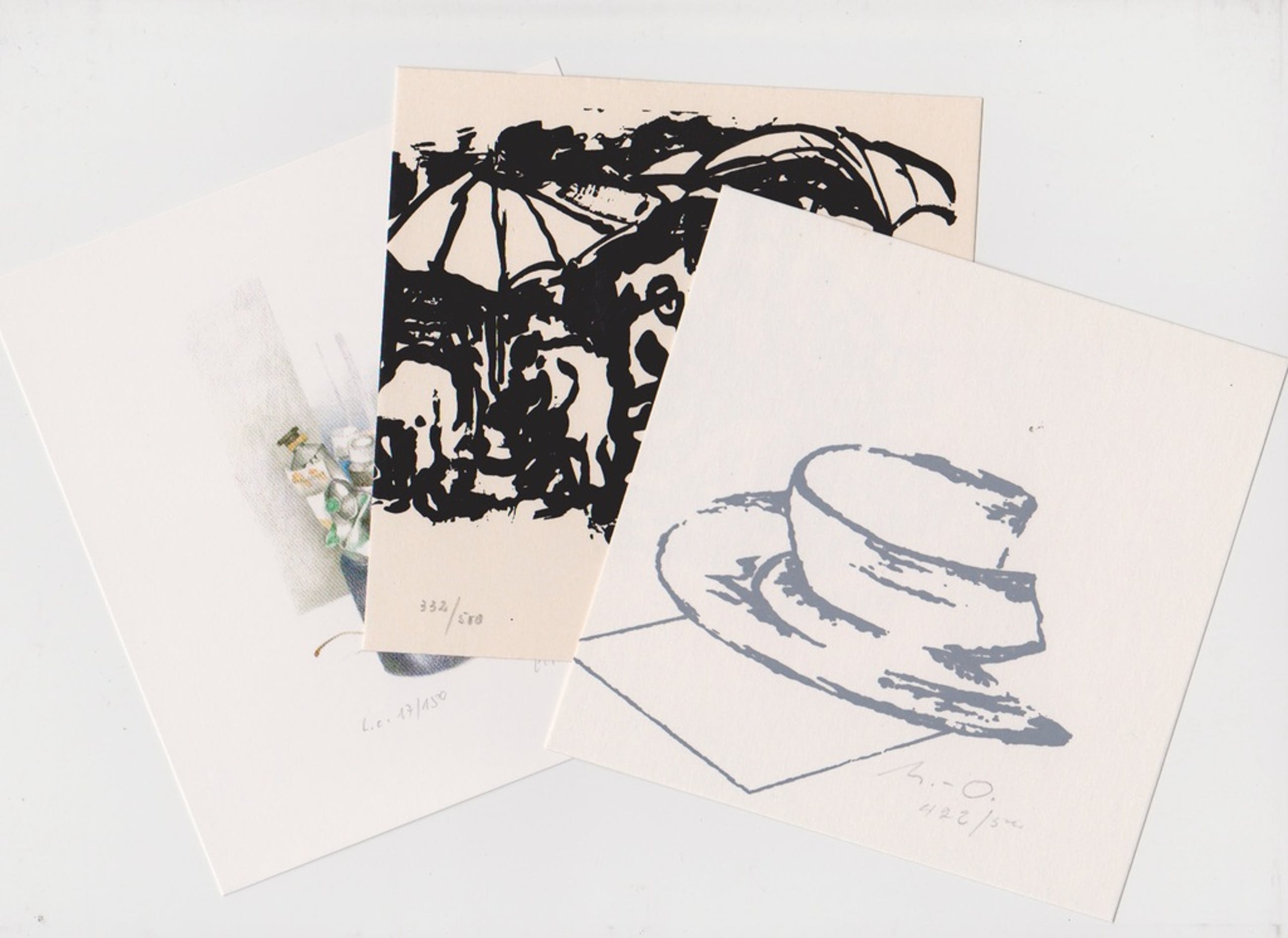 Drie lithografien, diverse voorstellingen. Vanwege het kleine formaat gemakkelijk in te lijsten. Ook leuk als kunstkadootje!