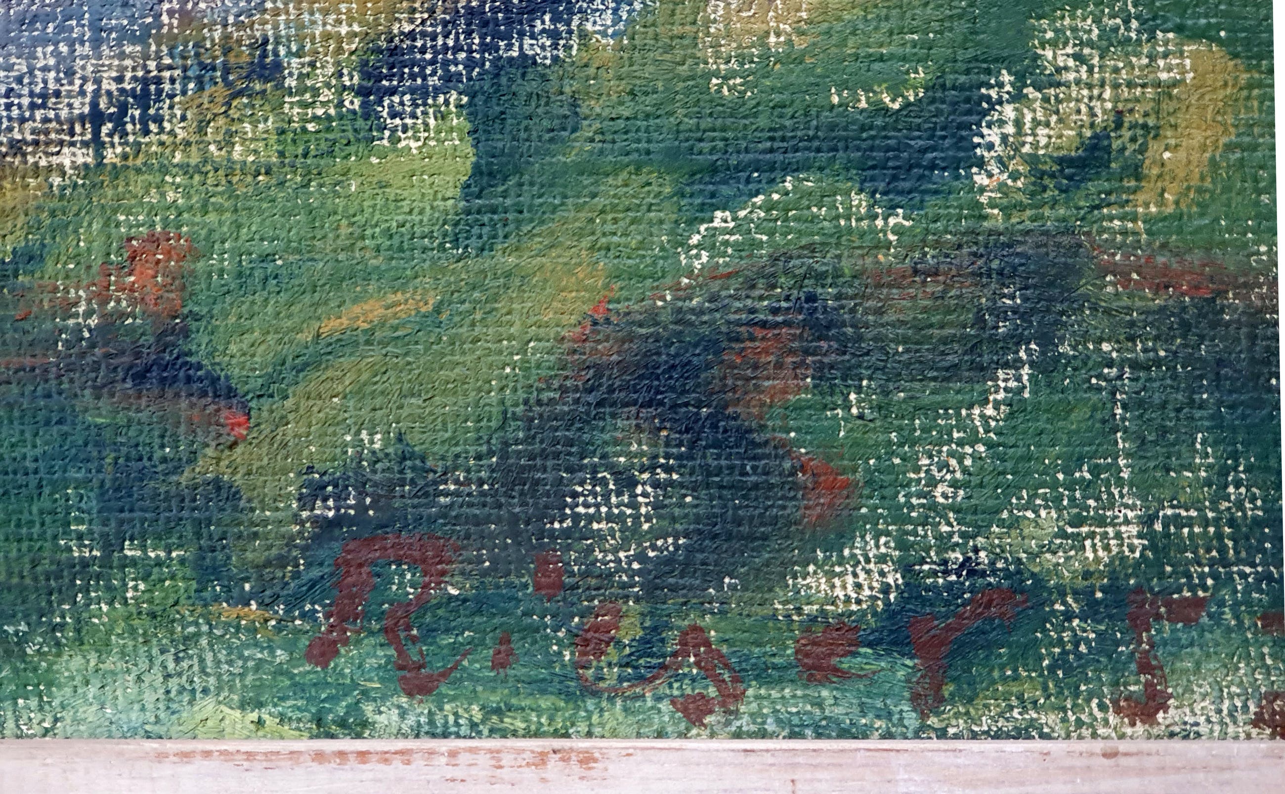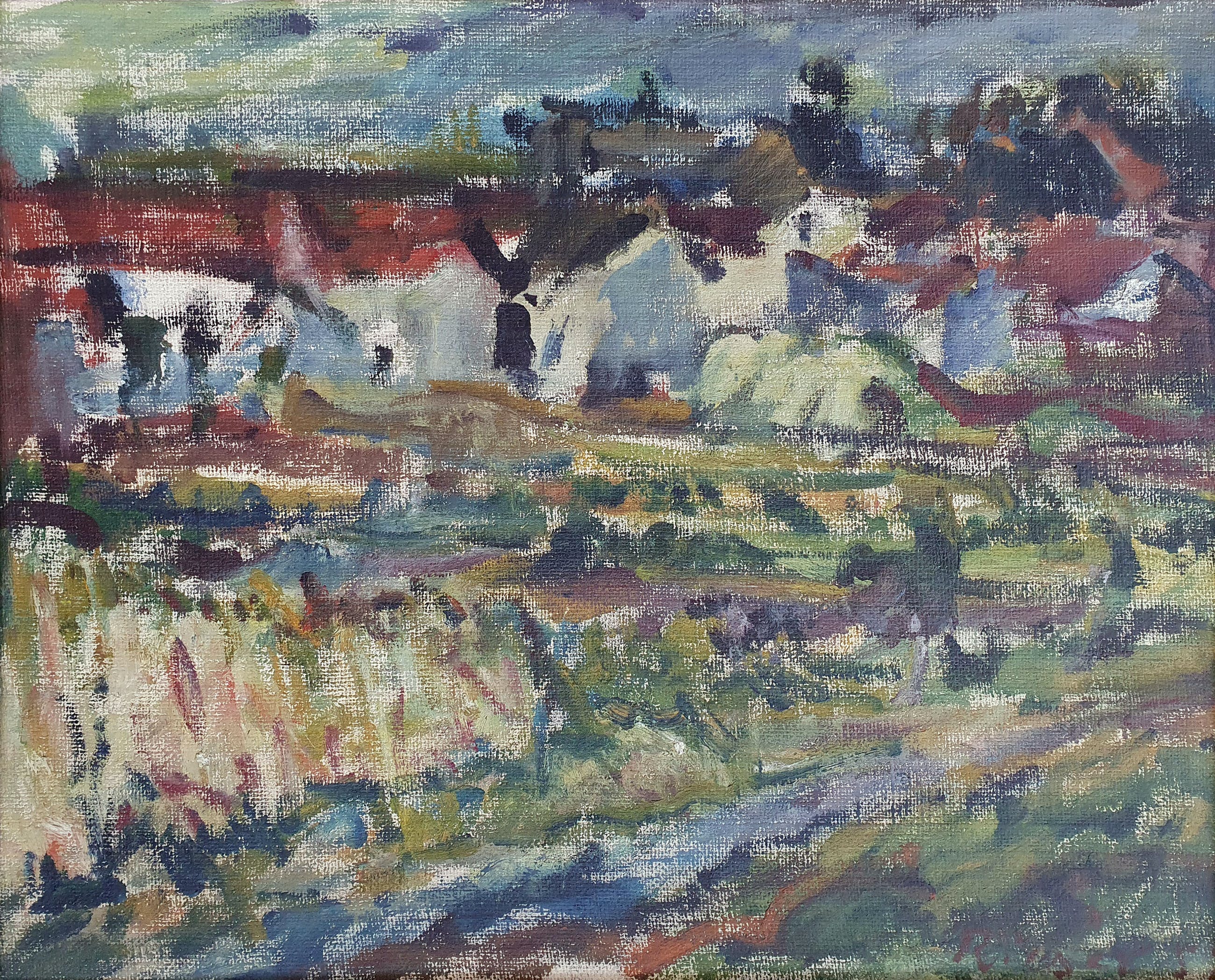 Fraai schilderij van Willy Rieser met de titel: 'Bij Maastricht' uit 1952. Het werk is rechtsonder met de hand gesigneerd door de kunstenaar.