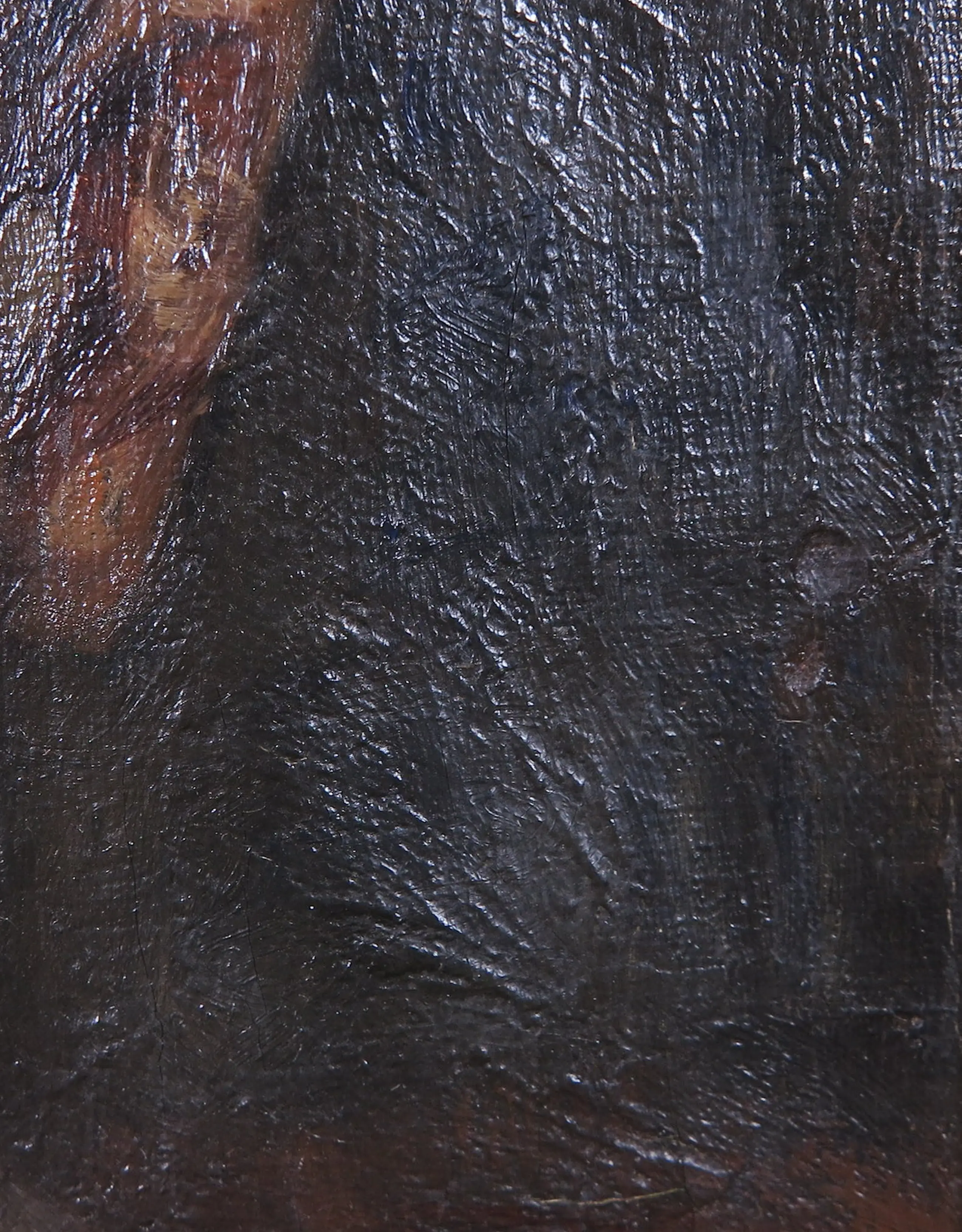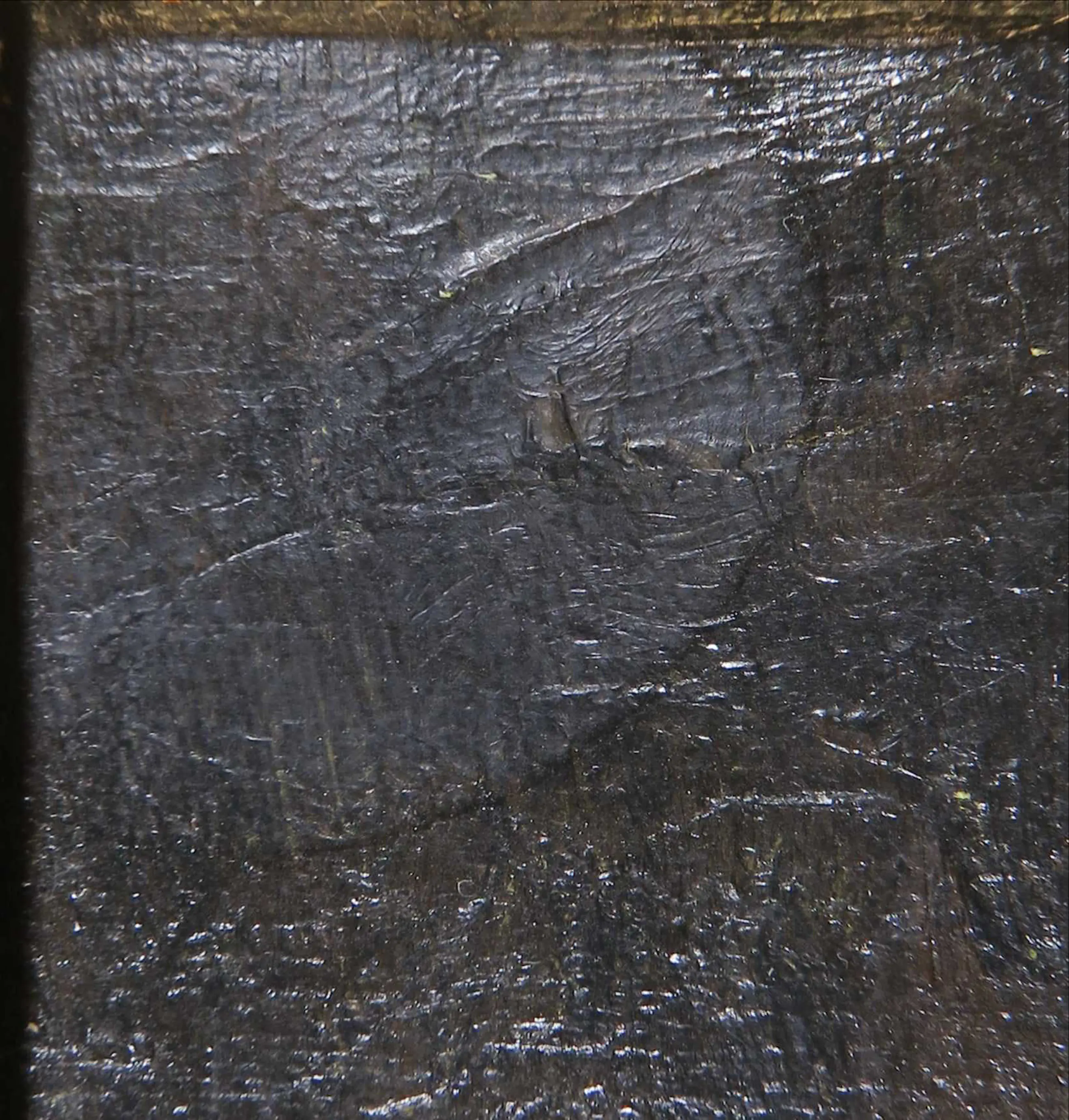 Het werk is opzich in goede staat, maar heeft een aantal opvallende plekjes schade. In de linker boven- en Ook heeft er waarschijnlijk iets tegen het board aan gestaan, wat voor vervormingen heeft gezorgd (vooral rechts). | |