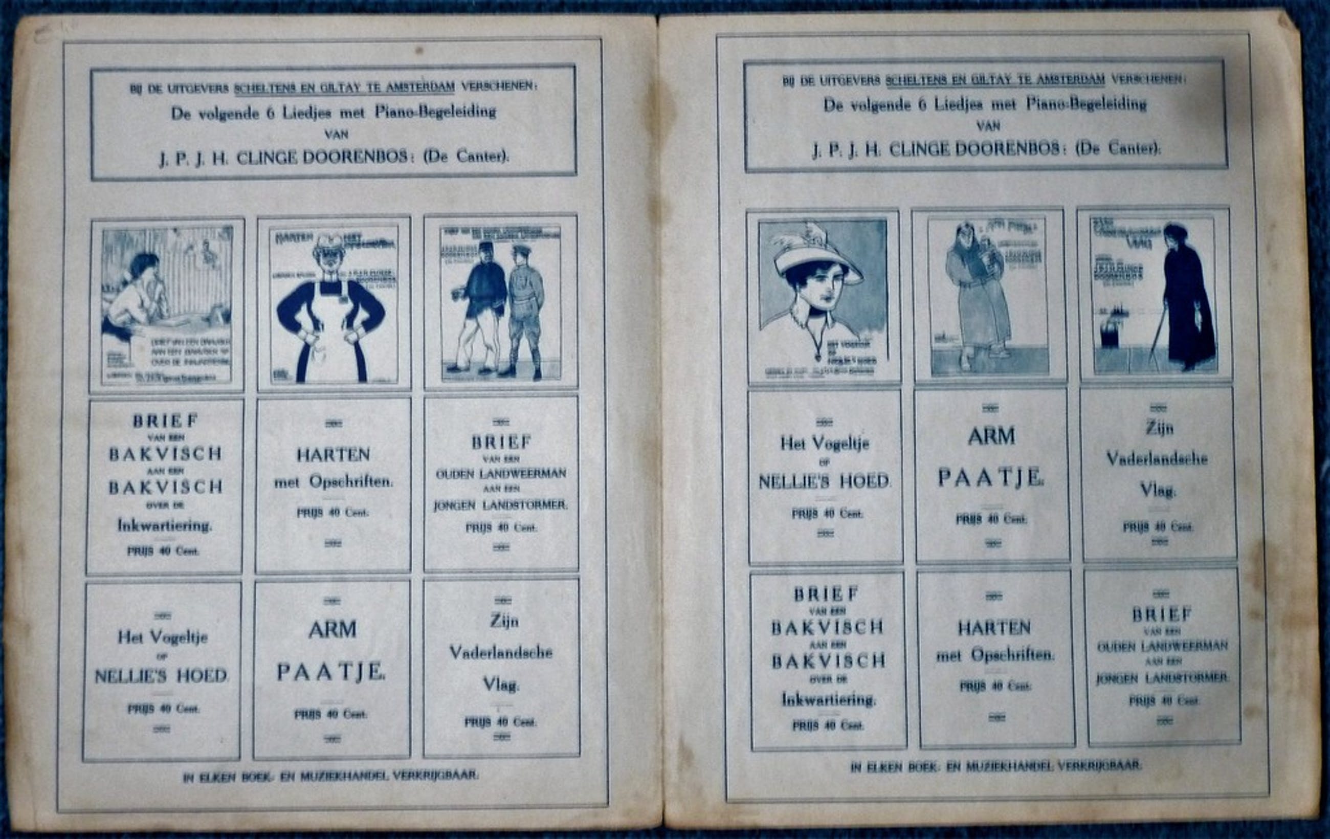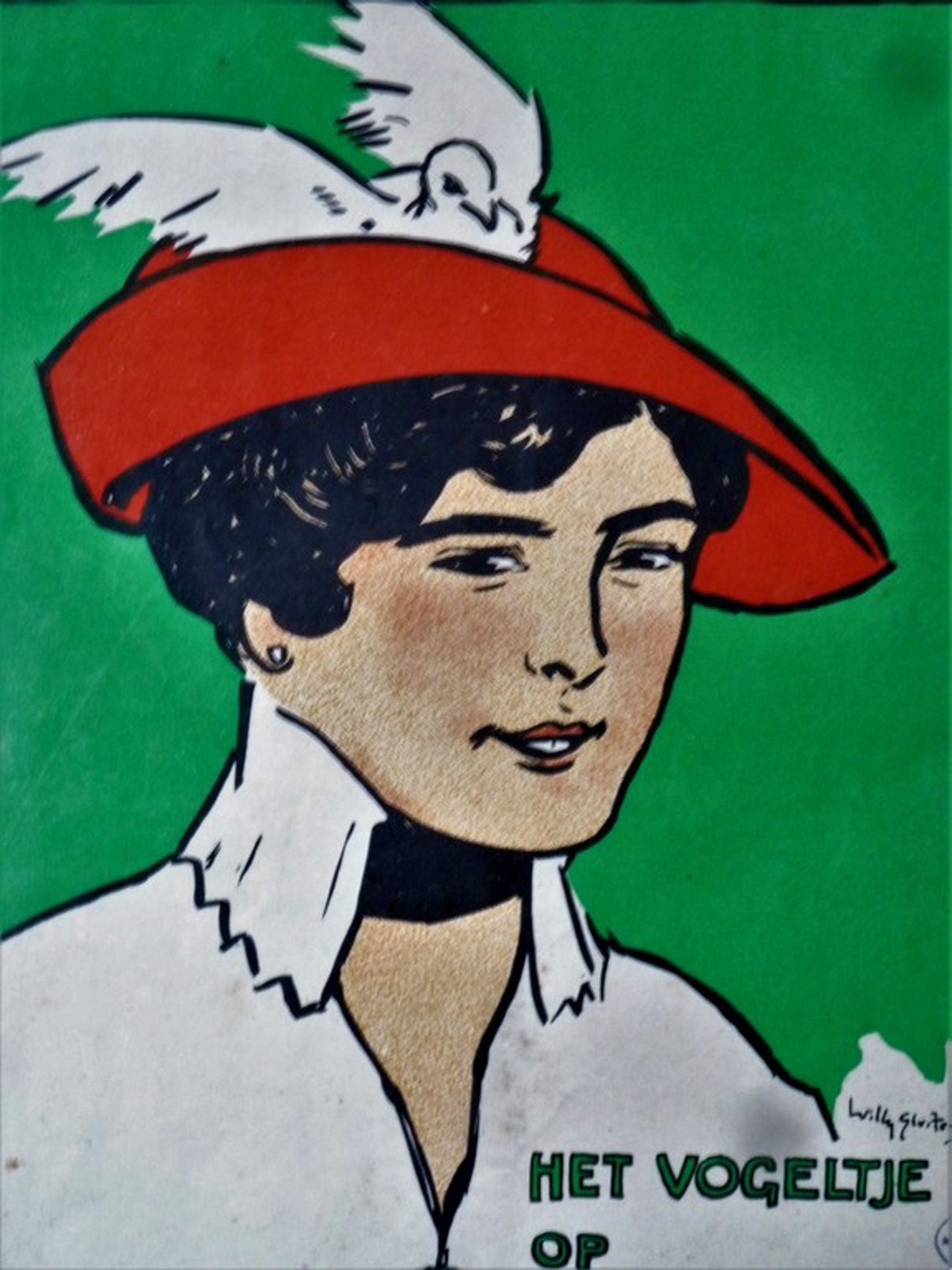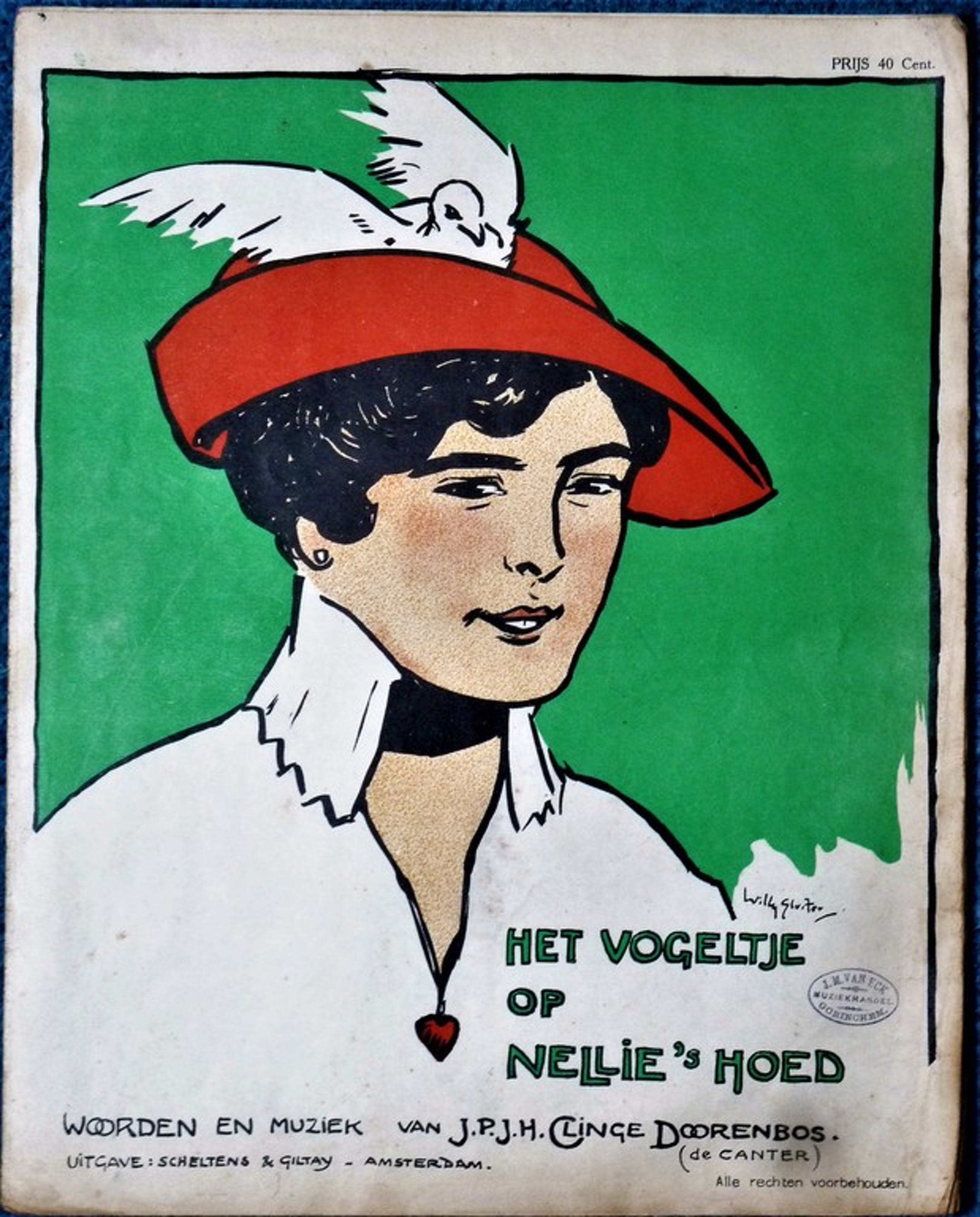 Bladmuziek van Clinge Doorenbos uit ca 1930. Titel : "Het vogeltje op Nellie's hoed".Afmetingen :27x33,5 cm. Het betreft een vroege druk (40 centsdruk). Gesigneerd in de druk. Wat verkleurd aan de randen door de tijd, maar de kleuren zijn sprankelend fris.