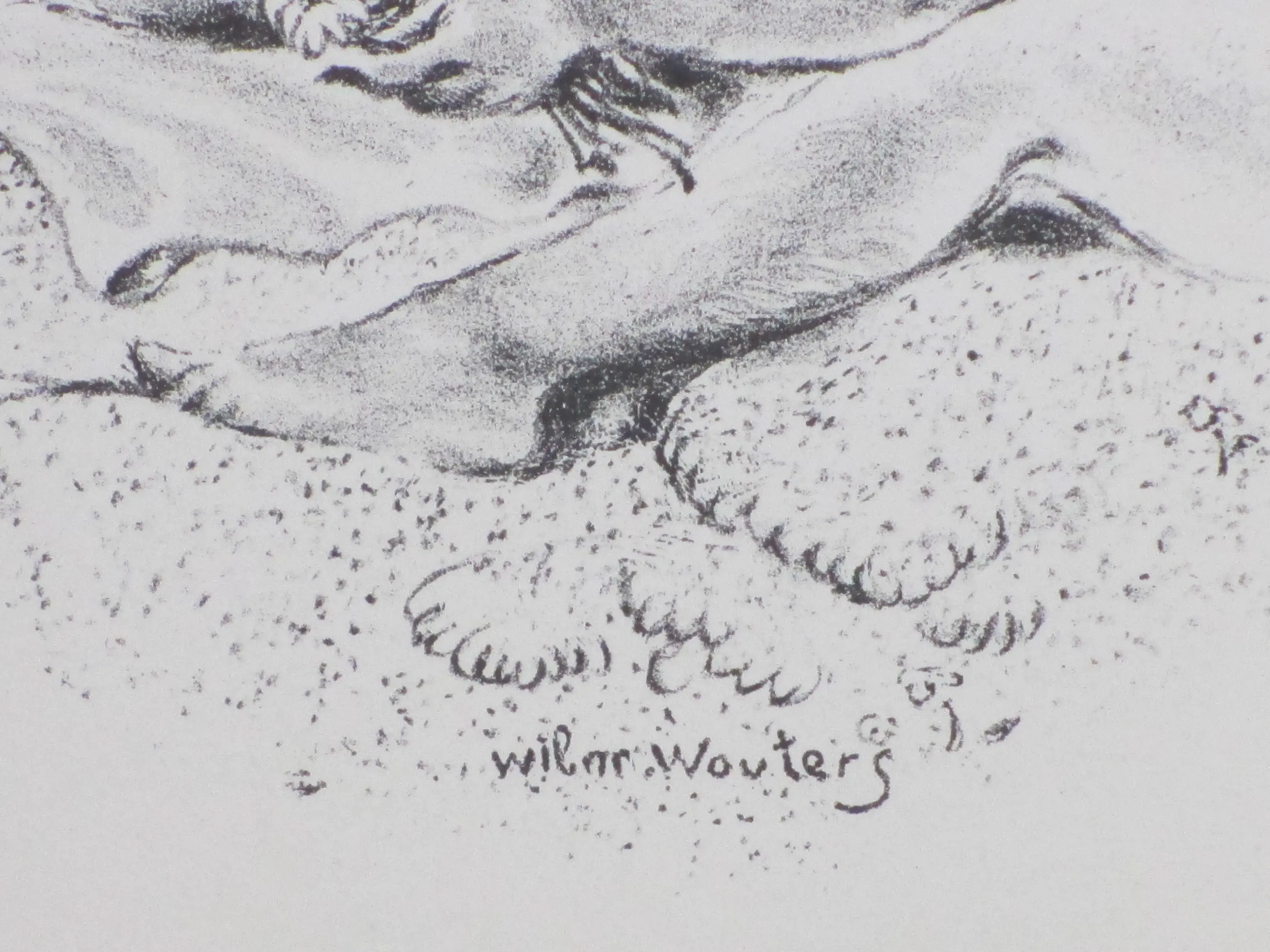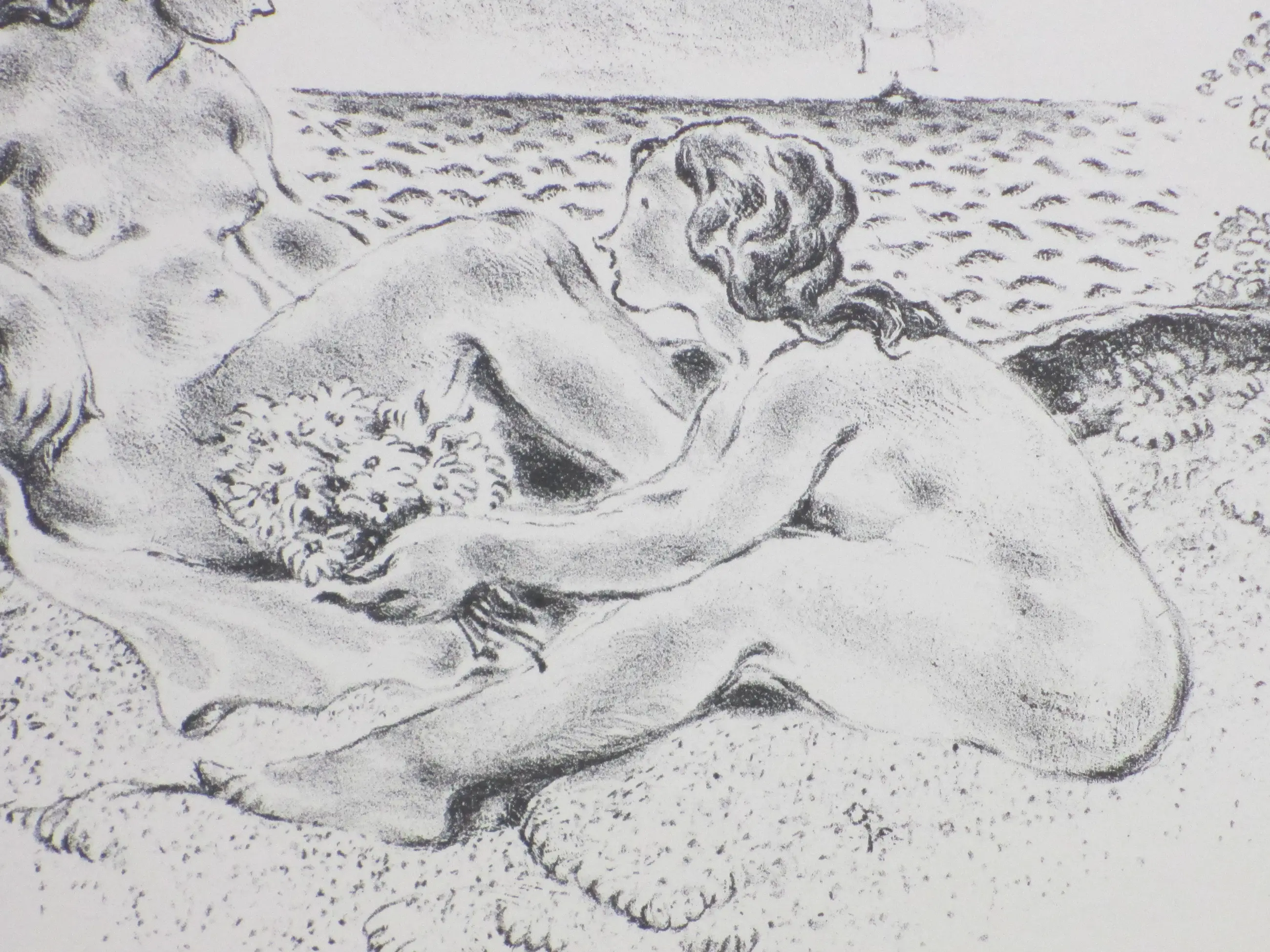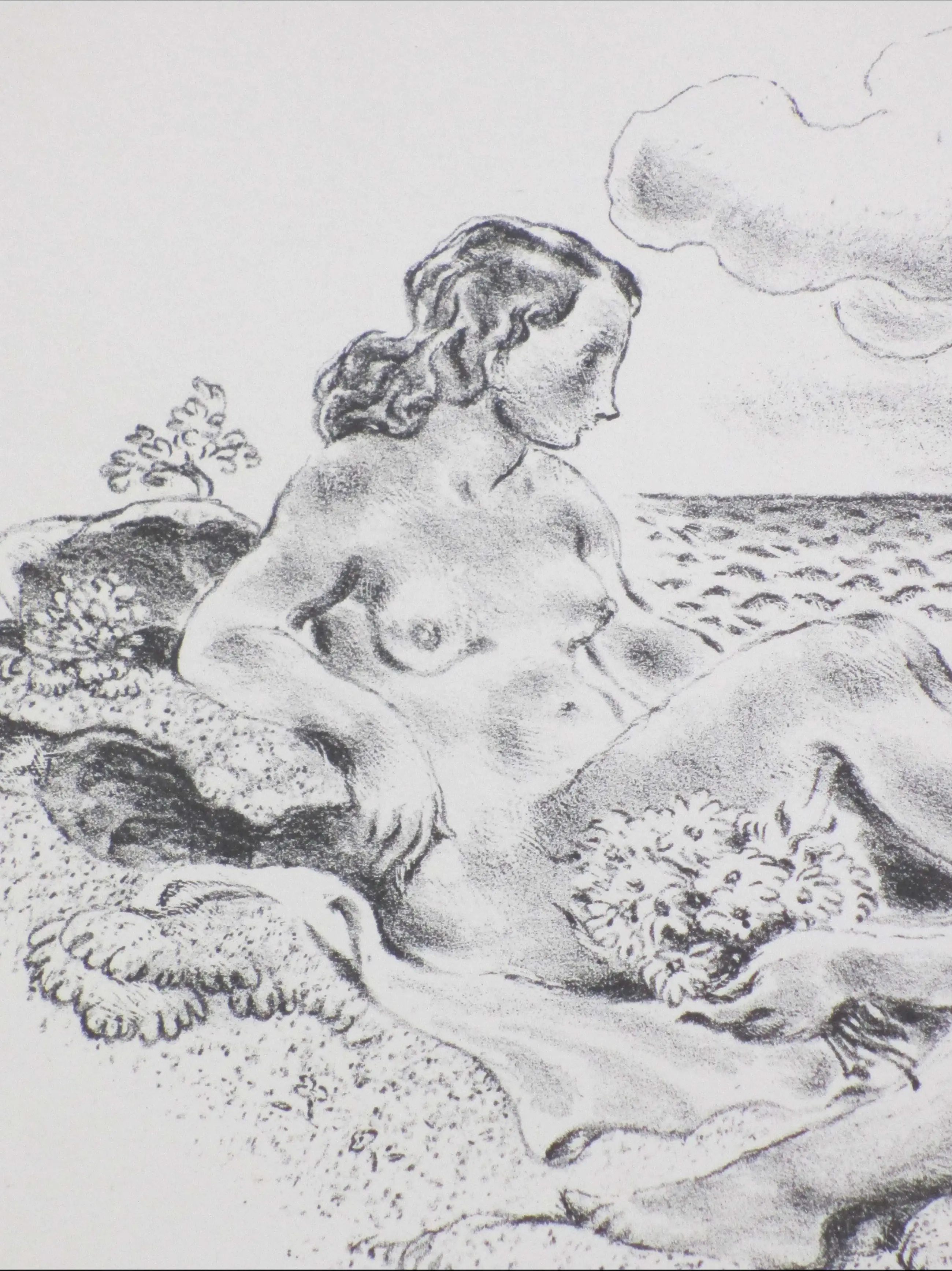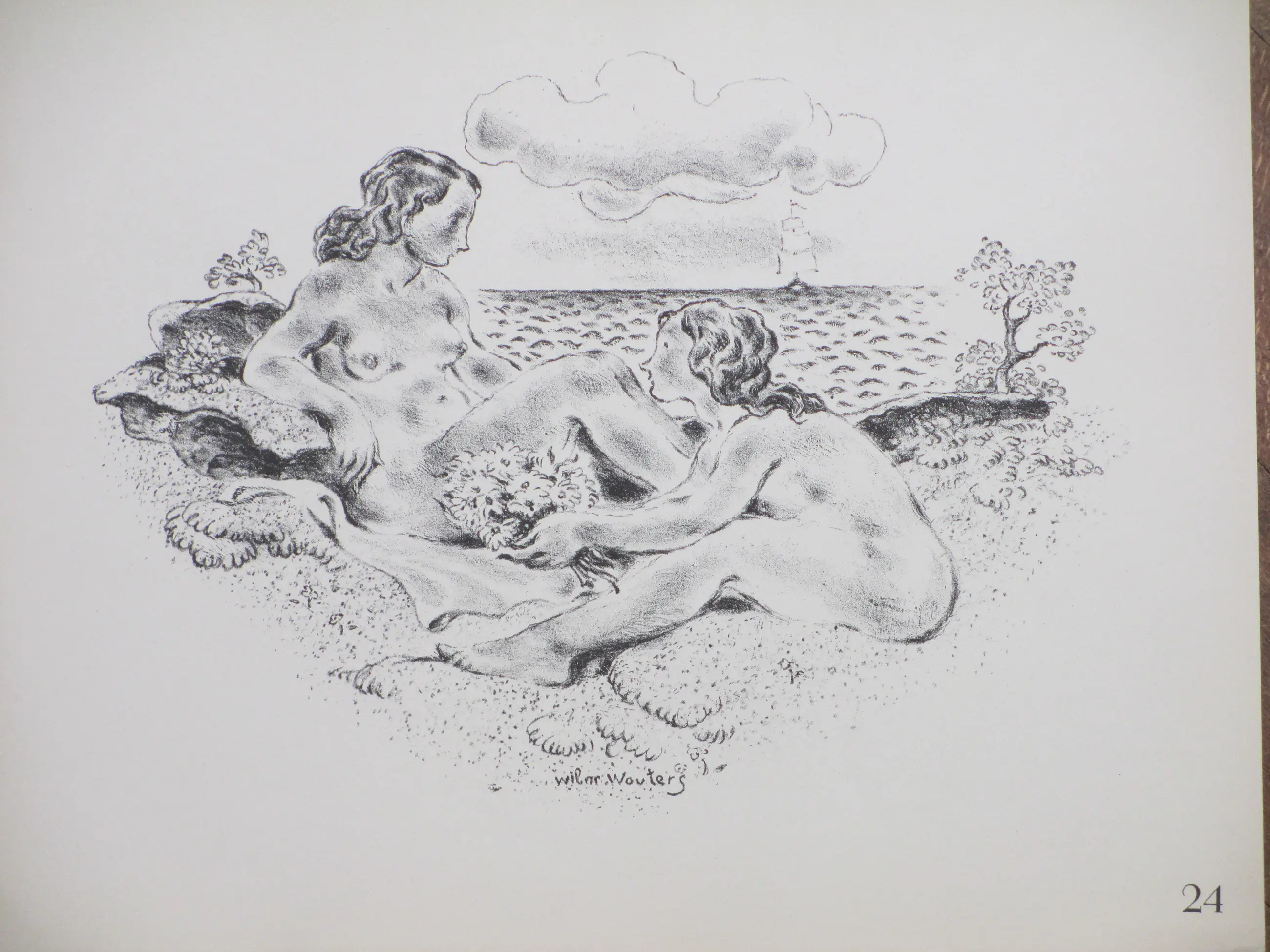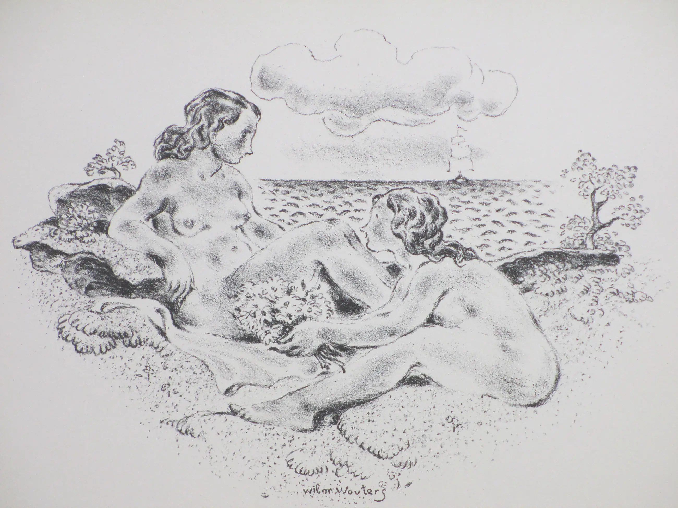 Litho door Wilm Wouters. Voorstelling van twee baadsters in de duinen bij het strand. Losbladig, beeldmaat 18x24, bladmaat 24x30 Gesigneerd in de druk middenonder: 'Wilm Wouters'. Herkomst: Uitgave Arti et Amicitiae 1939 Bekend onder de titel: 'Romantiek geval'