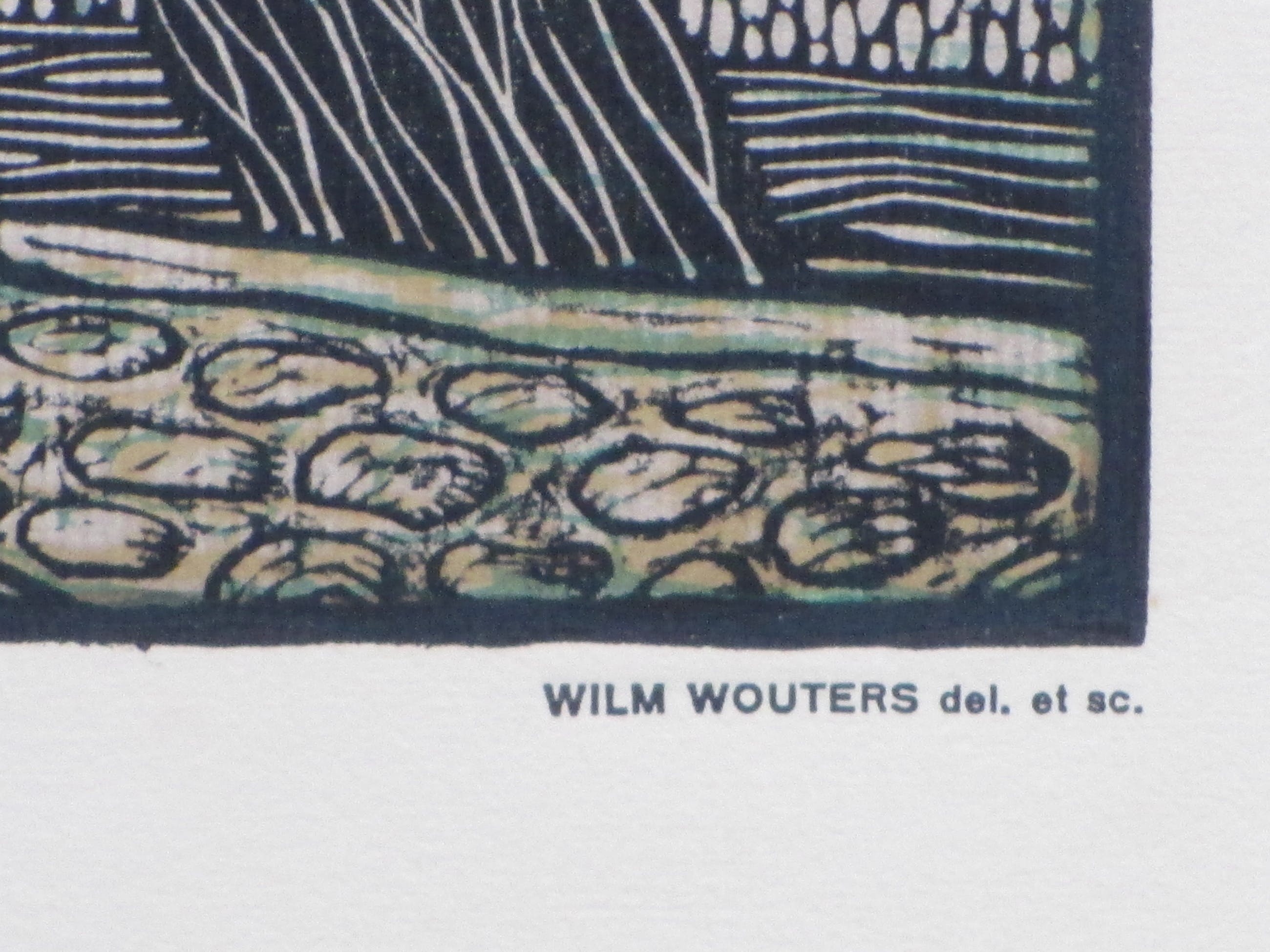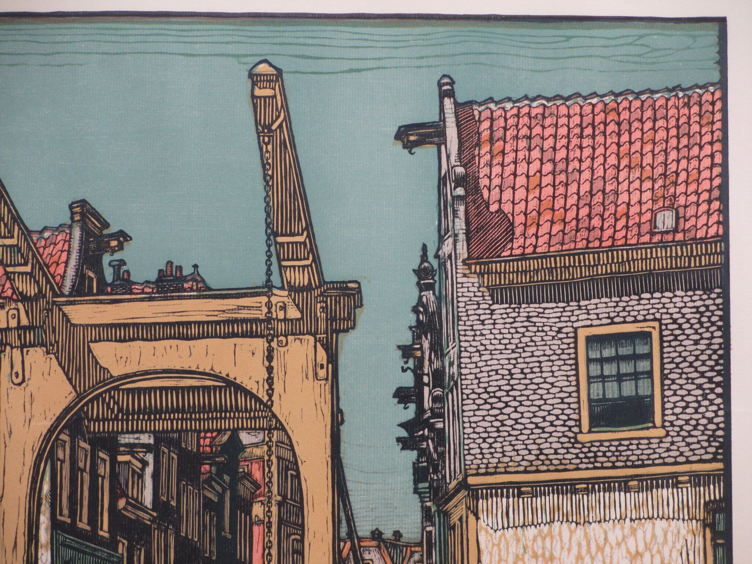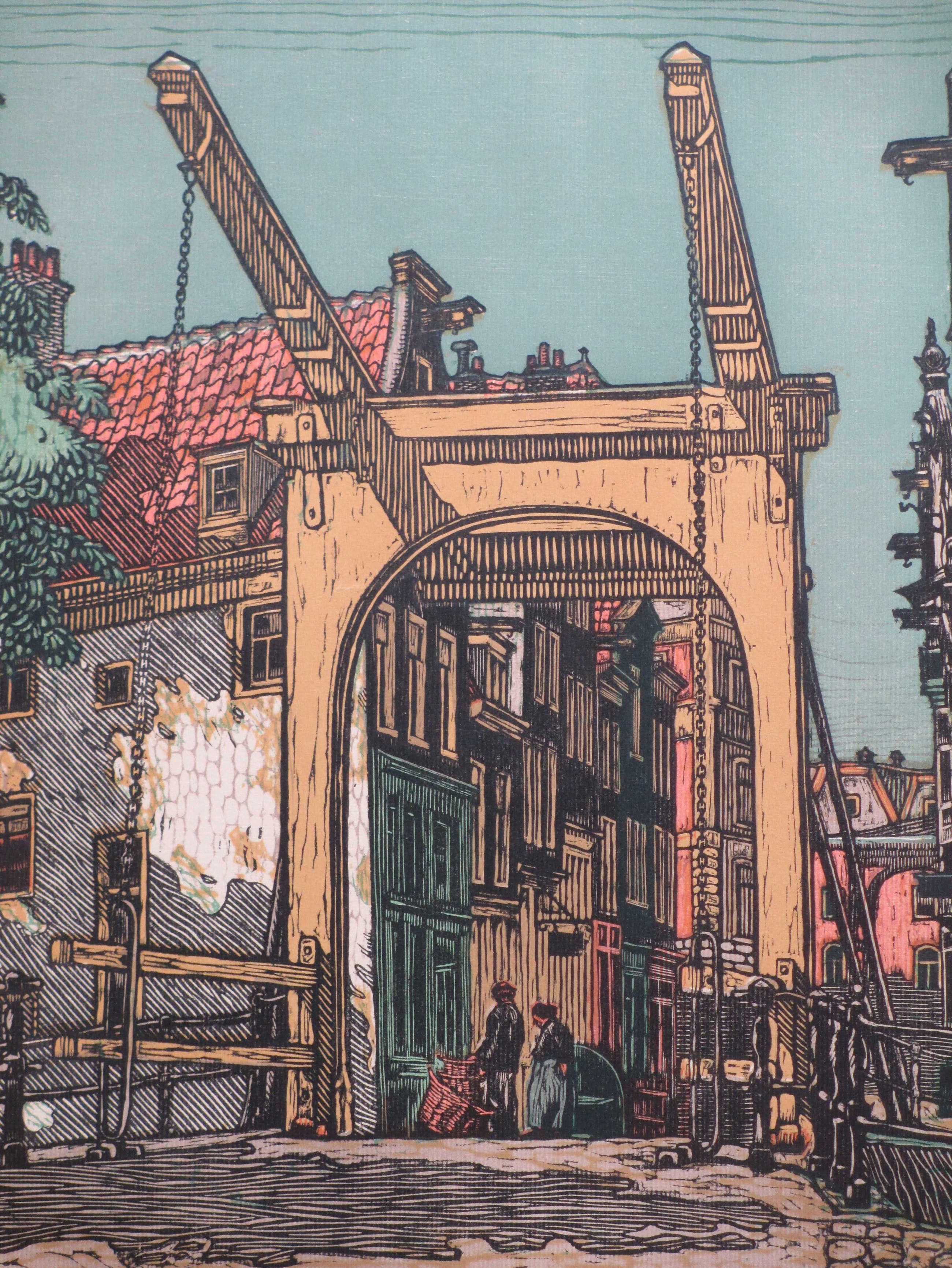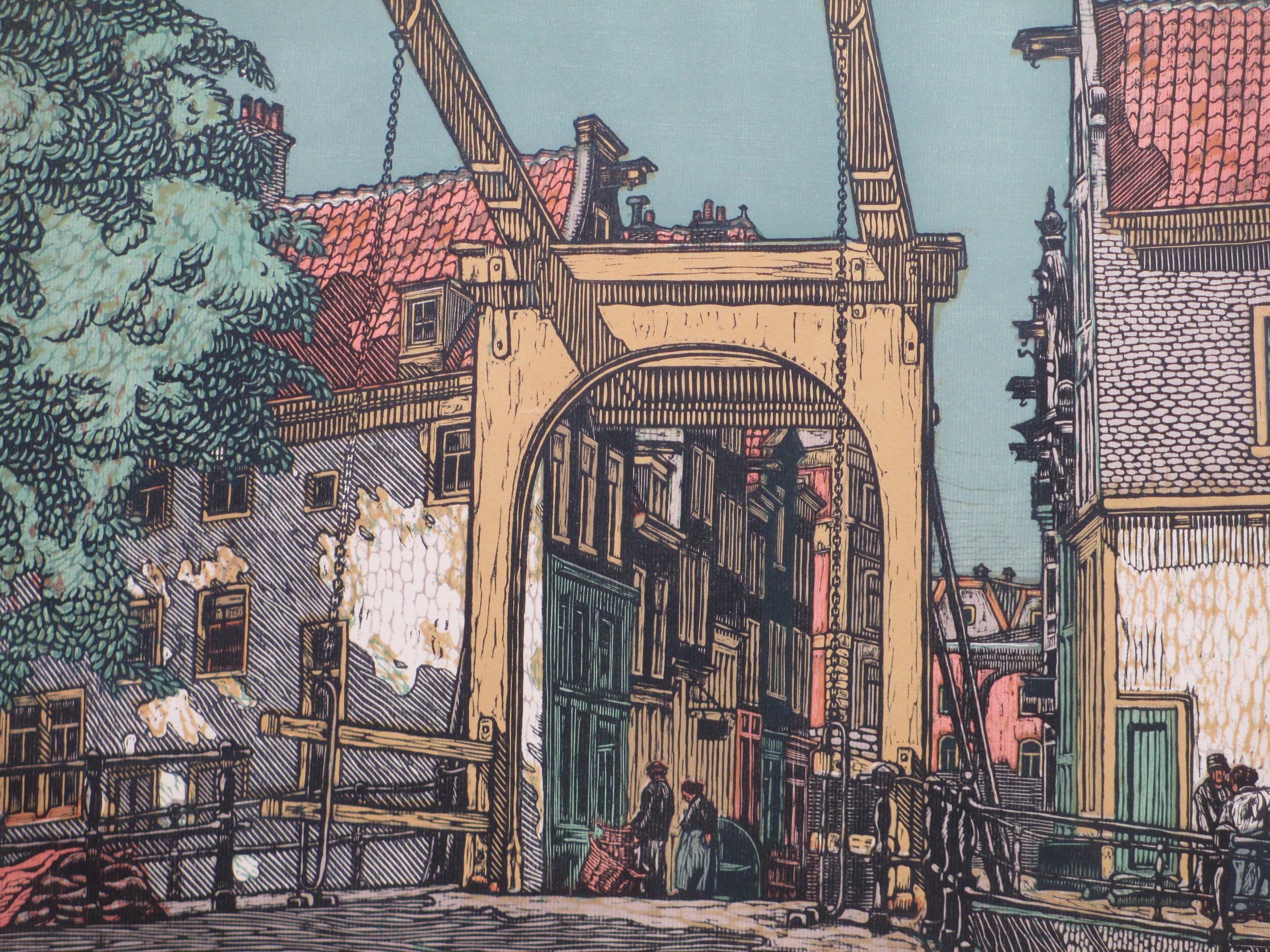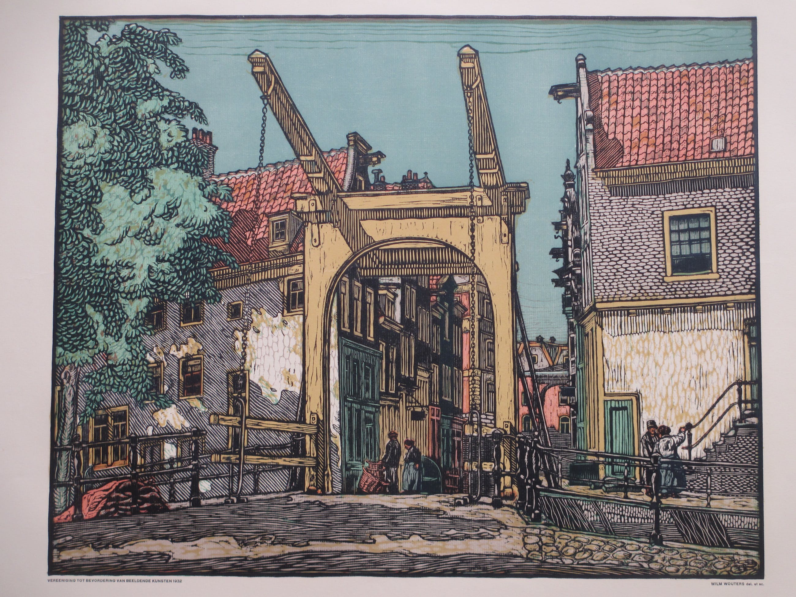 Kleurenhoutsnede door Wilm Wouters. Voorstelling van een ophaalbrug en figuren in een Hollandse stad. Losbladig, beeldmaat 39x49, bladmaat 56x75 Gesigneerd rechtsonder in de druk: 'Wilm Wouters' herkomst: Vereeniging tot Bevordering van Beeldende Kunsten 1932 Authenticiteit volledig gegarandeerd.