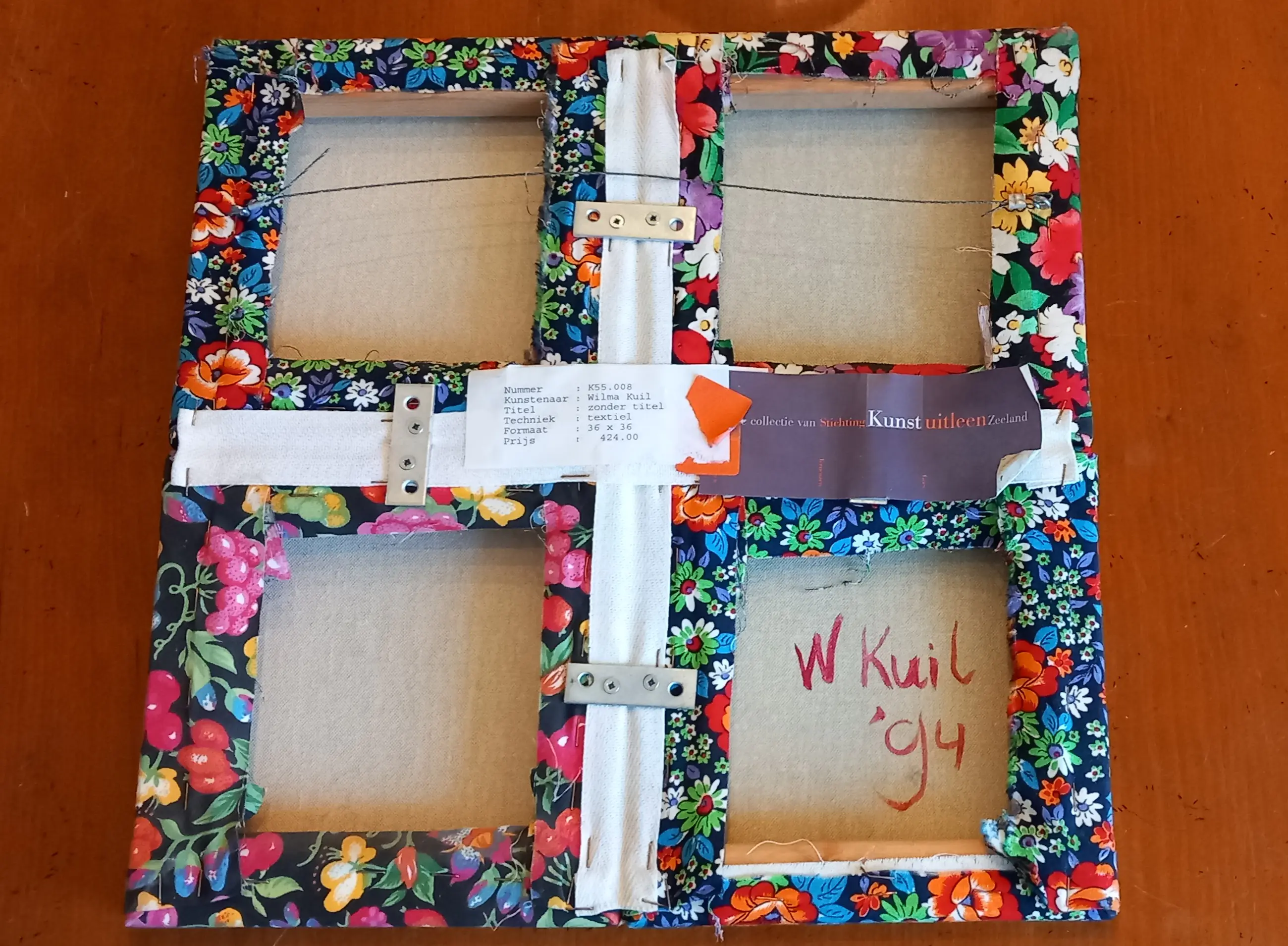 In goede staat textiel kunstwerk van Wilma Kuil. Gesigneerd '94.