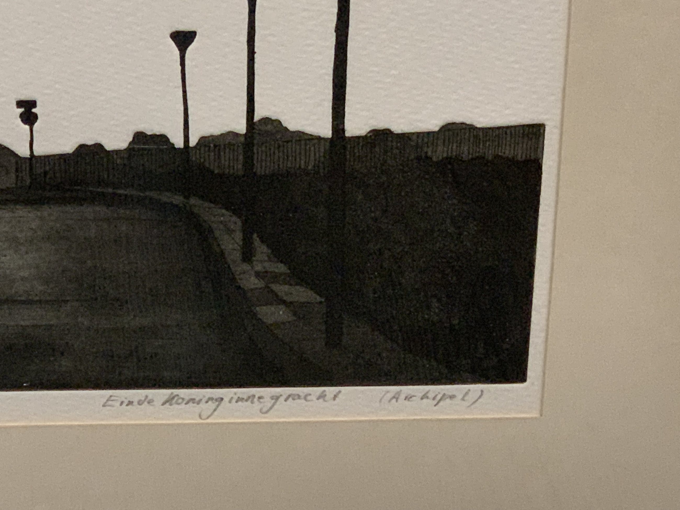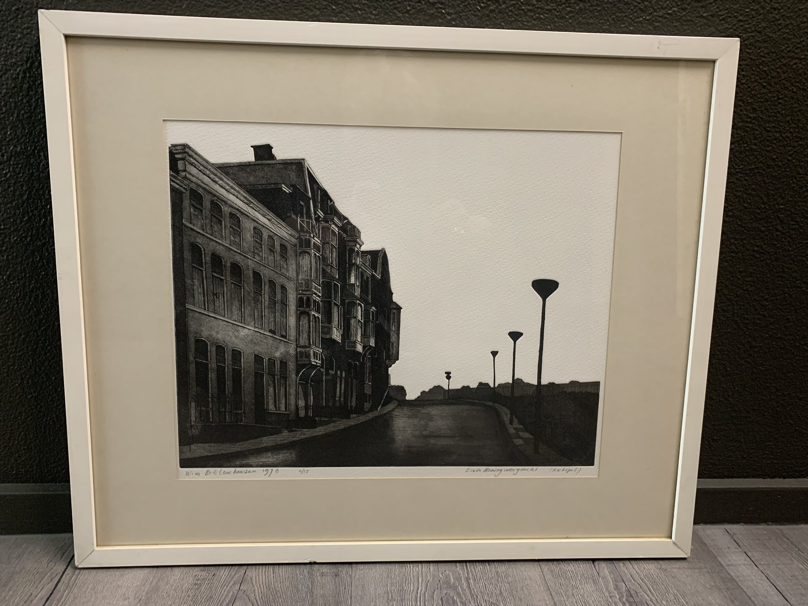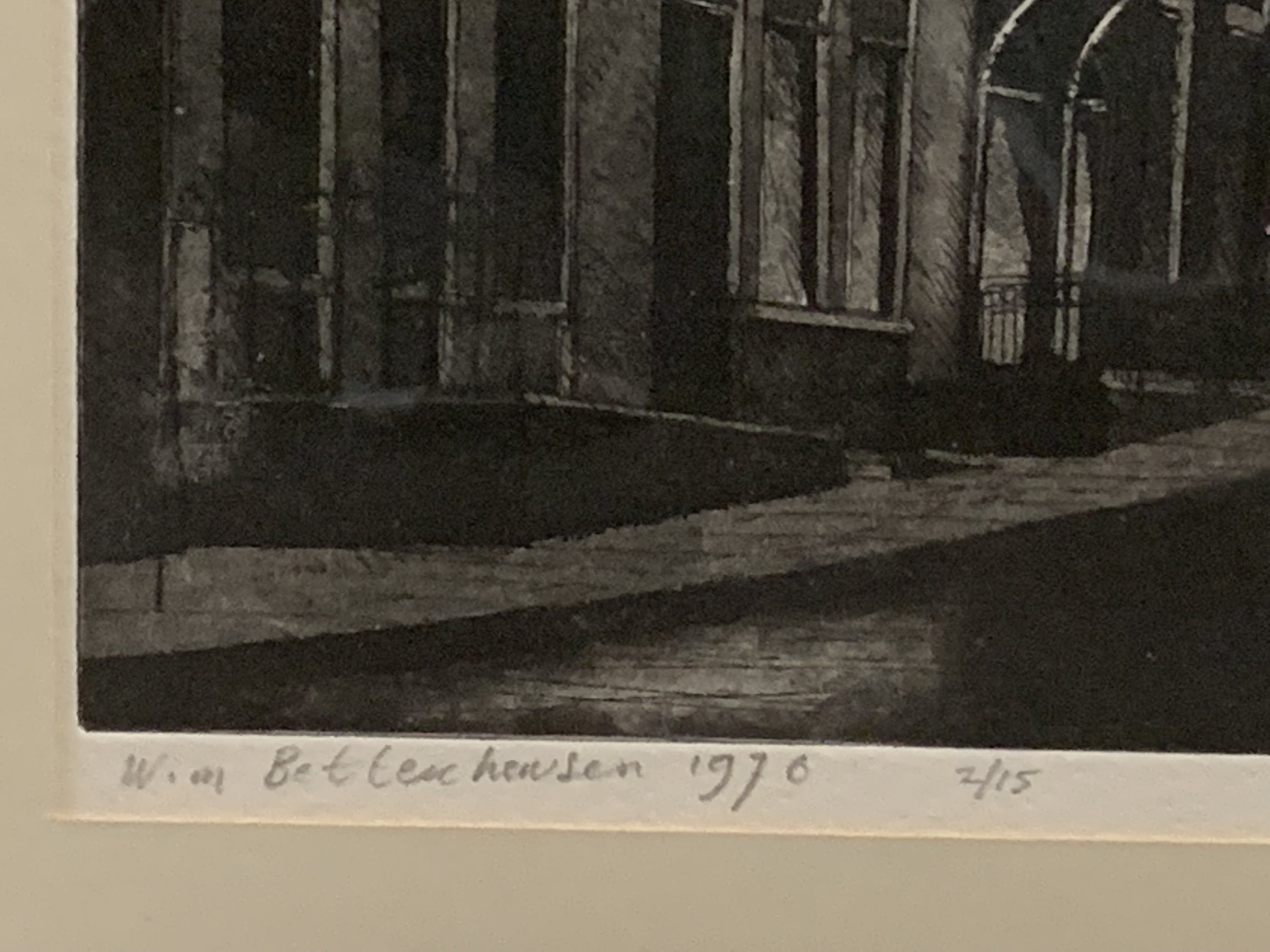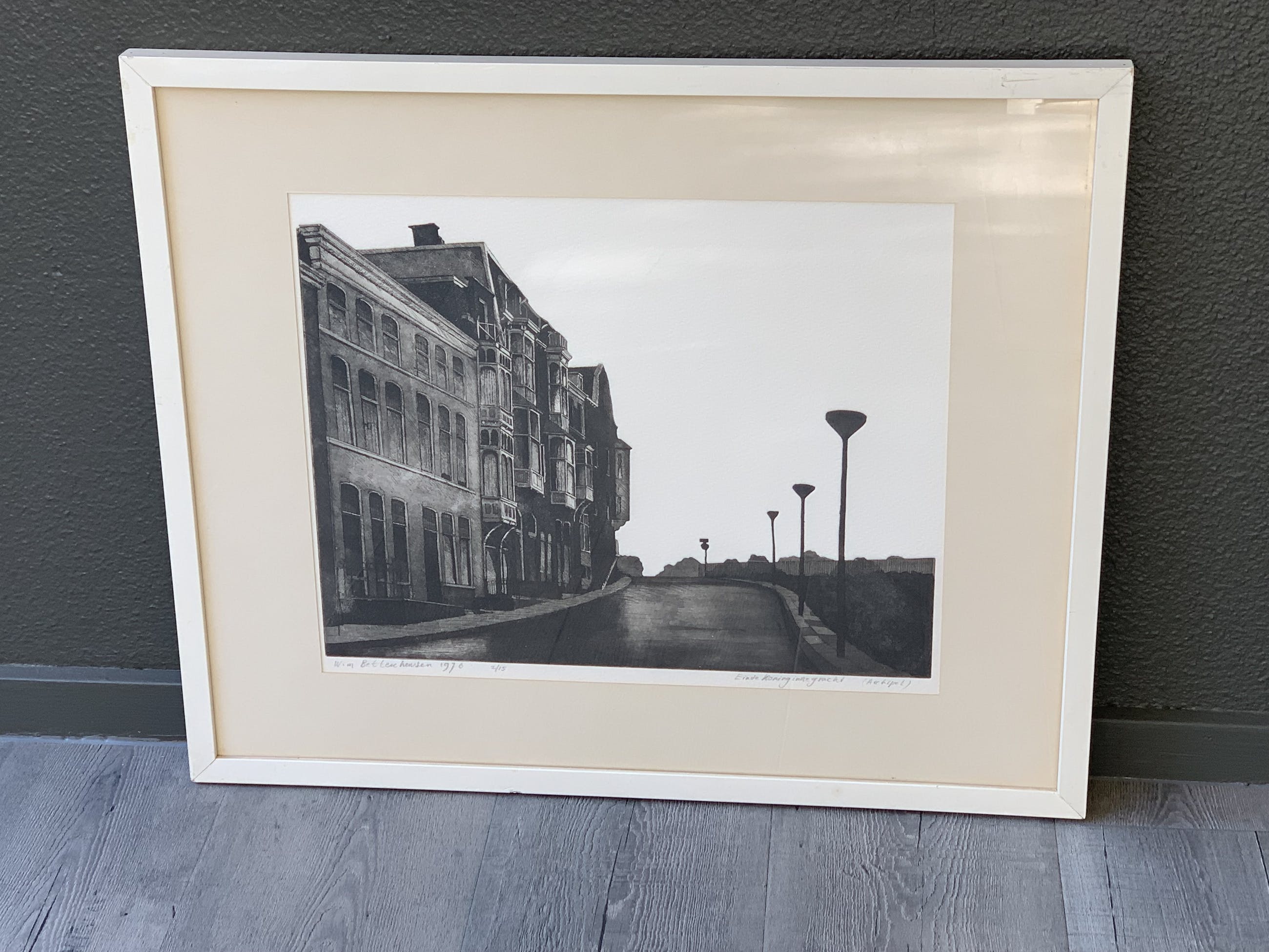 Een bij de Haagsche Kunstkring gekochte ets van Wim Bettenhausen (1942). Het favoriete onderwerp van deze zeer bekwame etser is Den Haag, waar hij de prachtige kanten van Den Haag in figuratieve etsen tot leven brengt. De ets betreft nummer 2 van slechts 15 etsen van een gezichtsbepalend deel van Den Haag.