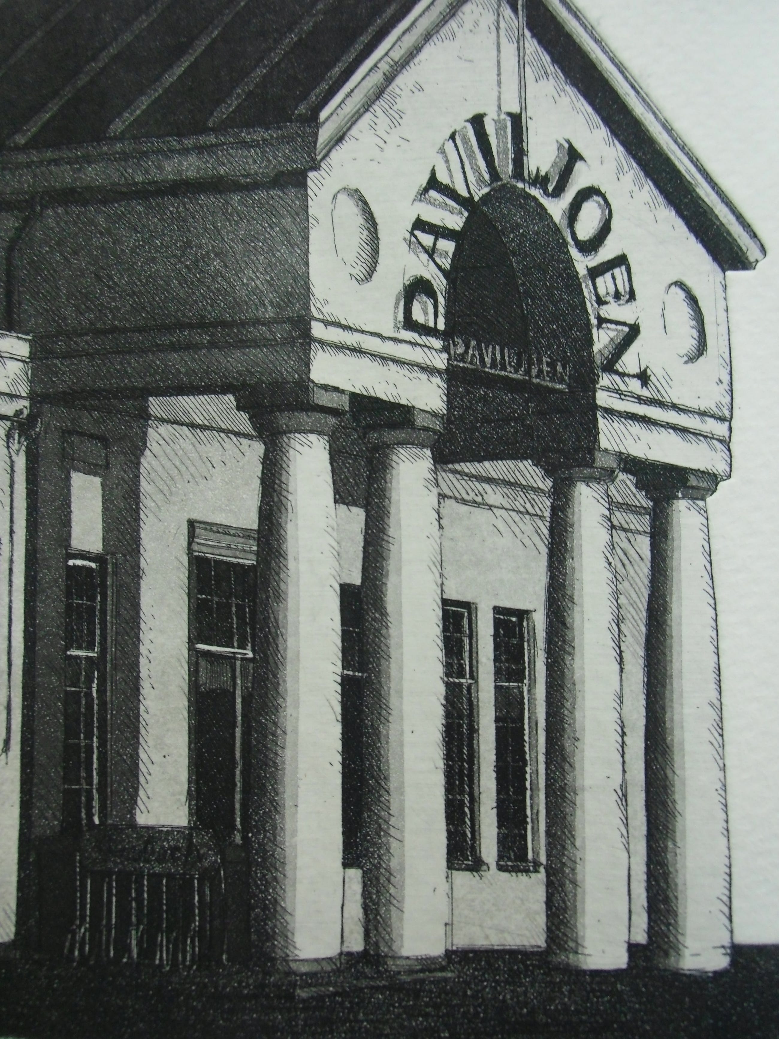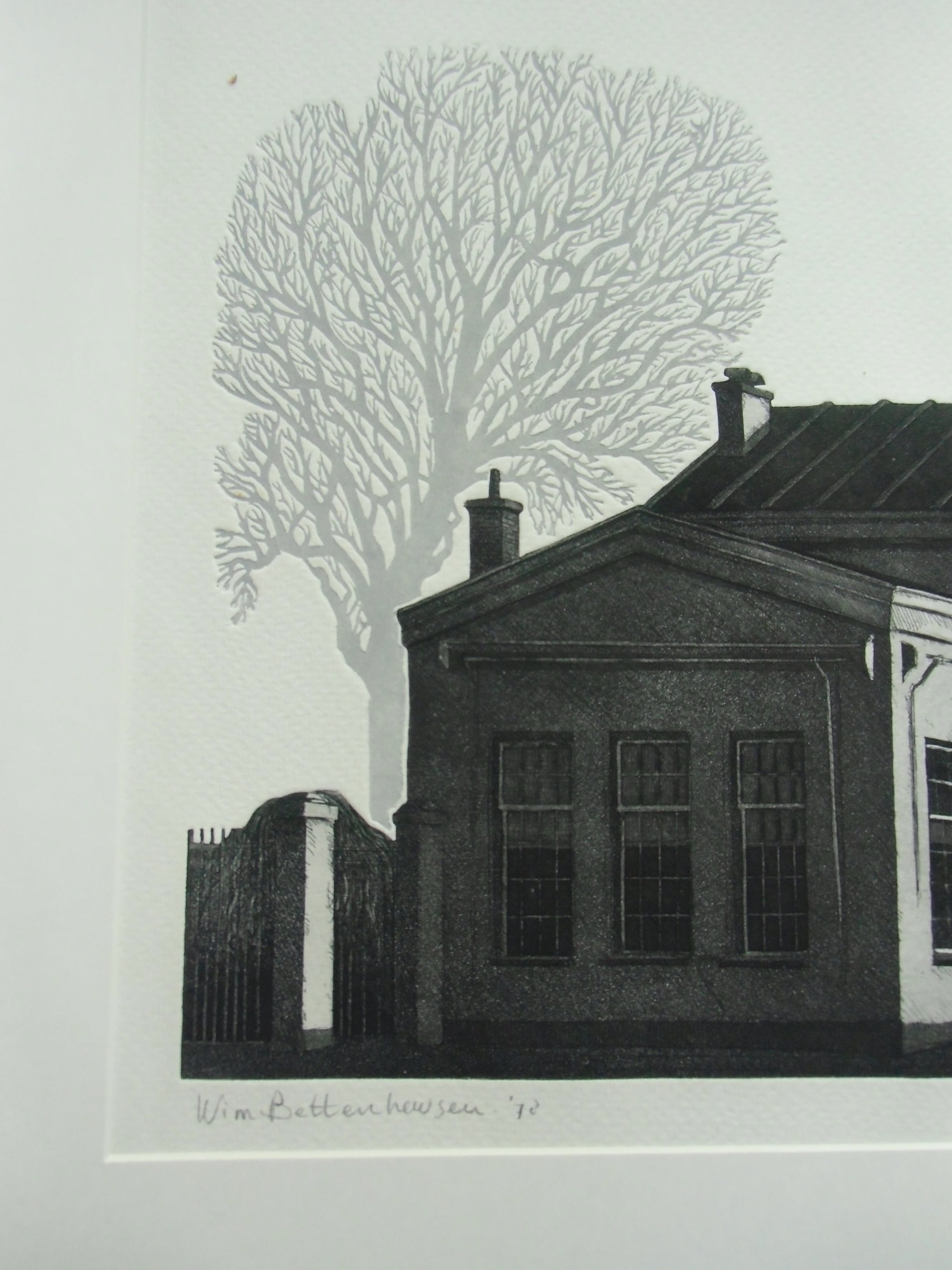 Deze karakteristieke ets/aquatint met reliëf dateert uit 1978. Het Wachtje aan het Rijswijkseplein in Den Haag is een Rijksmonument, dat in de periode 1933-1981 in gebruik was als café-restaurant Paviljoen. Onberispelijke staat.