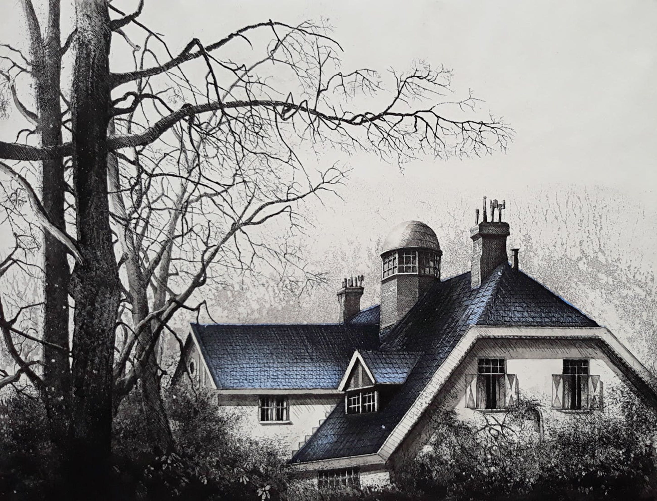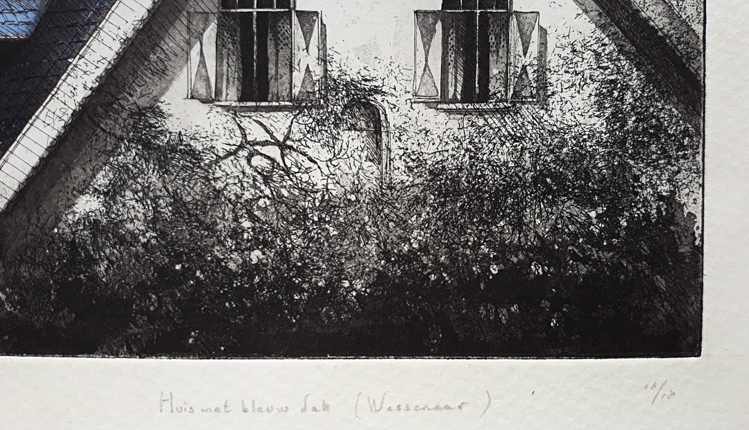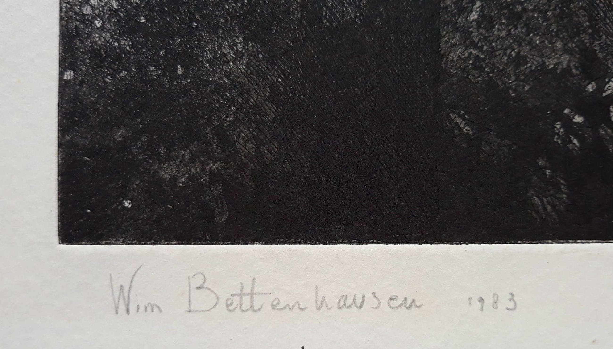 Zeer mooi, karakteristiek werk van Wim Bettenhausen. Aquatint ets op dik papier, met potlood gesigneerd, gedateerd (1983), getiteld/gesitueerd (Wassenaar) en genummerd (16/18). In uitstekende conditie.