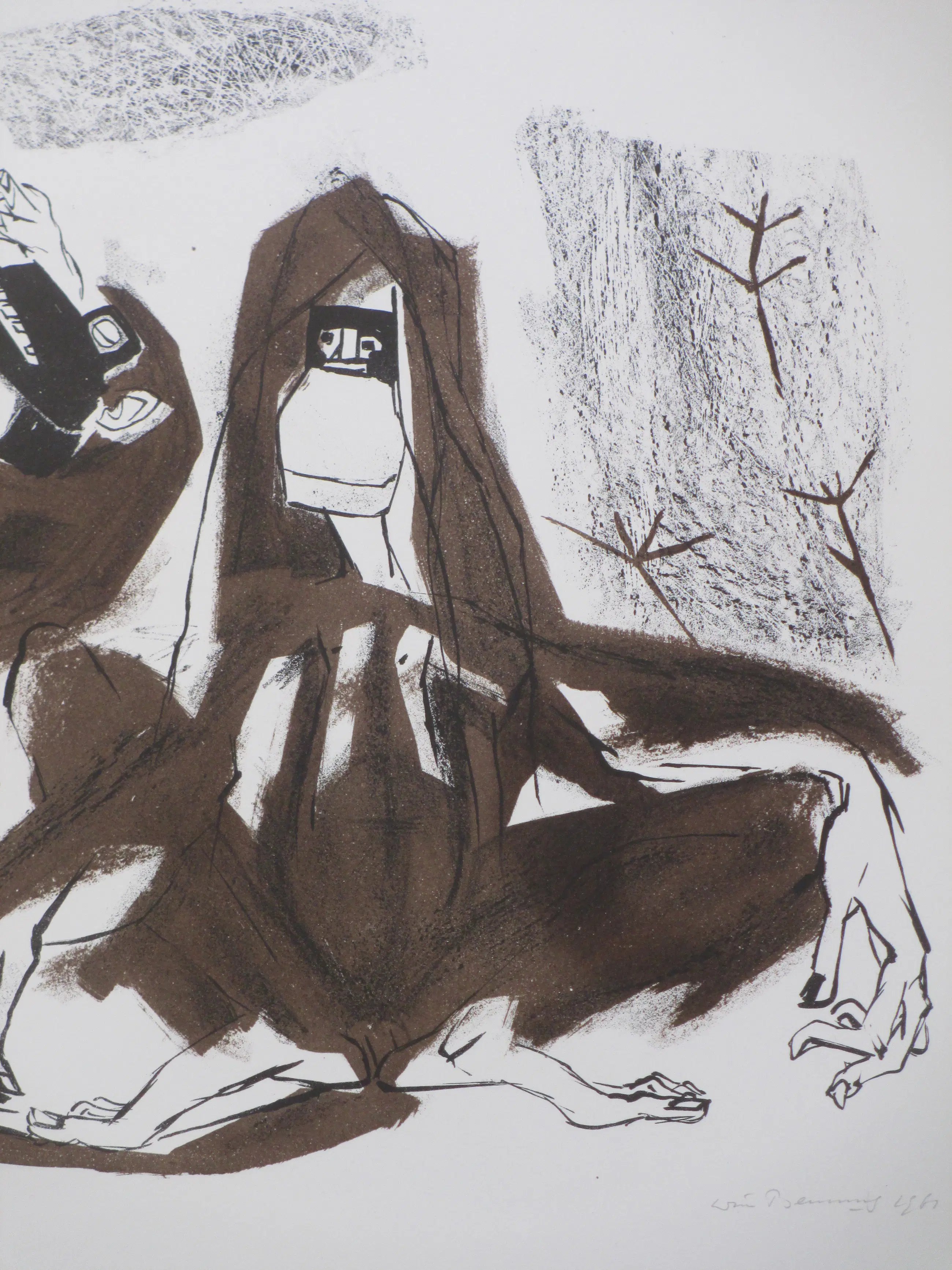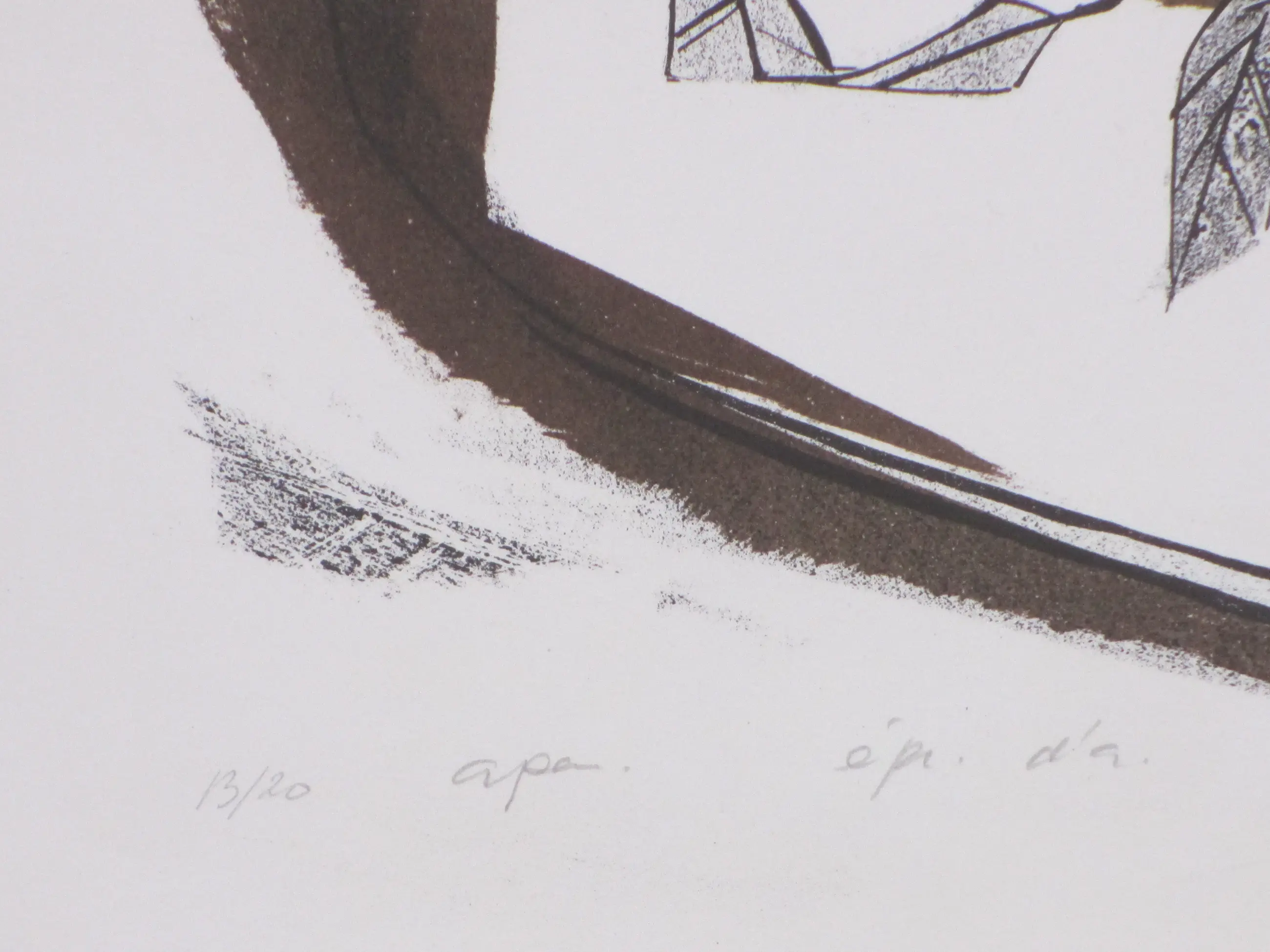 Kleurenlitho door Wim Beuning Voorstelling van twee apen Losbladig, beeldmaat 35x44, bladmaat 48x64 Gesigneerd en gedateerd in potlood r.o.: 'Wim Beuning 1961' Genummerd, getiteld en annotatie in potlood l.o.: '13/20 Apen' en 'epr. d'a' Authenticiteit volledig gegarandeerd
