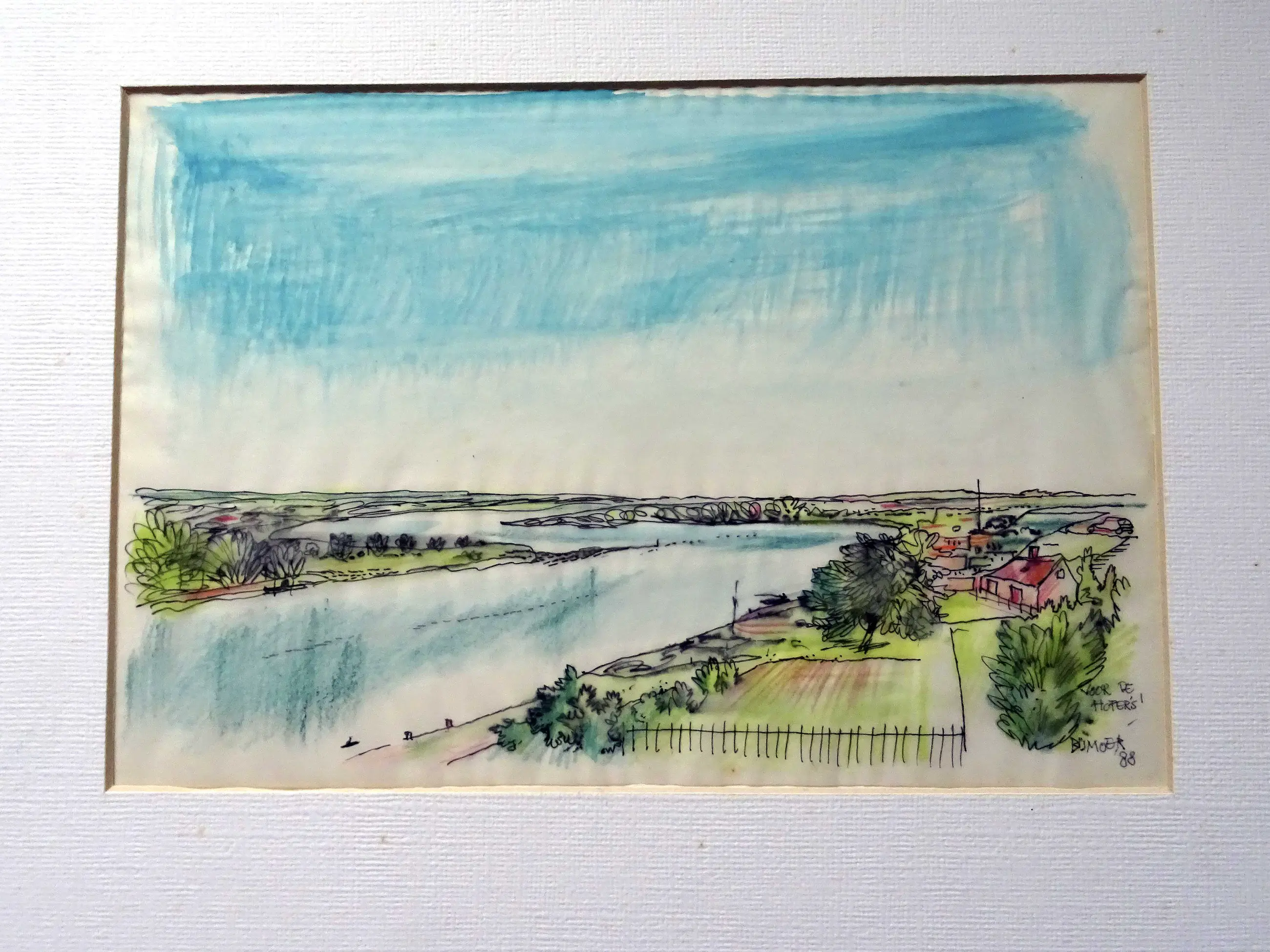 Mooie ingekleurde stifttekening van prachtige landschap. Met handtekening en een persoonlijke aantekening.
