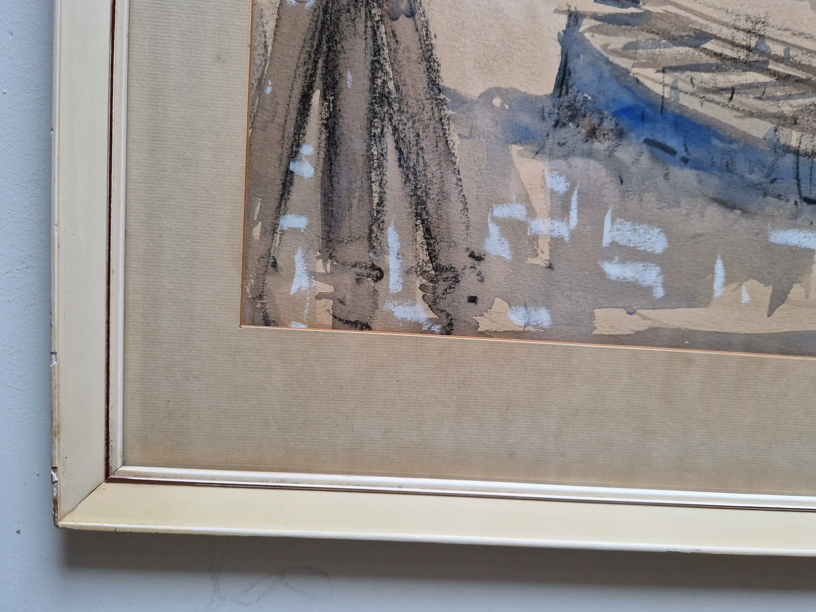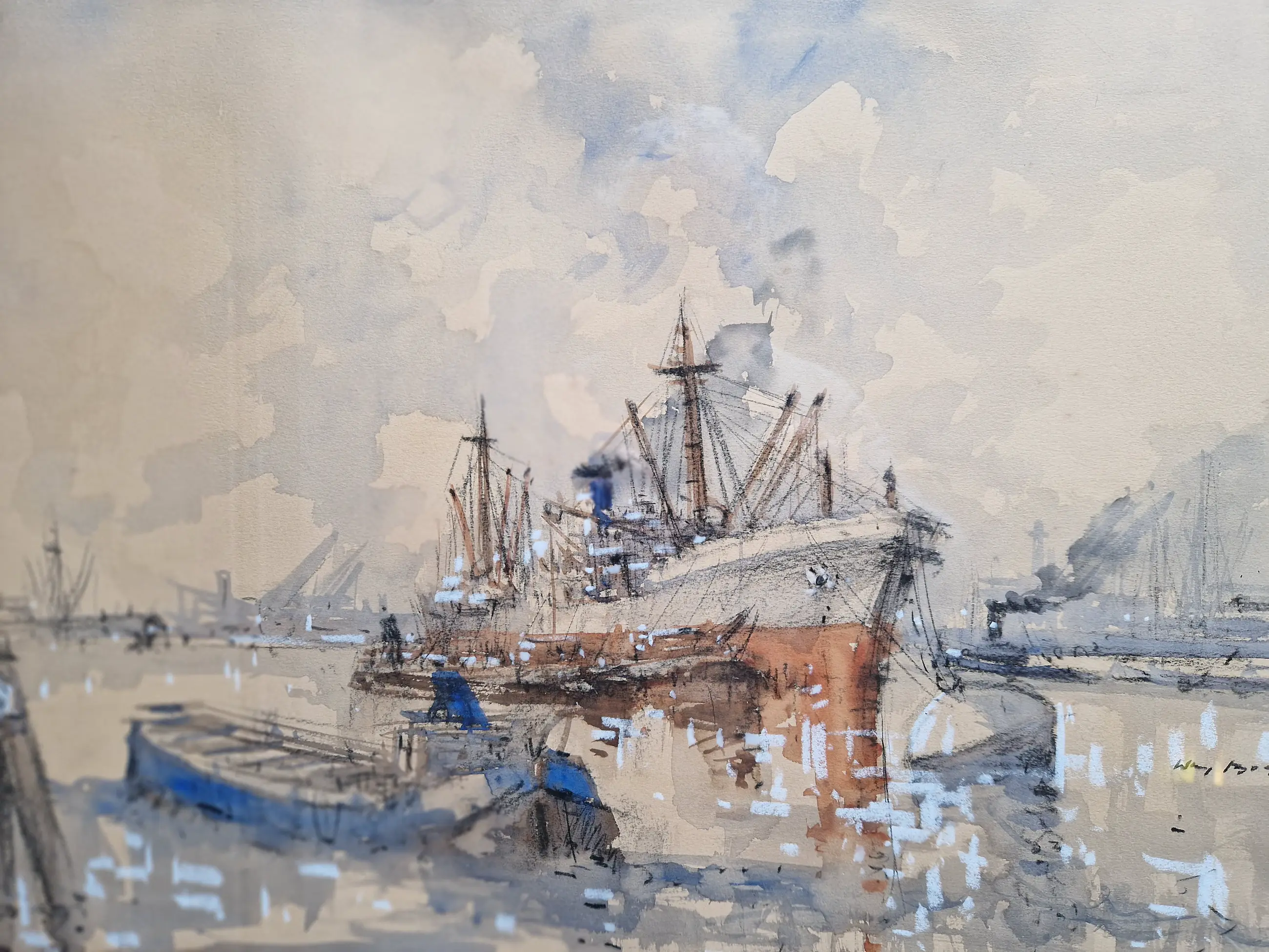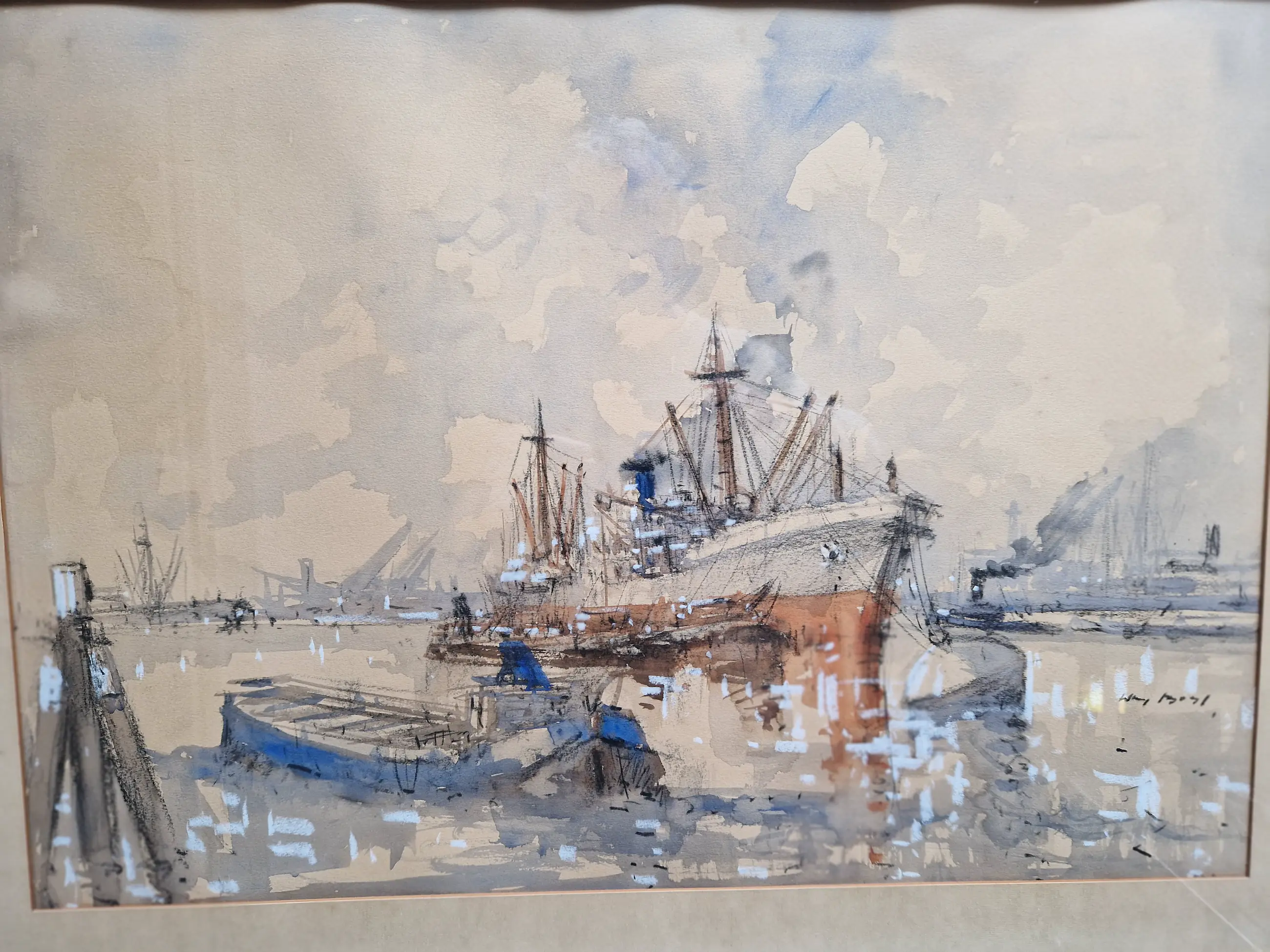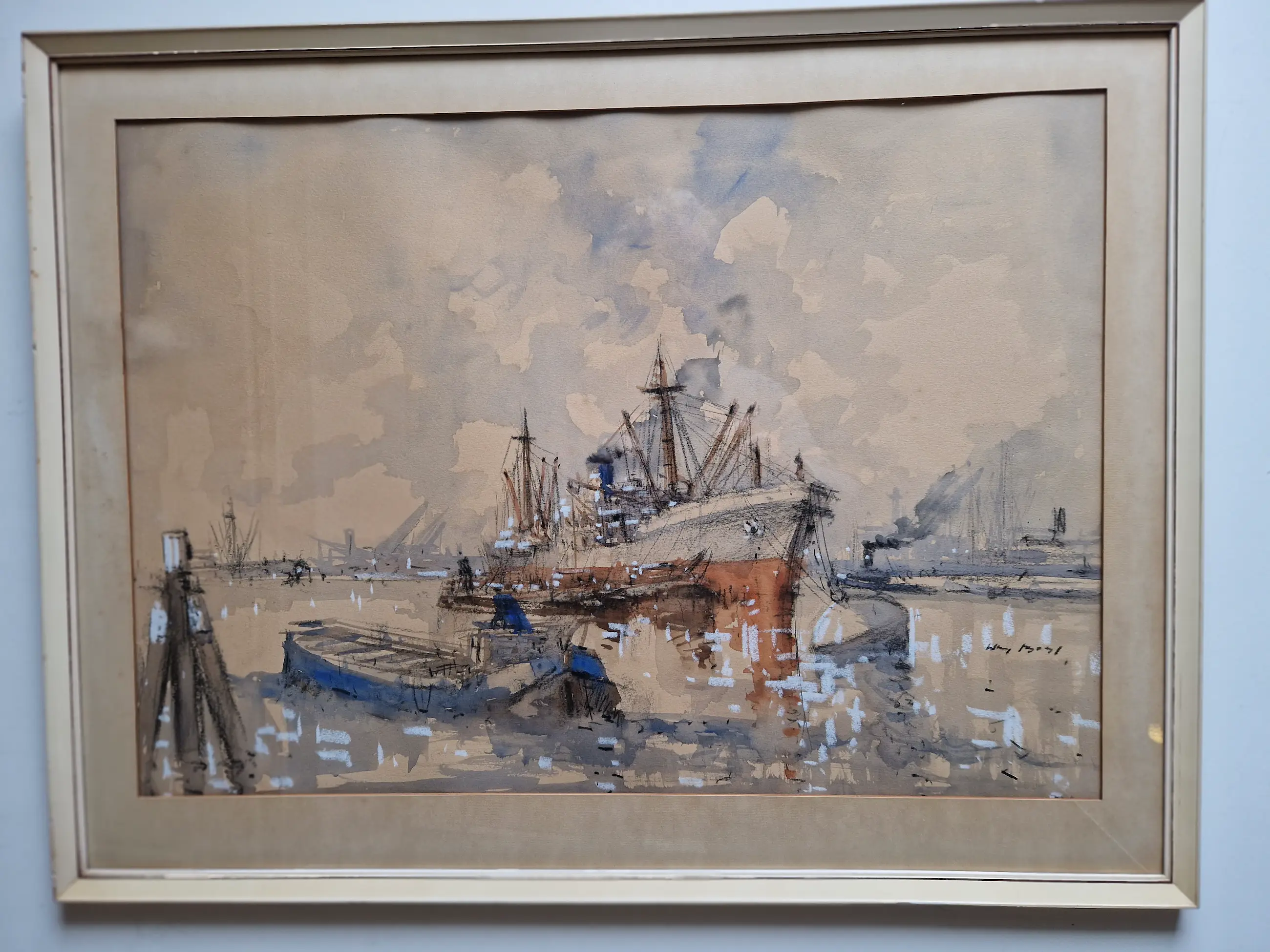 Heel fraai en karakteristiek werk van de bekende havenschilder Wim Bos (1906-1974). Het werk zelf verkeert in prima staat, de lijst heeft tijdssporen, maar is wel de originele. De passe-partout is wat vlekkerig geworden, maar niet storend en is eenvoudig te vervangen.