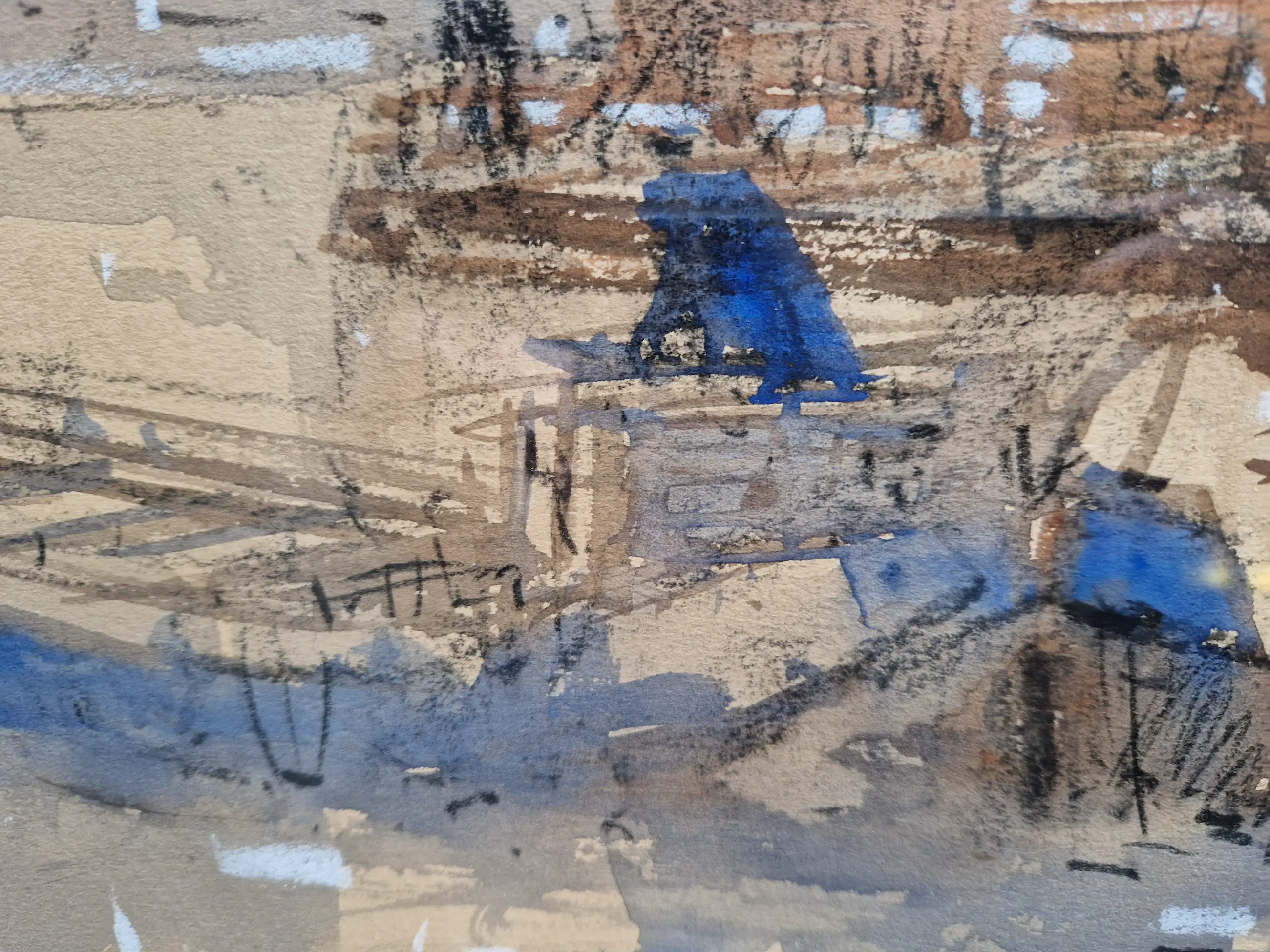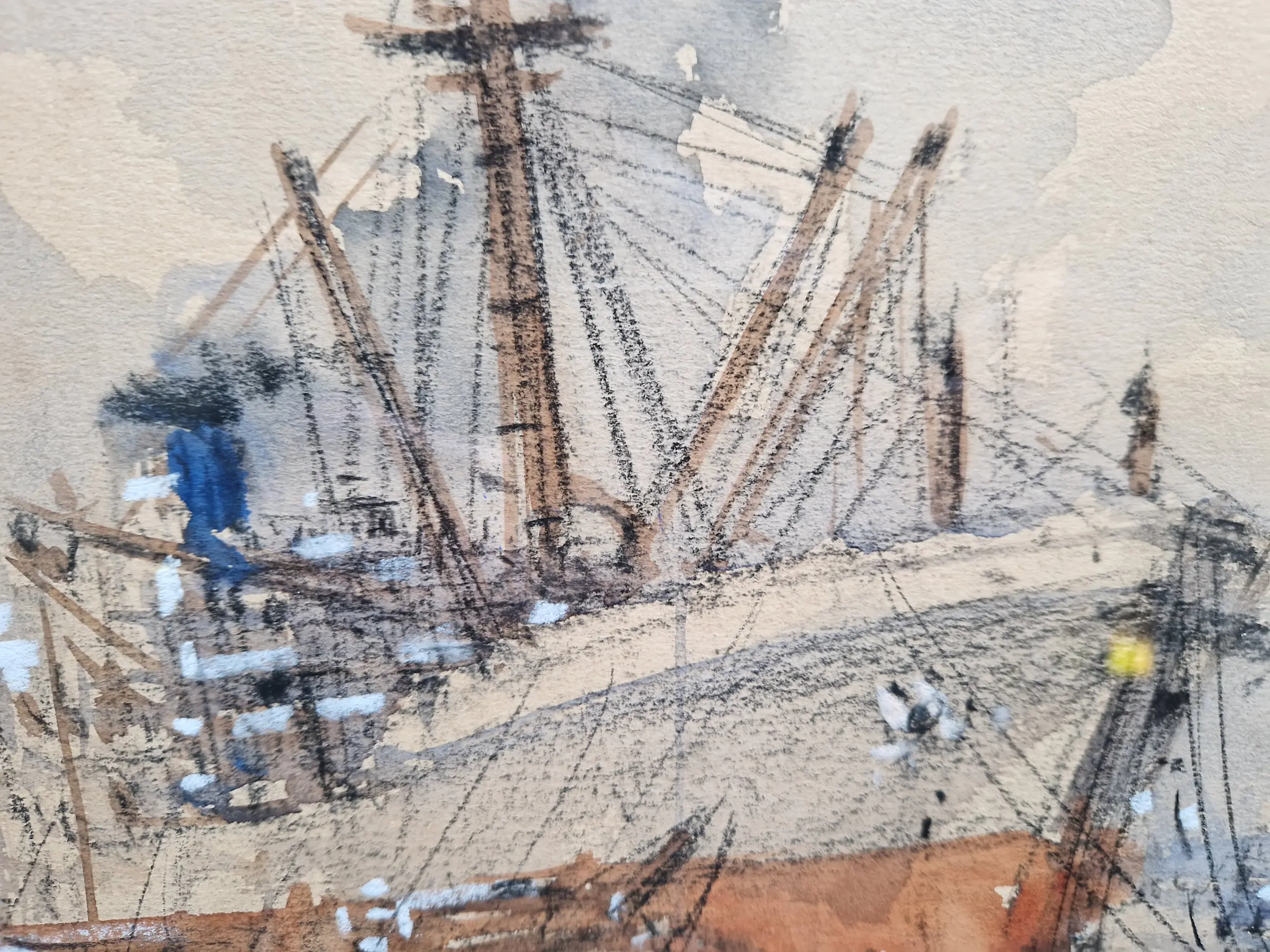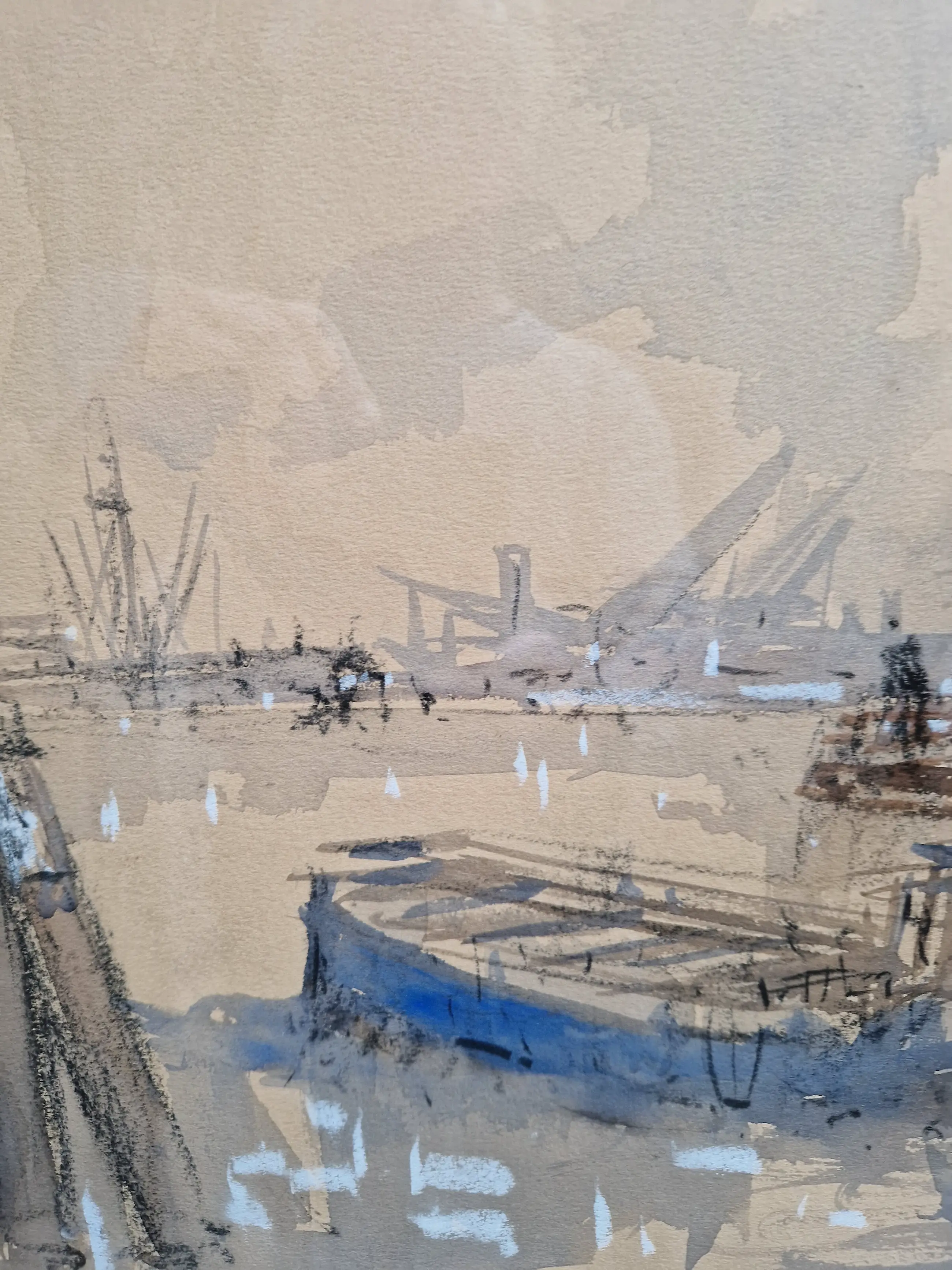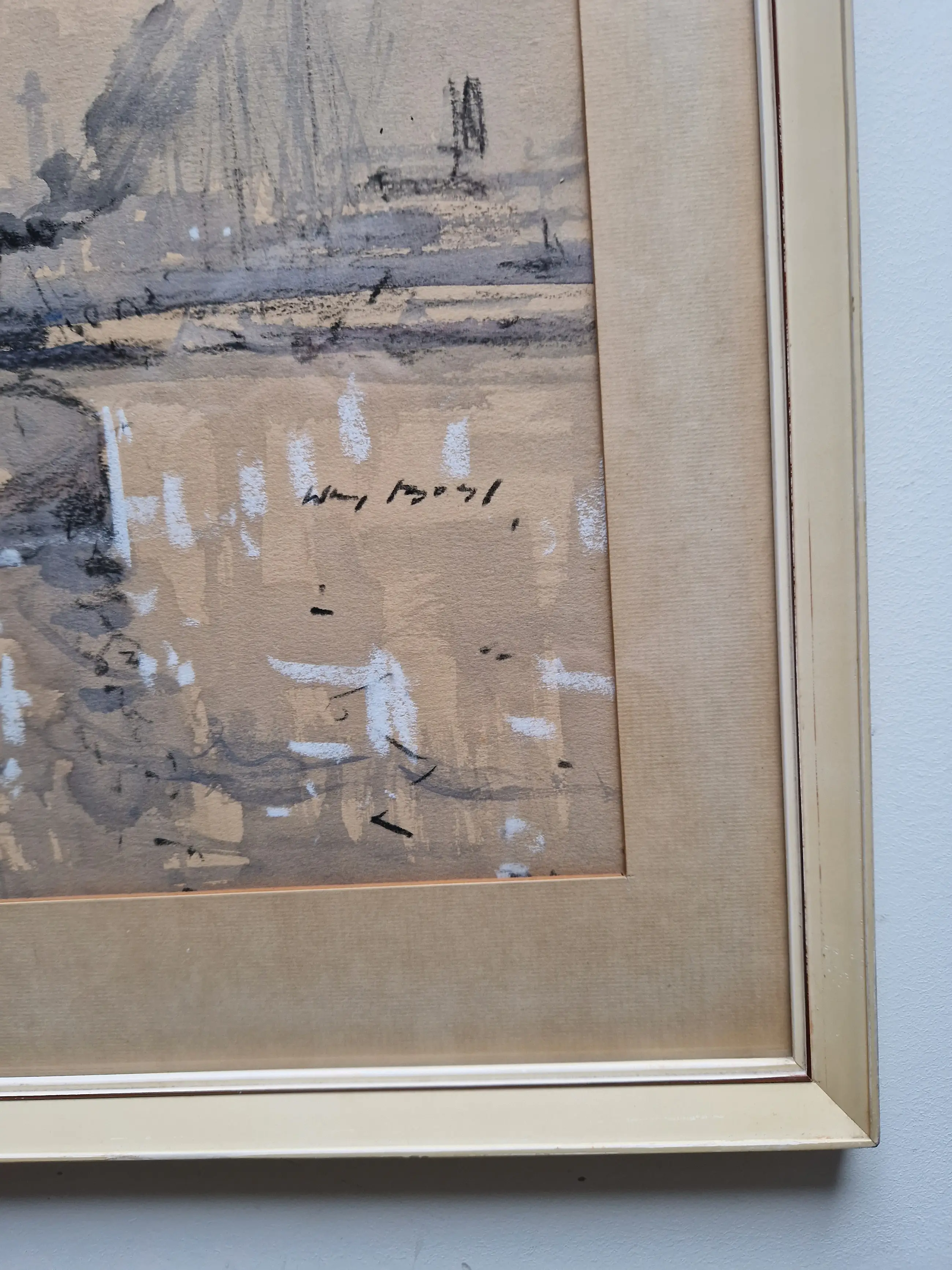 Heel fraai en karakteristiek werk van de bekende havenschilder Wim Bos (1906-1974). Het werk zelf verkeert in prima staat, de lijst heeft tijdssporen, maar is wel de originele. De passe-partout is wat vlekkerig geworden, maar niet storend en is eenvoudig te vervangen.