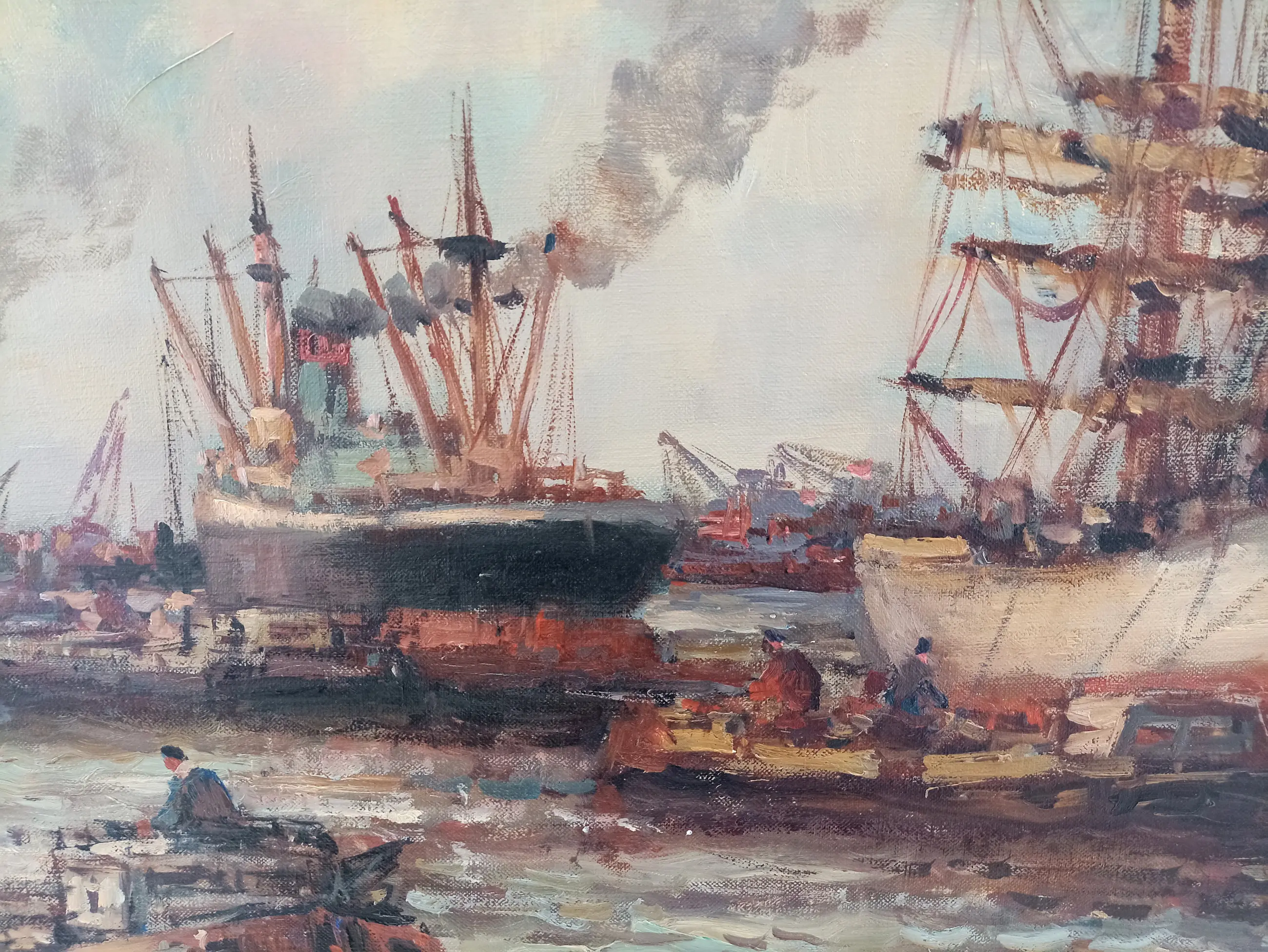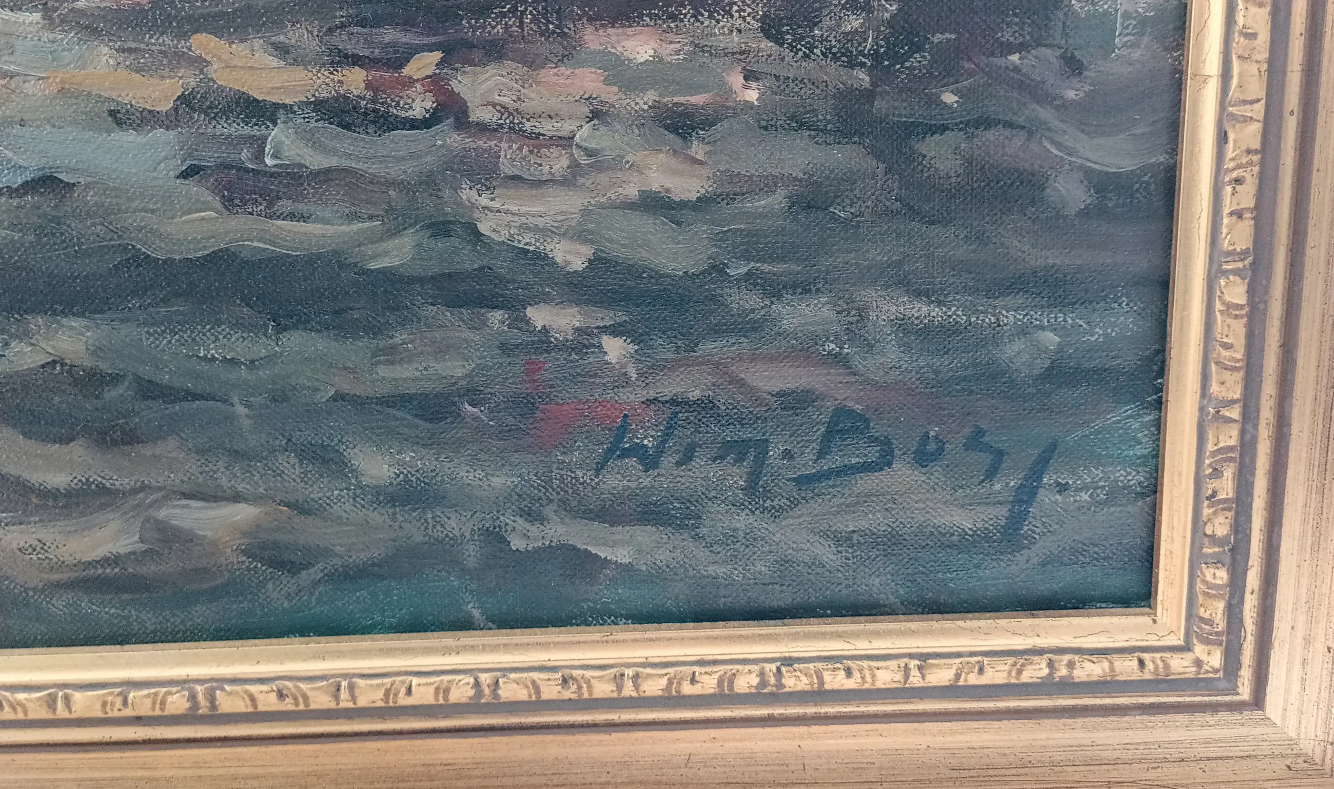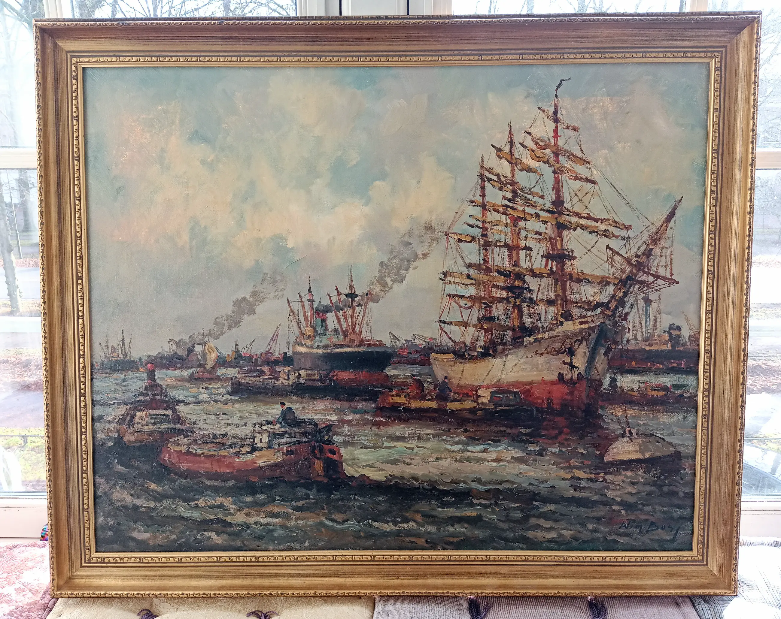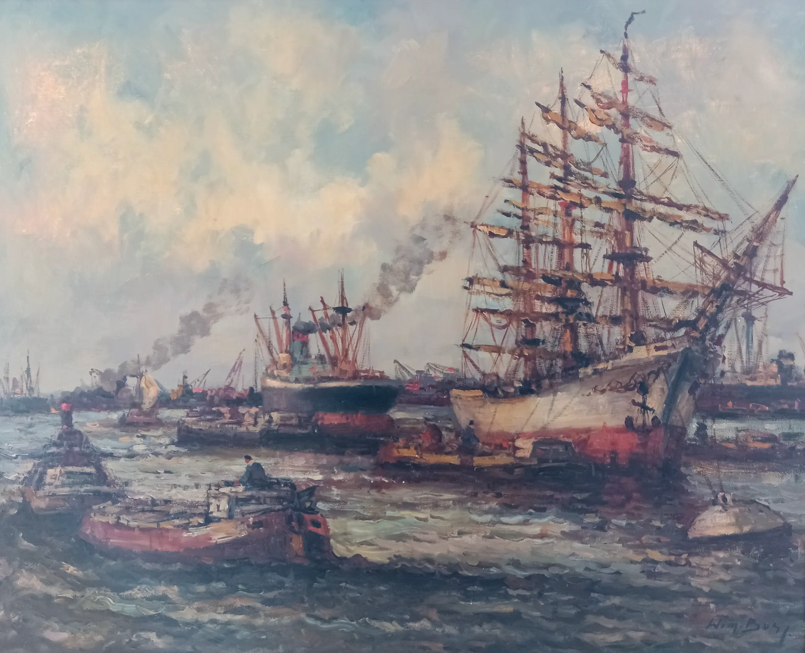 Dit werk is van de Nederlandse kunstenaar Wim Bos (1906-1974). Op het grote doek zijn stoomboten en een driemaster te zien met een haven op de achtergrond. Het werk is 80 x 100 cm (94 x 114 cm incl. lijst), rechtsonder gesigneerd en in goede staat.