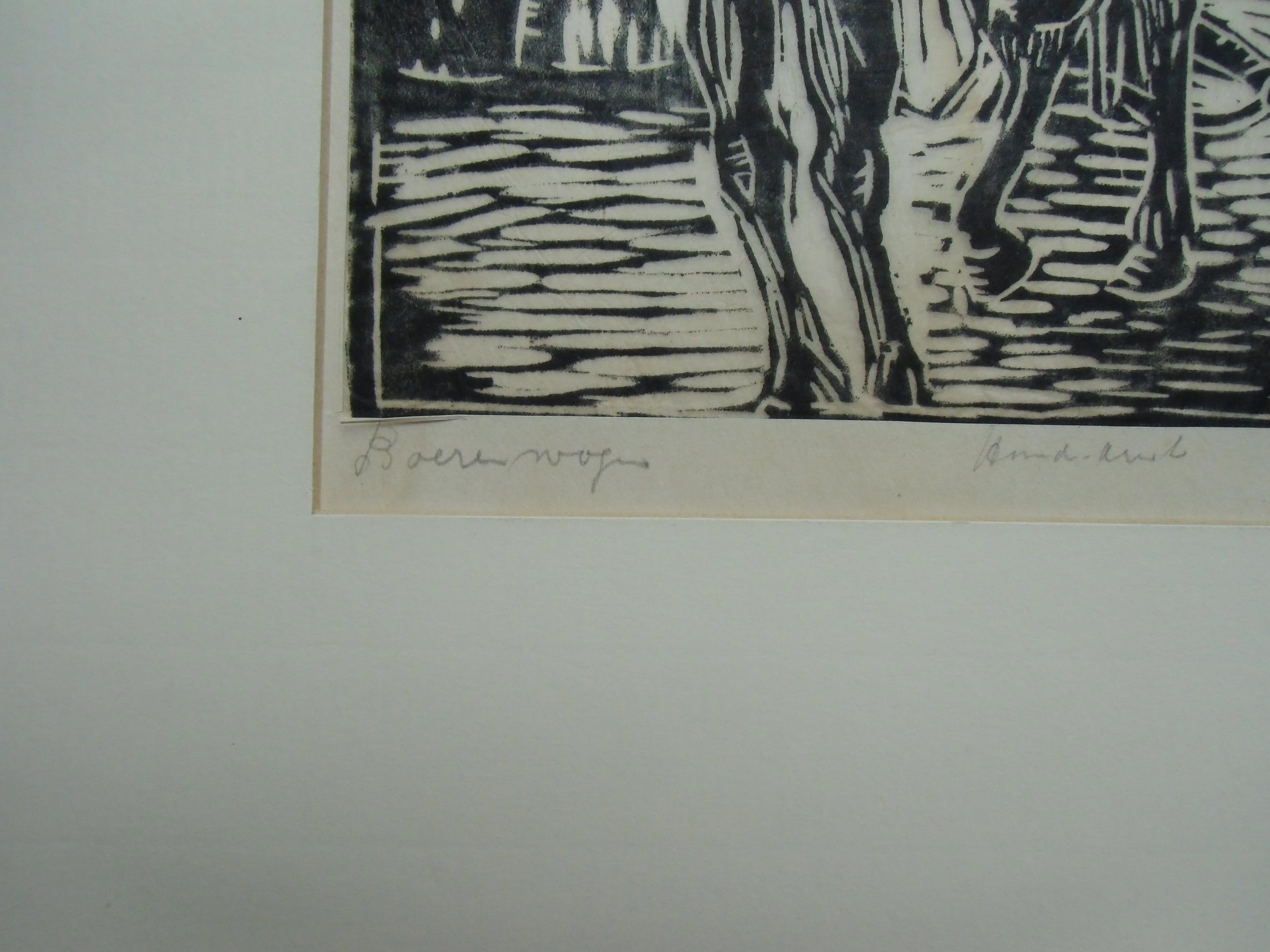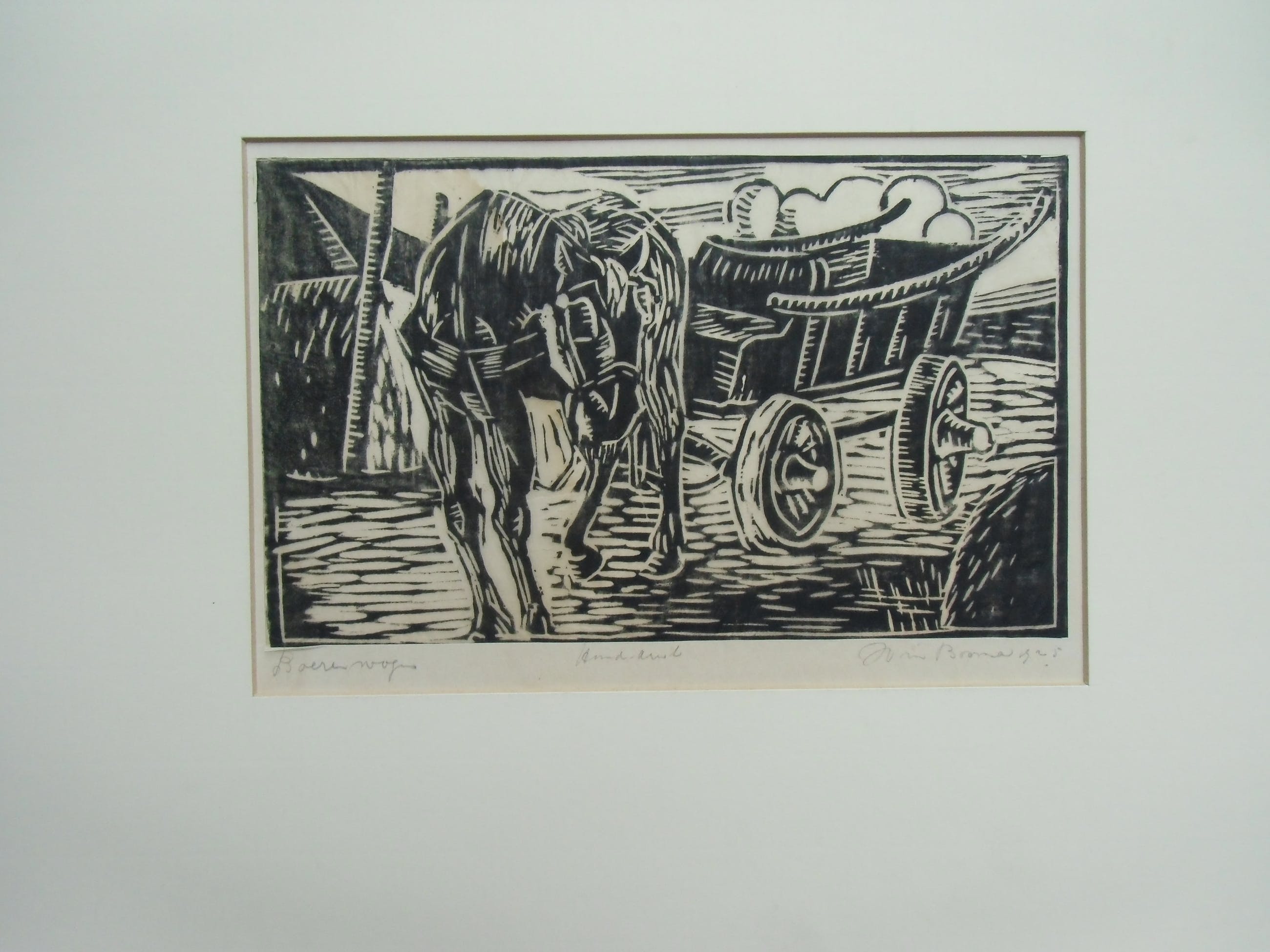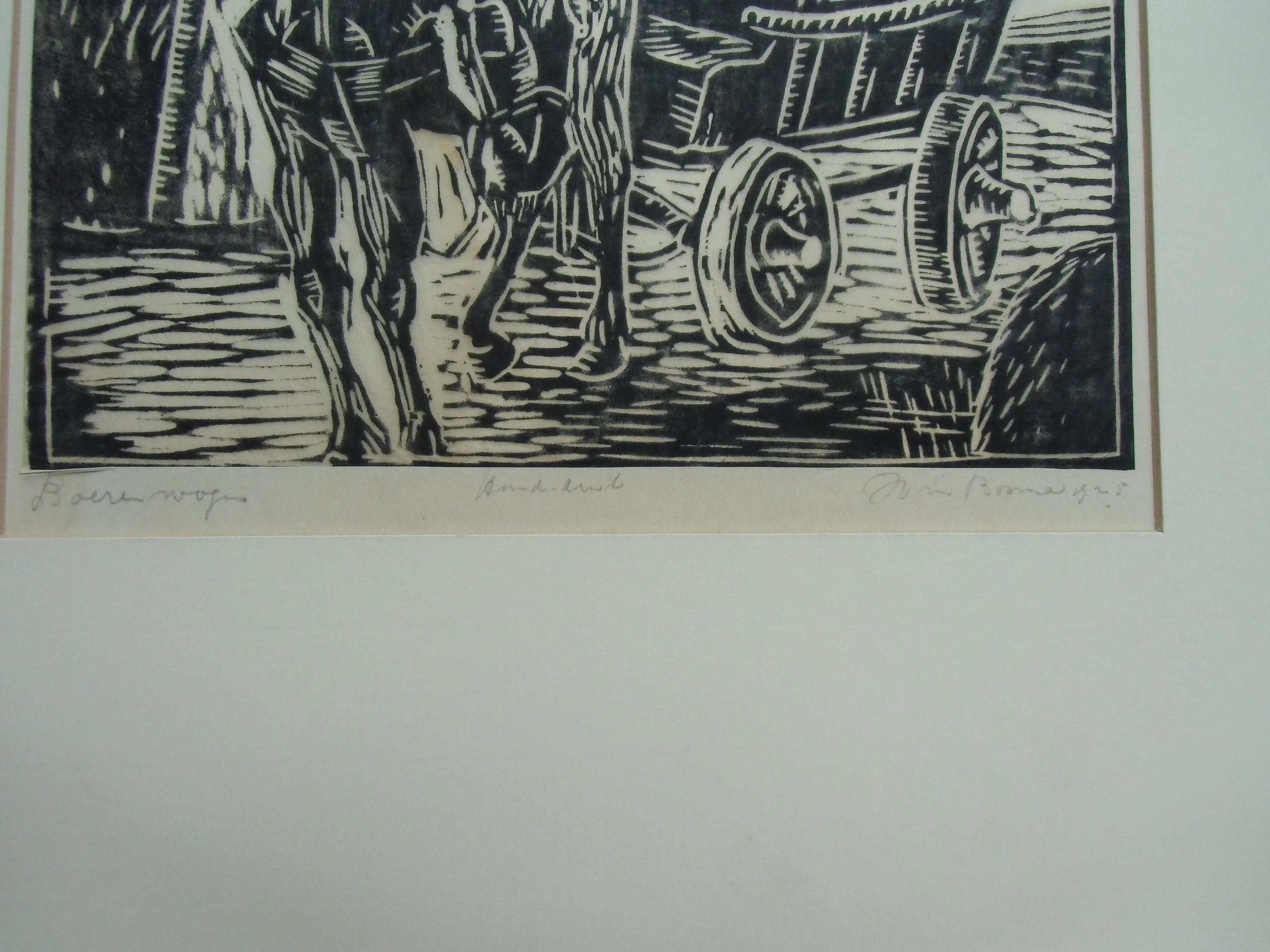 Deze houtsnede is afkomstig uit de voorraad van de kunsthandel van wijlen Roland Jansen.Zijn begeleidende tekst op het passepartout luidt als volgt:Boerenwagen. Houtsnede in zwart en wit. Handdruk.Afdruk op dun papier. Met potlood getekend op het passepartout. Zeldzaam.