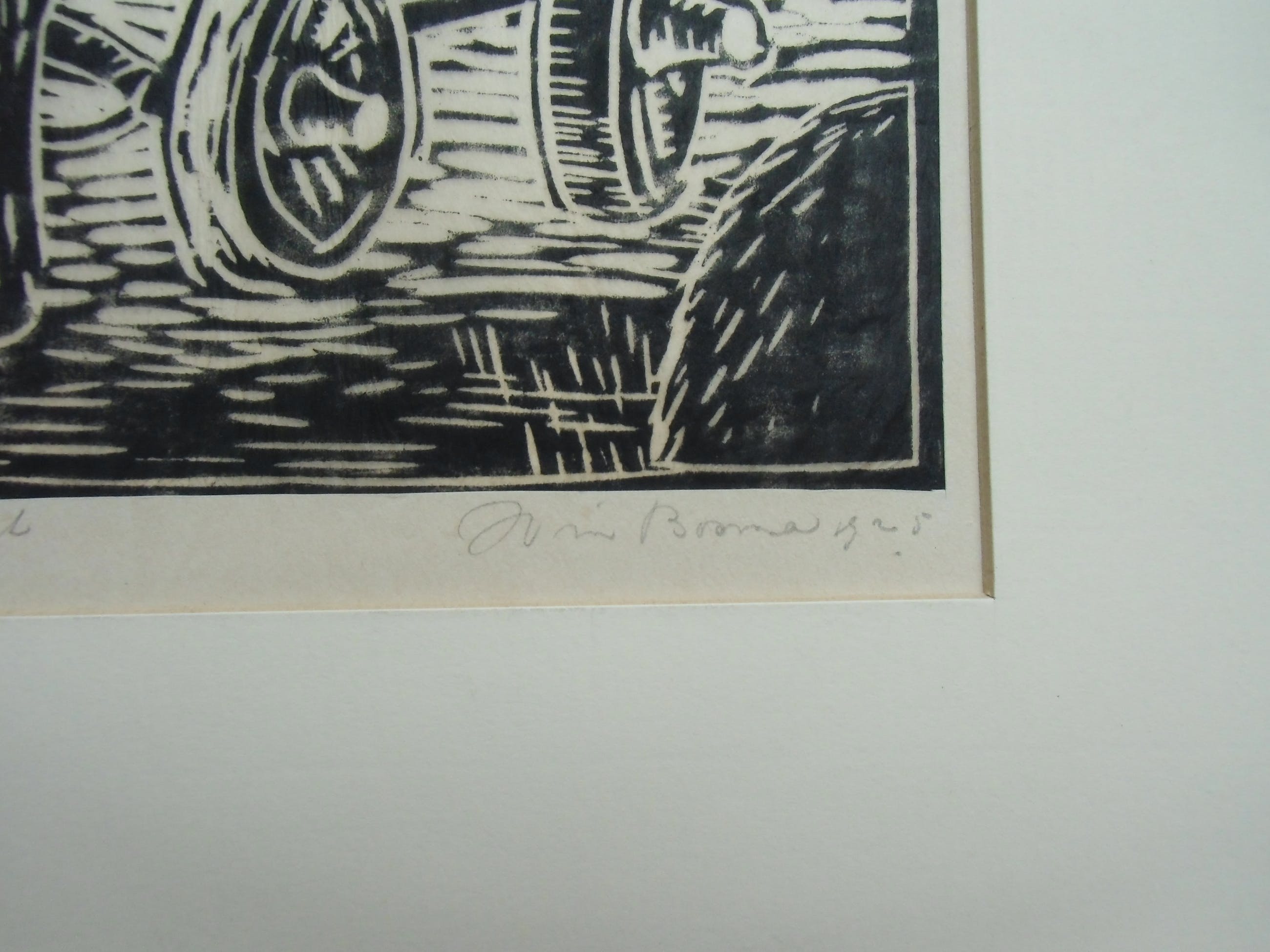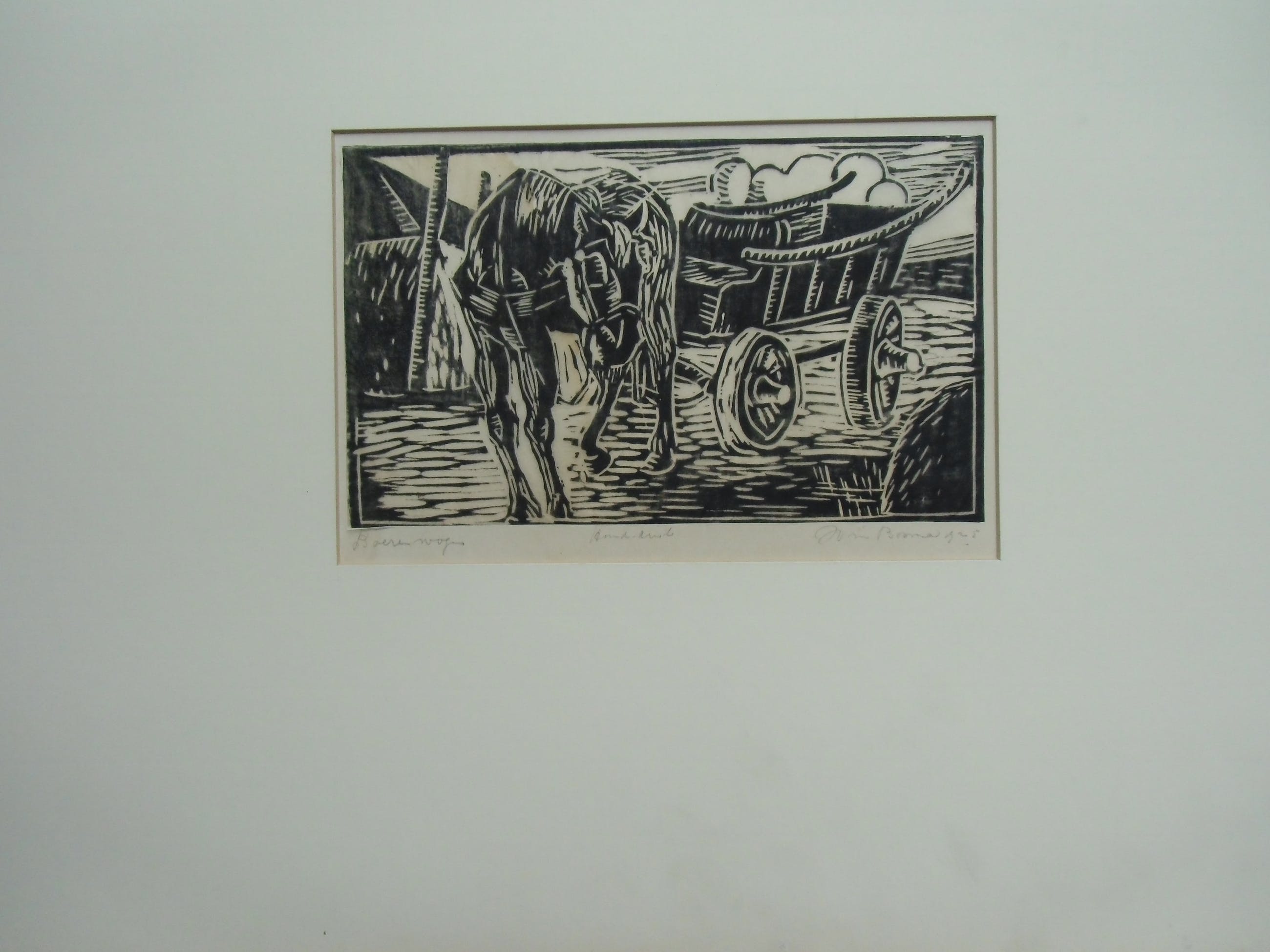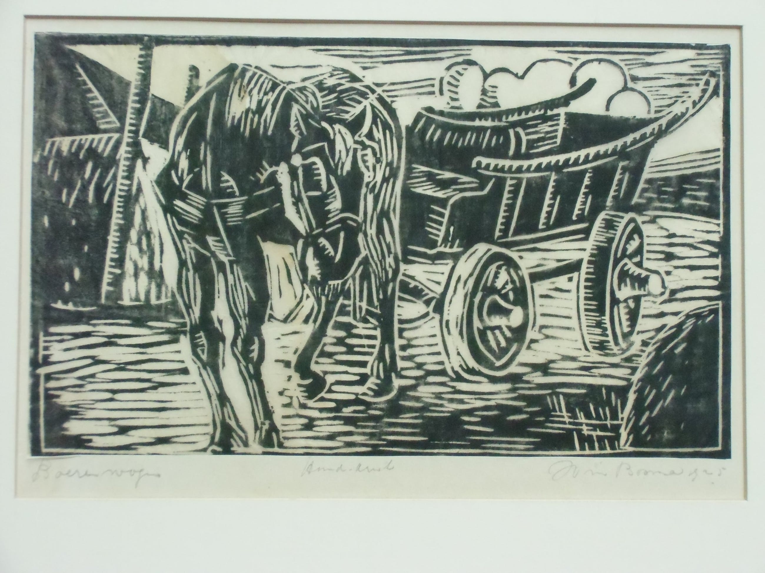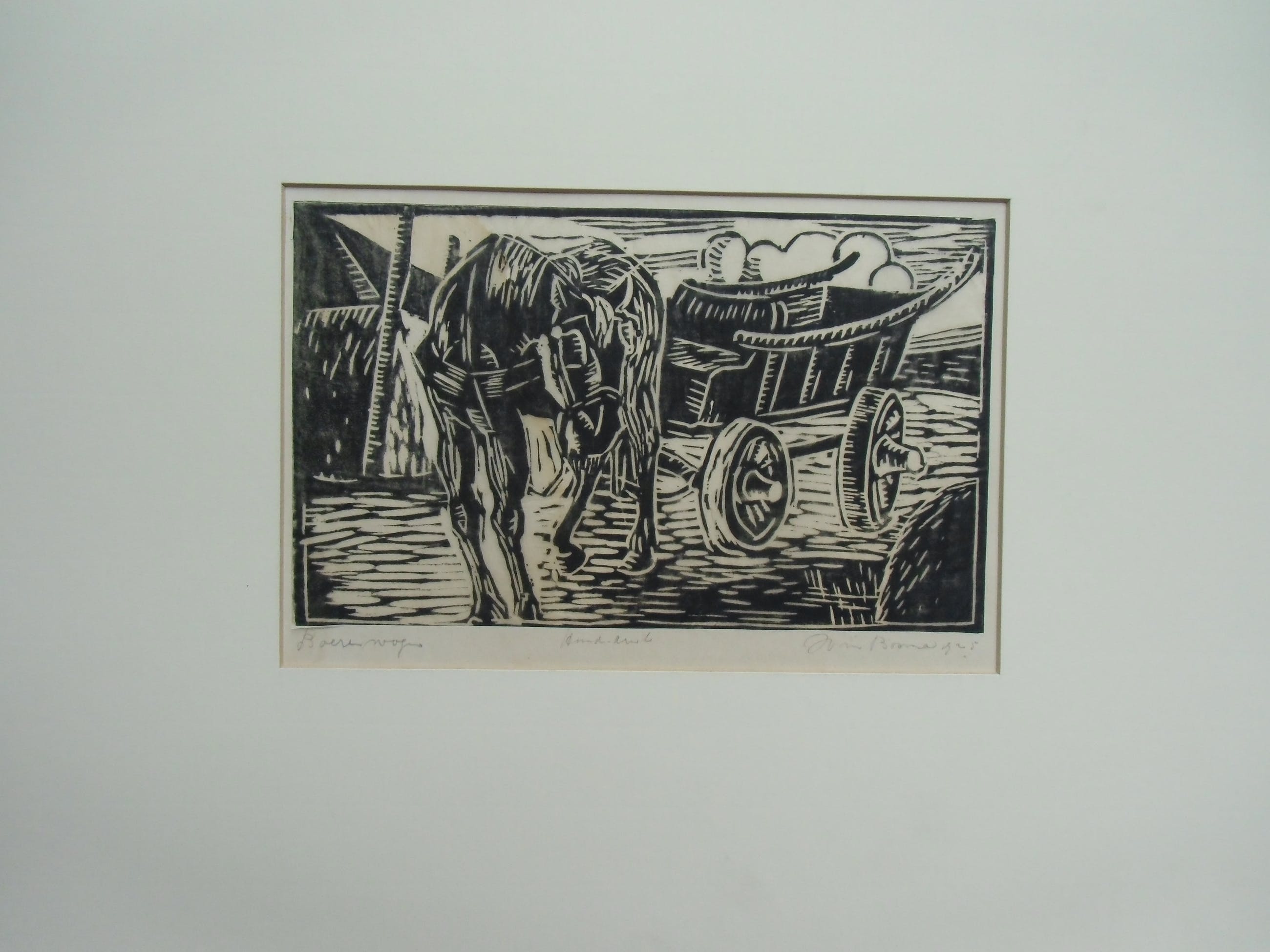 Deze houtsnede is afkomstig uit de voorraad van de kunsthandel van wijlen Roland Jansen.Zijn begeleidende tekst op het passepartout luidt als volgt:Boerenwagen. Houtsnede in zwart en wit. Handdruk.Afdruk op dun papier. Met potlood getekend op het passepartout. Zeldzaam.