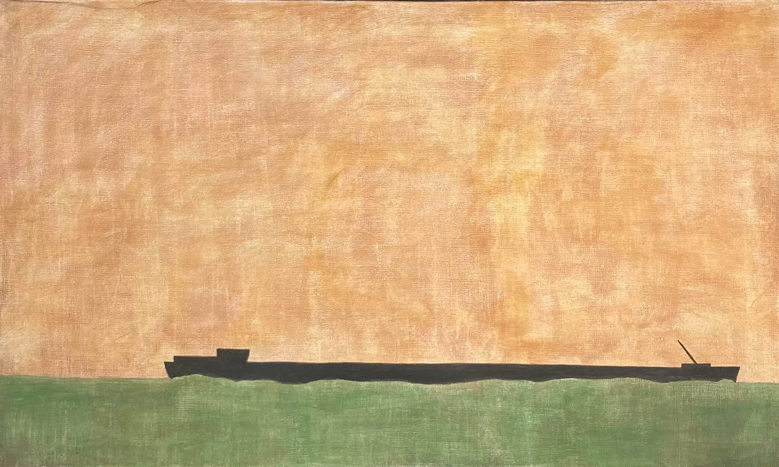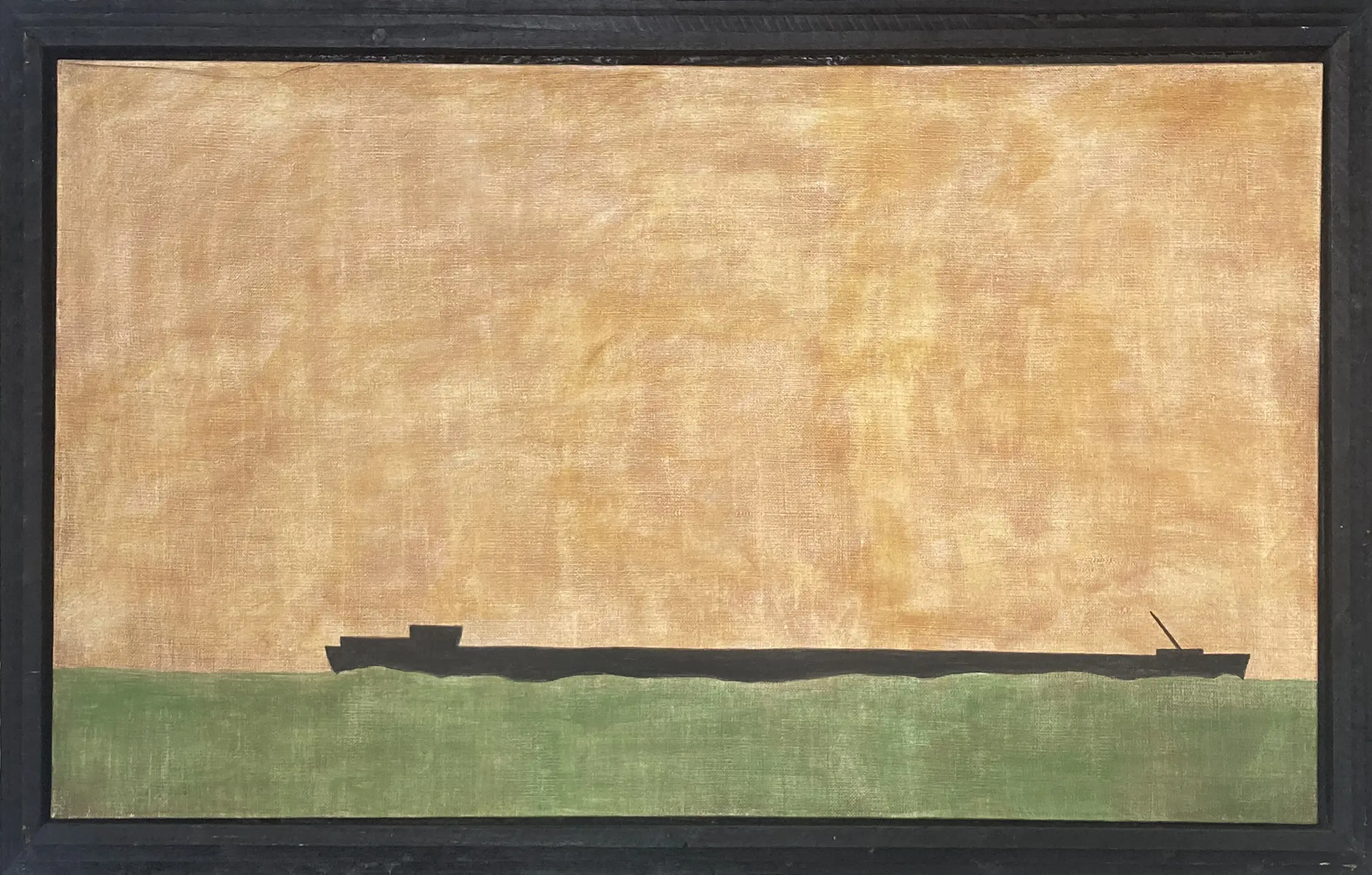 Groot schilderij van acrylverf op jute met een schip tegen een oranje-groene achtergrond. Verso gesigneerd. Het werk is ingelijst in een grove, zwartgeverfde  maar verder onbewerkte lijst.
