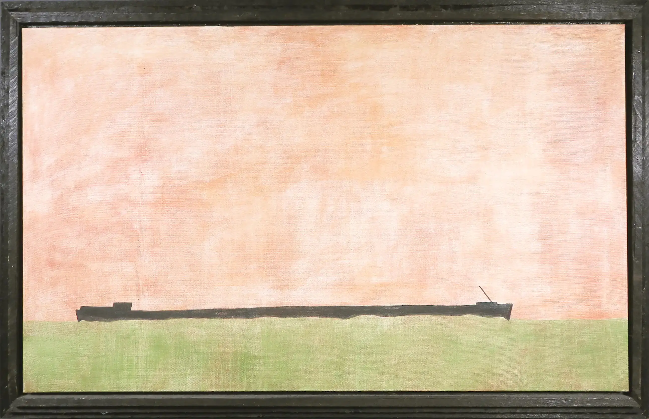 Groot schilderij van acrylverf op jute met een schip tegen een groen-oranje achtergrond. Verso gesigneerd. Het werk is ingelijst in een grove, zwartgeverfde maar verder onbewerkte lijst.