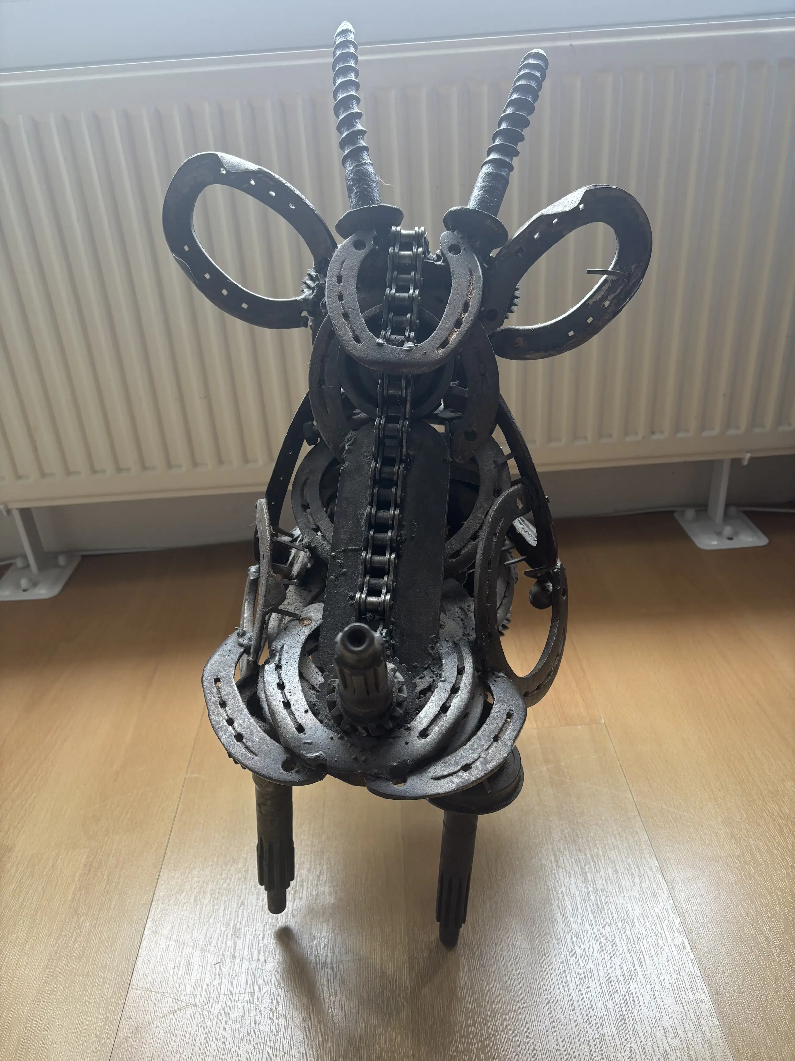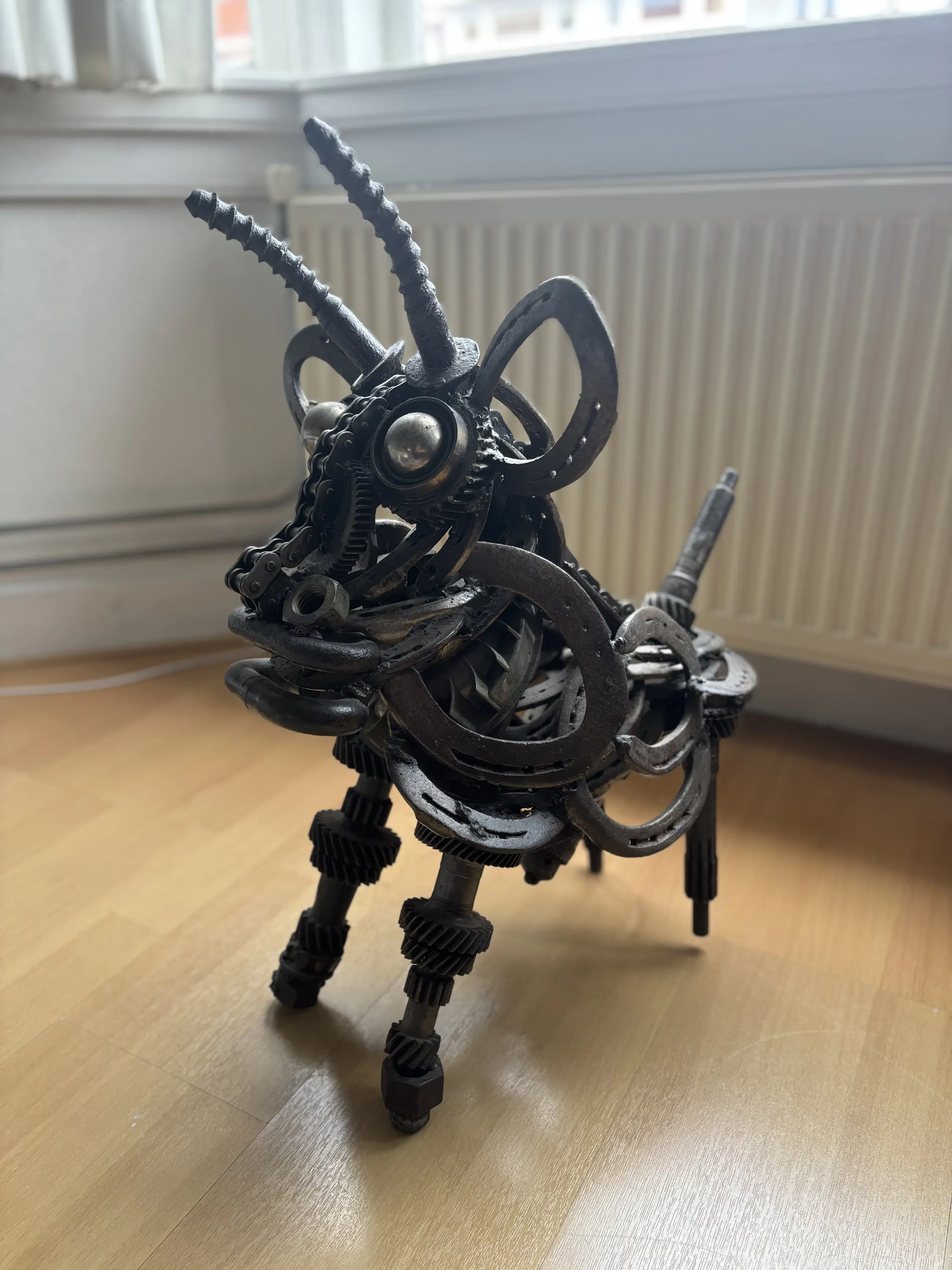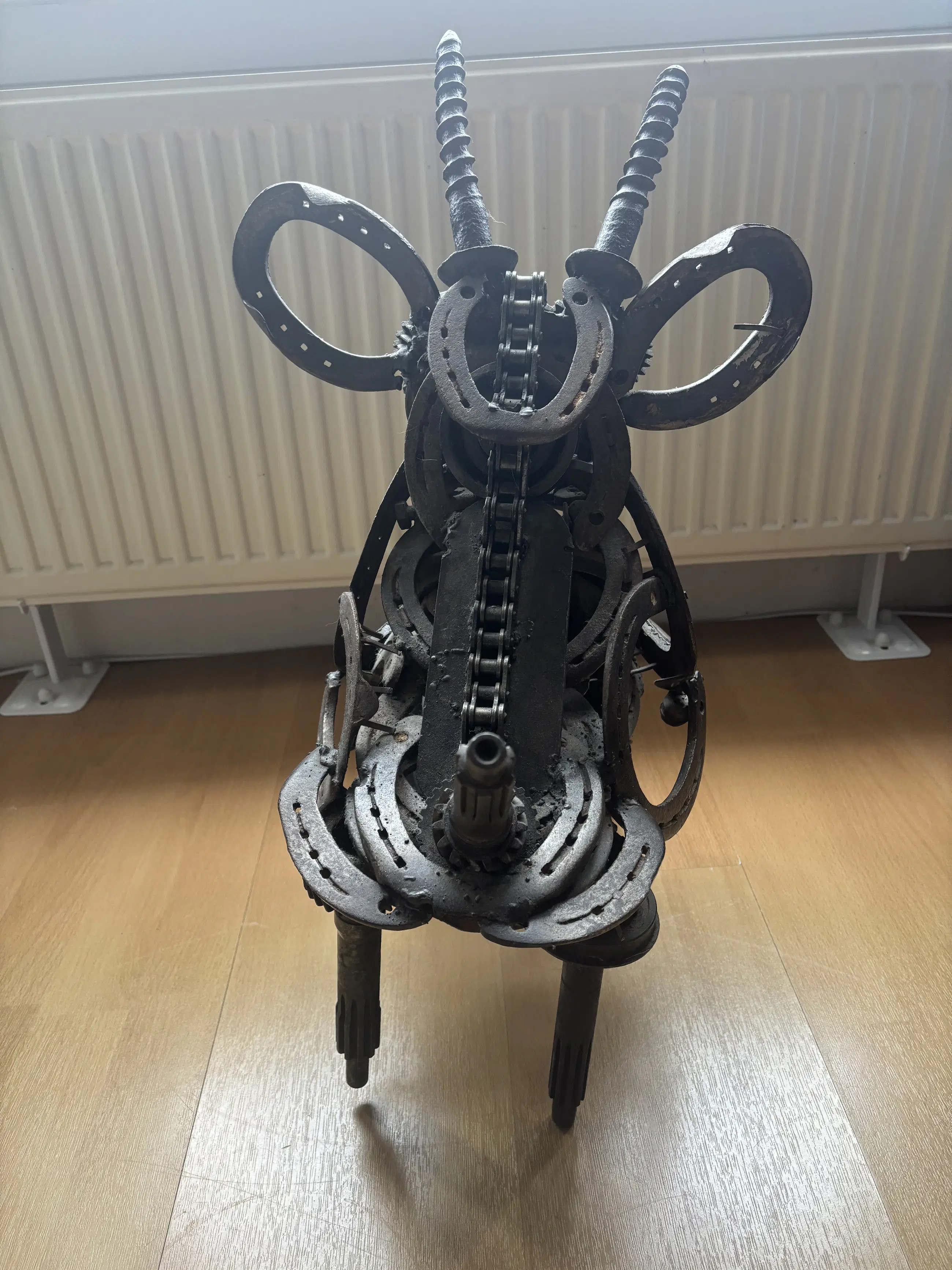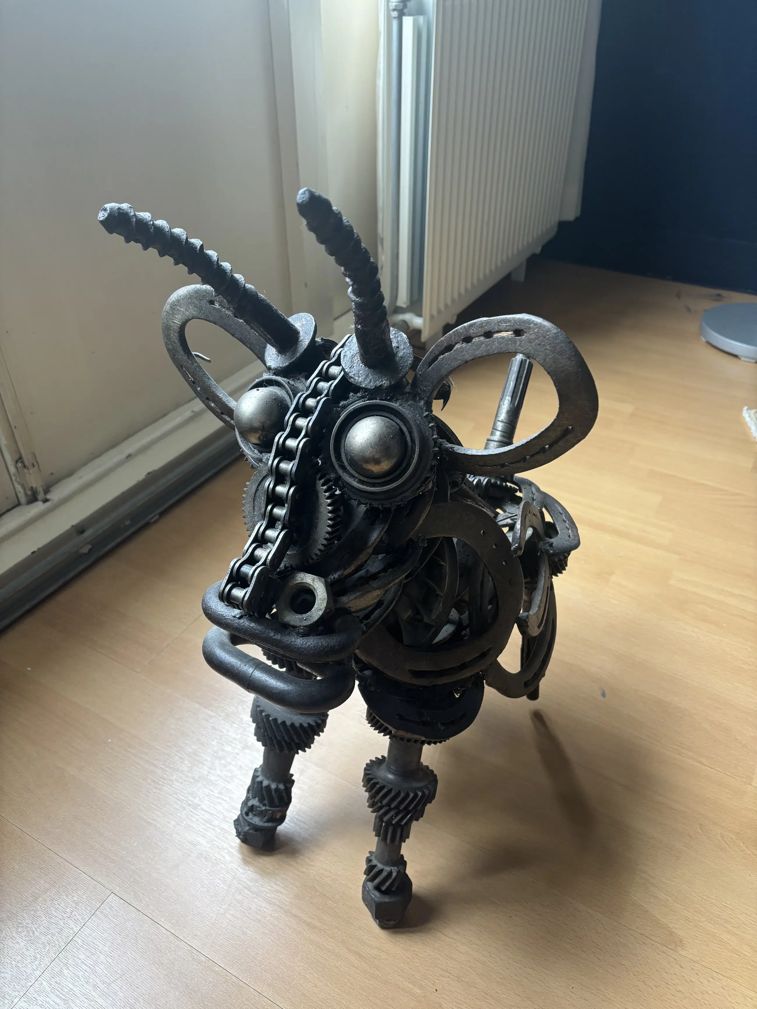 Indrukwekkend en krachtig metalen sculptuur van een stier, vervaardigd door kunstenaar Wim Cerneus. Dit bijzondere kunstwerk is opgebouwd uit gerecyclede industriële onderdelen zoals tandwielen, kettingen, hoefijzers en assen. De materialen geven het beeld een stoer, industrieel karakter met verrassend veel detail en expressie.