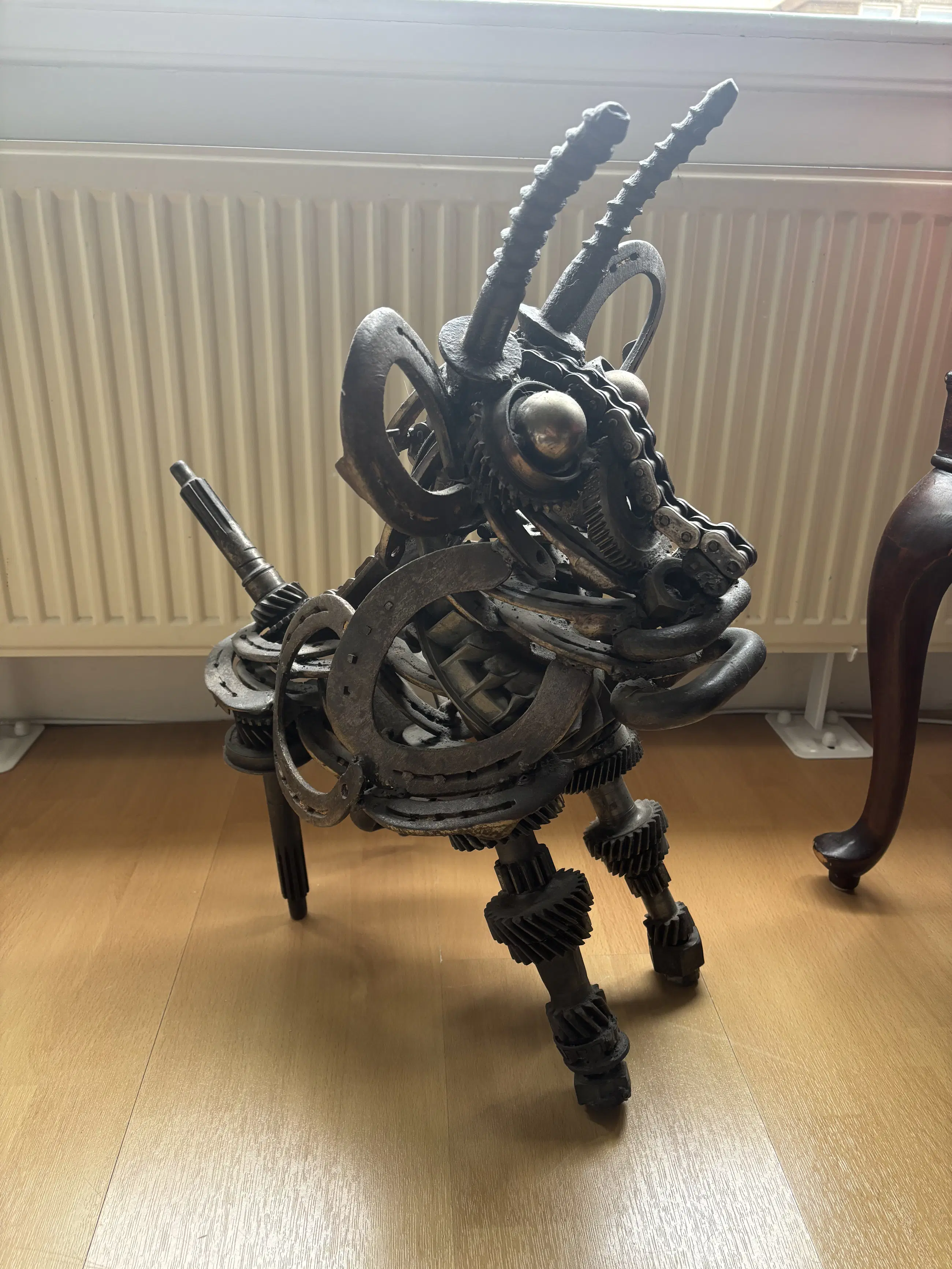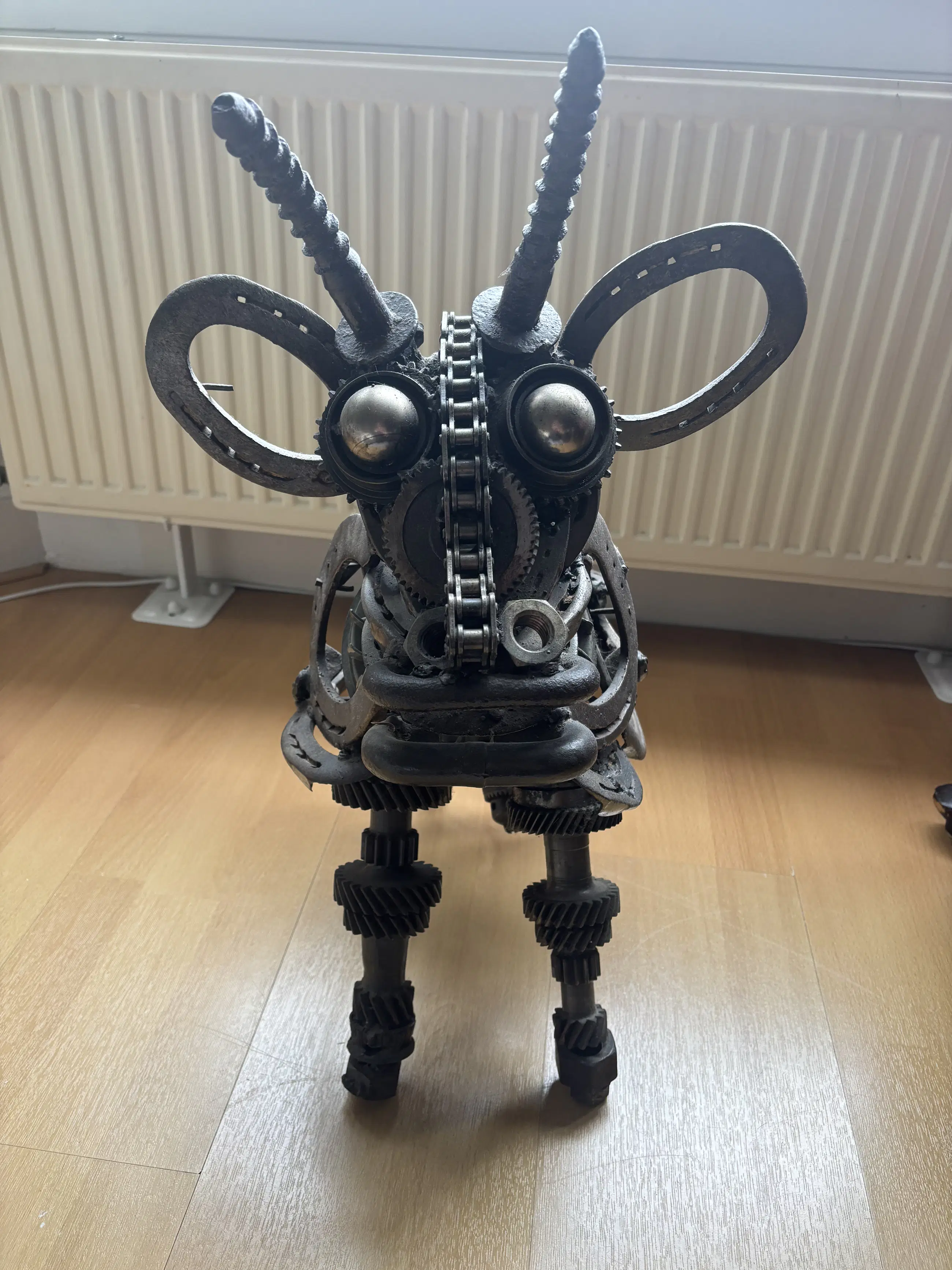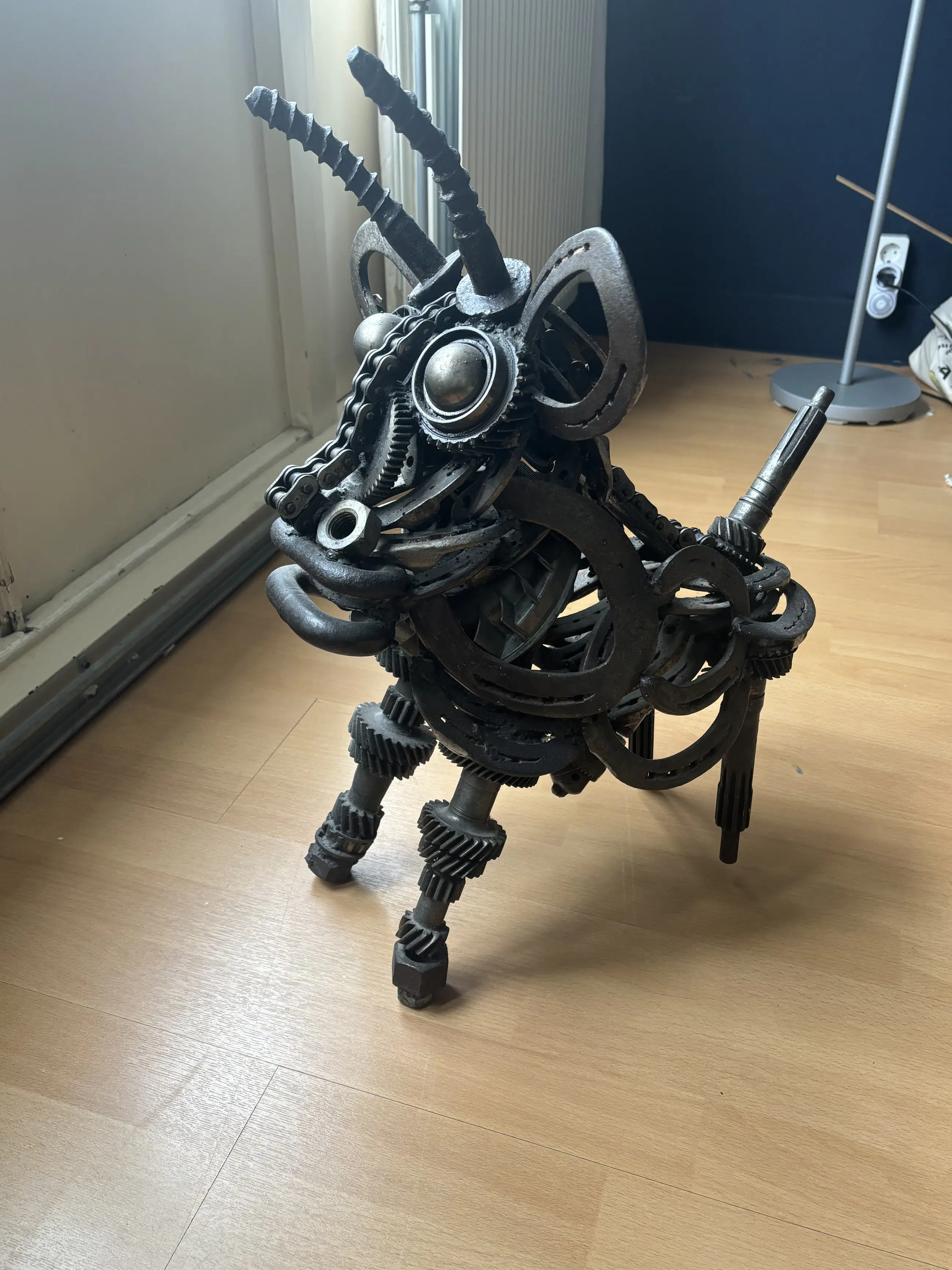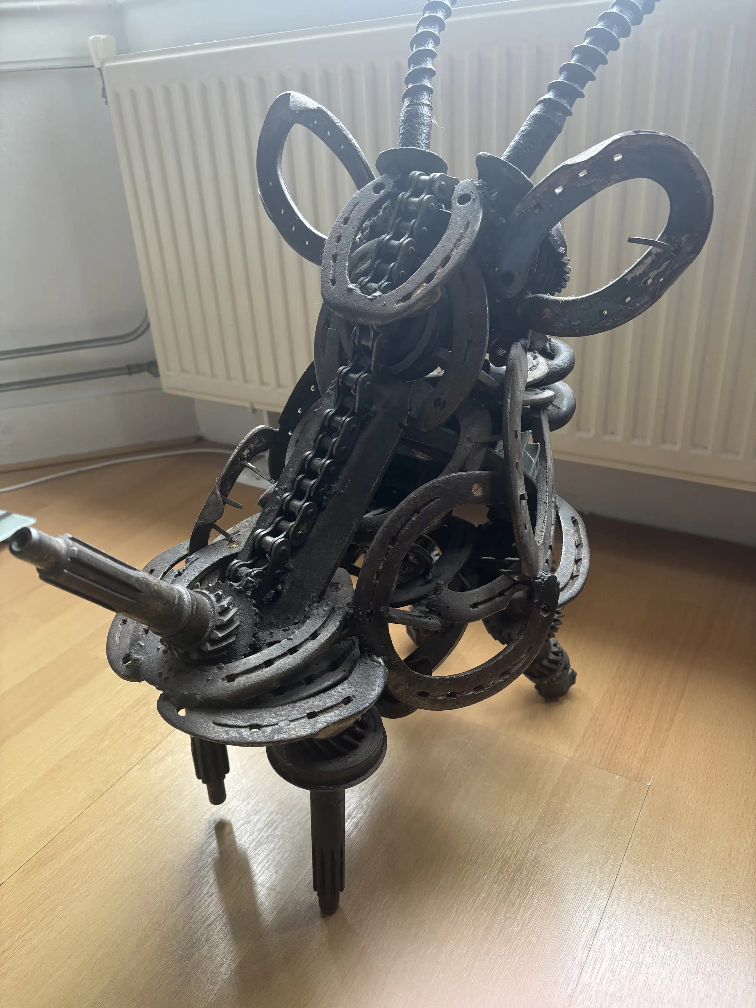 Indrukwekkend en krachtig metalen sculptuur van een stier, vervaardigd door kunstenaar Wim Cerneus. Dit bijzondere kunstwerk is opgebouwd uit gerecyclede industriële onderdelen zoals tandwielen, kettingen, hoefijzers en assen. De materialen geven het beeld een stoer, industrieel karakter met verrassend veel detail en expressie.