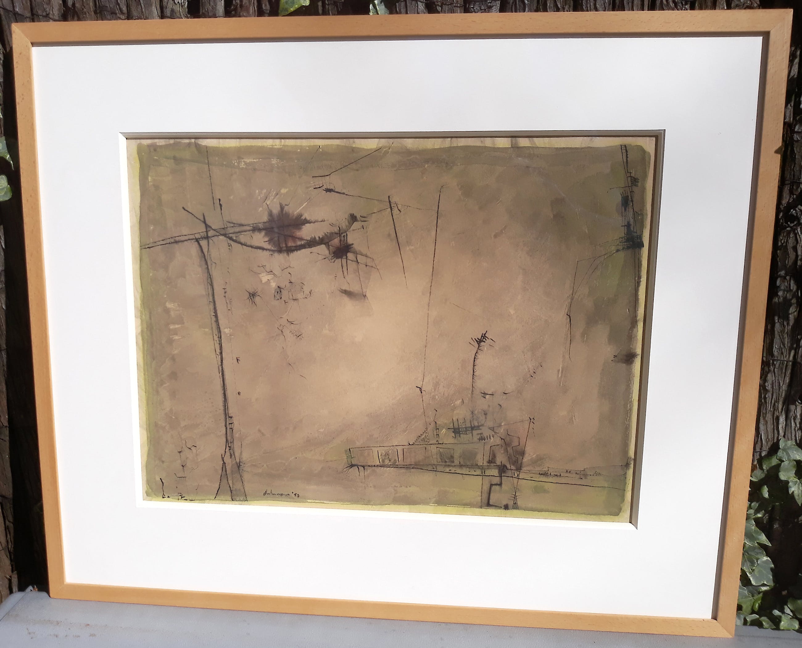 Zeer mooie, karakteristieke compositie van Wim de Haan uit de vroege jaren 50. Gemengde techniek ((gewassen) Indische inkt, mogelijk ecolineverf) op papier, met inkt gesigneerd en gedateerd (‘53). Professioneel ingelijst door lijstenmakerij Govaarts en Homan in Enschede; houten lijst, museumglas en zuurvrij, luxueus passe-partout. Alles in uitstekende conditie.