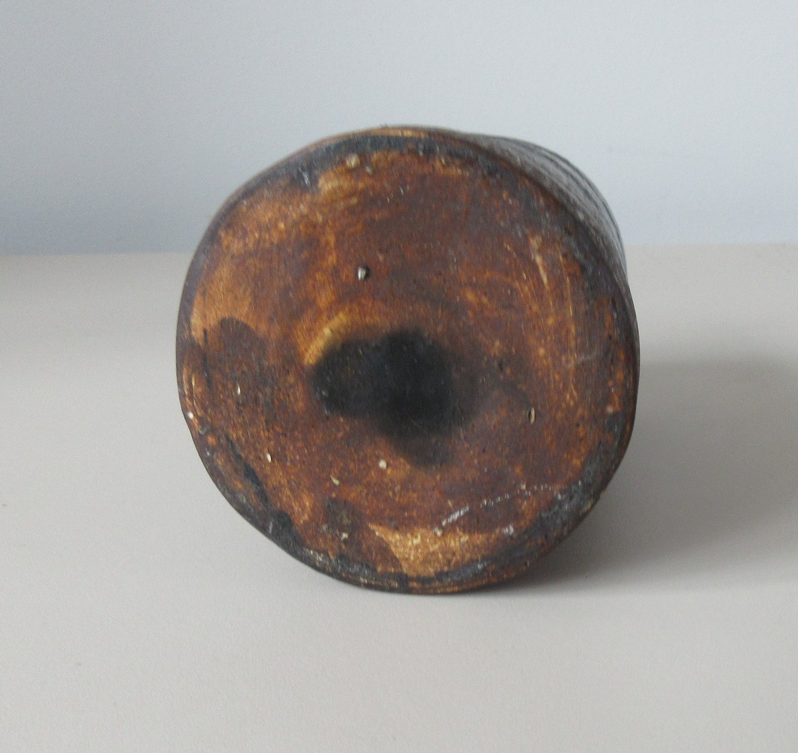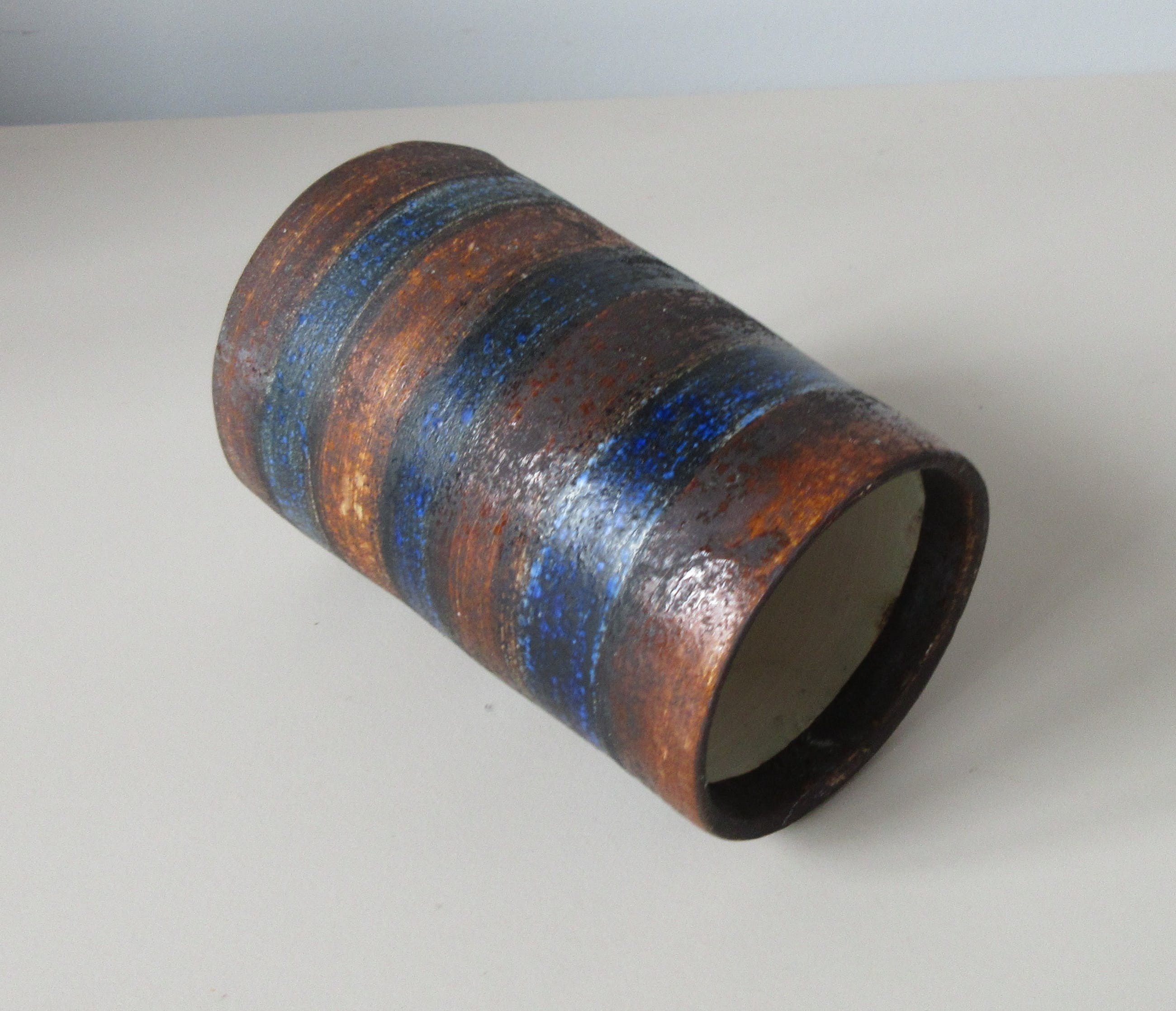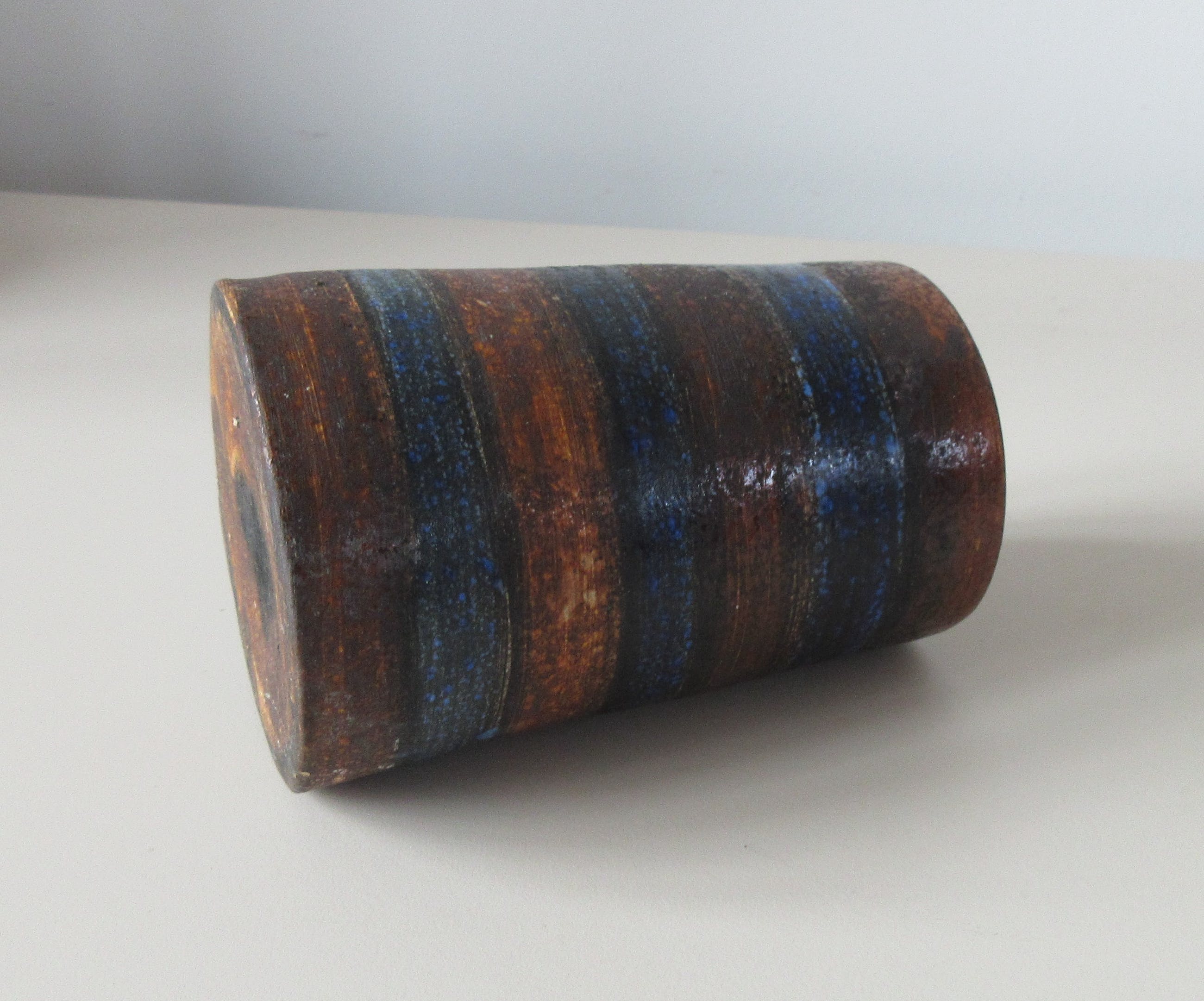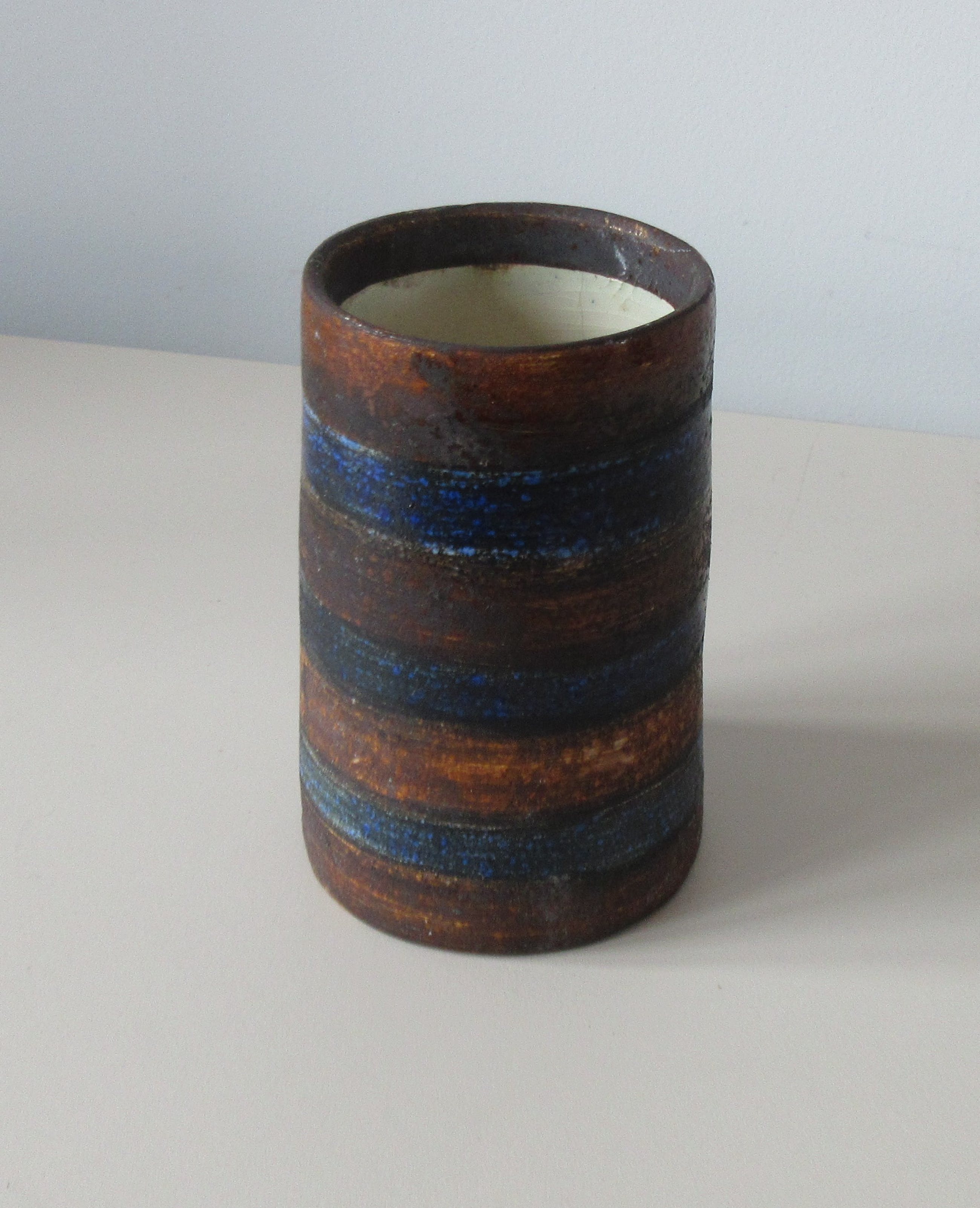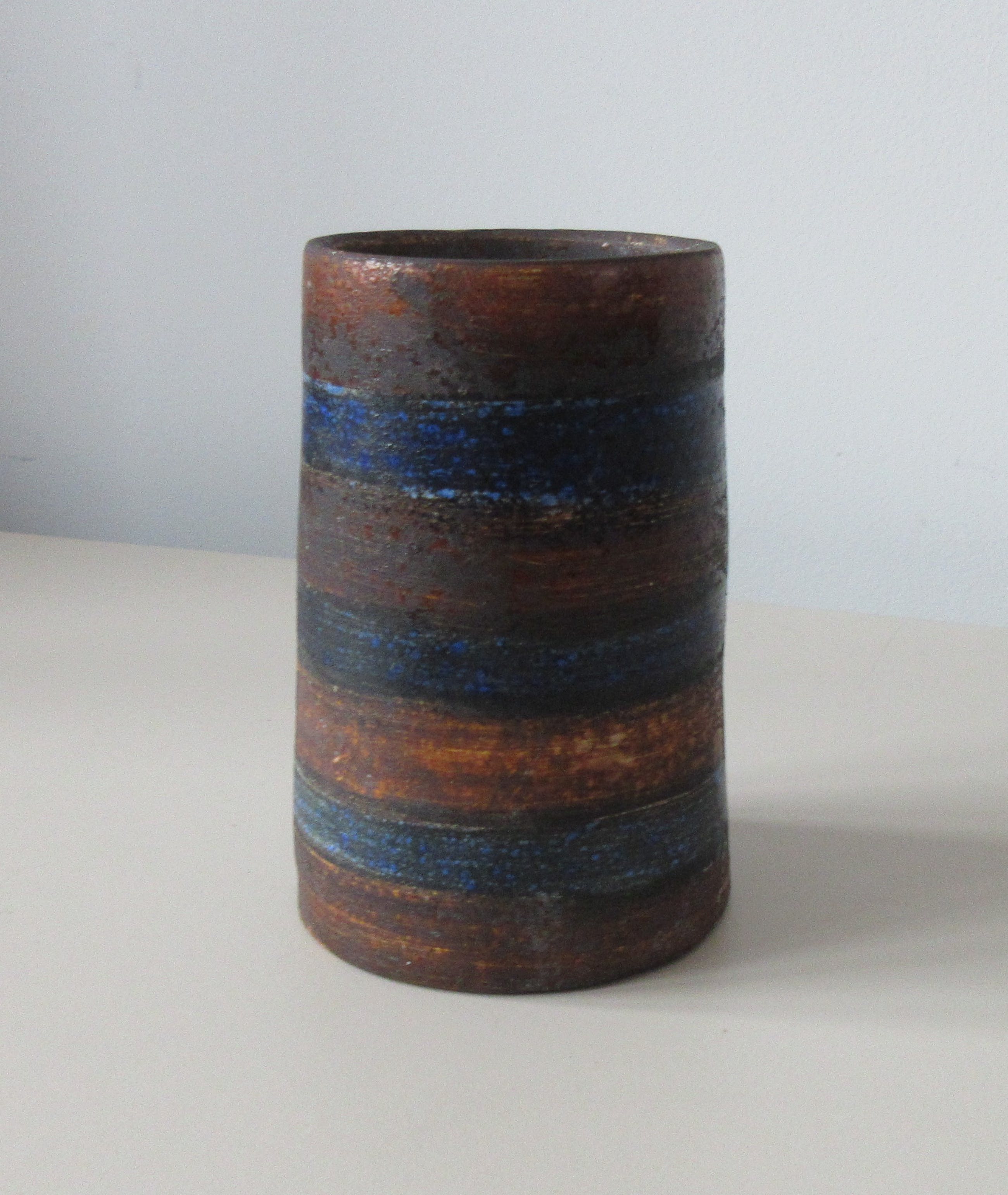 Roestbruin en blauw gestreept aardewerk vaasje van Wim Fiege. In prima conditie, maar niet gesigneerd.