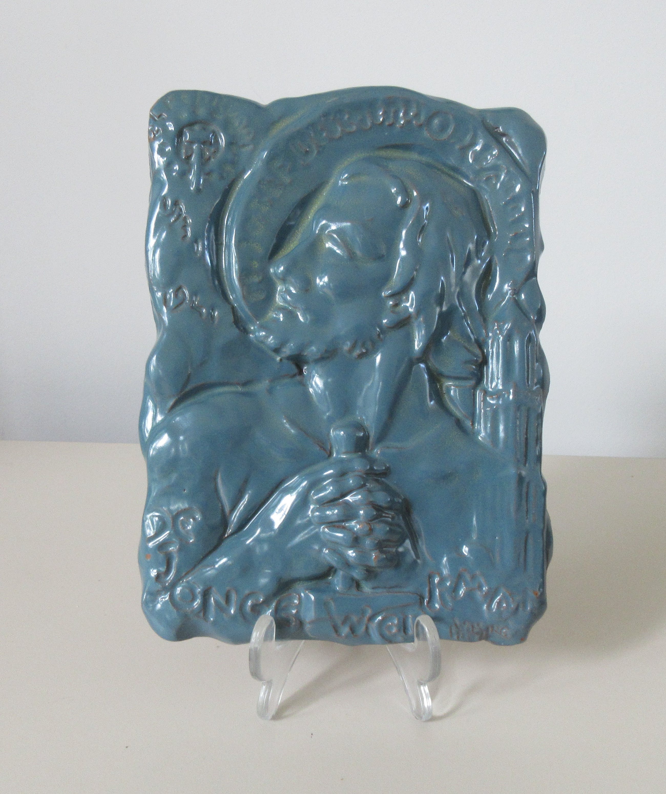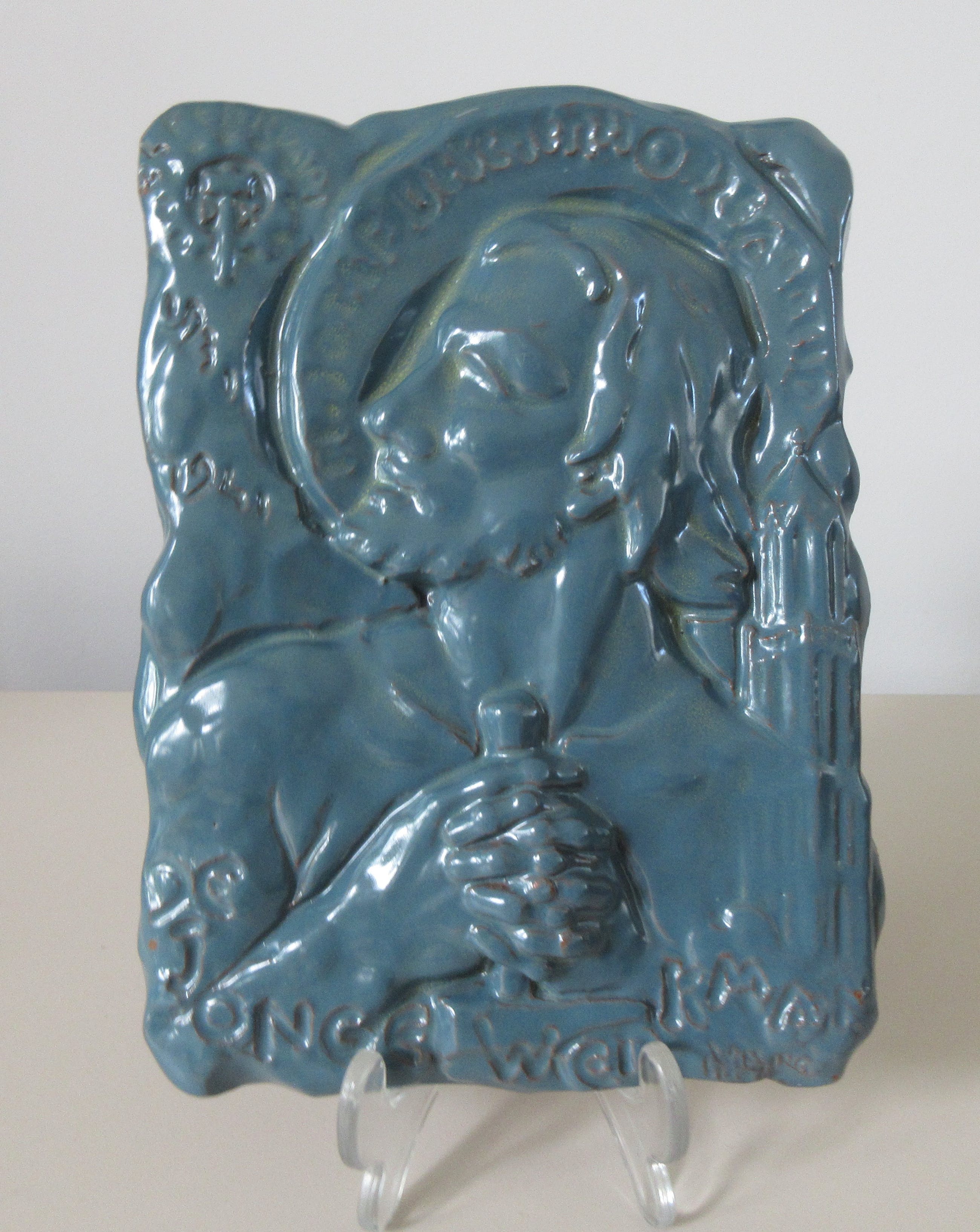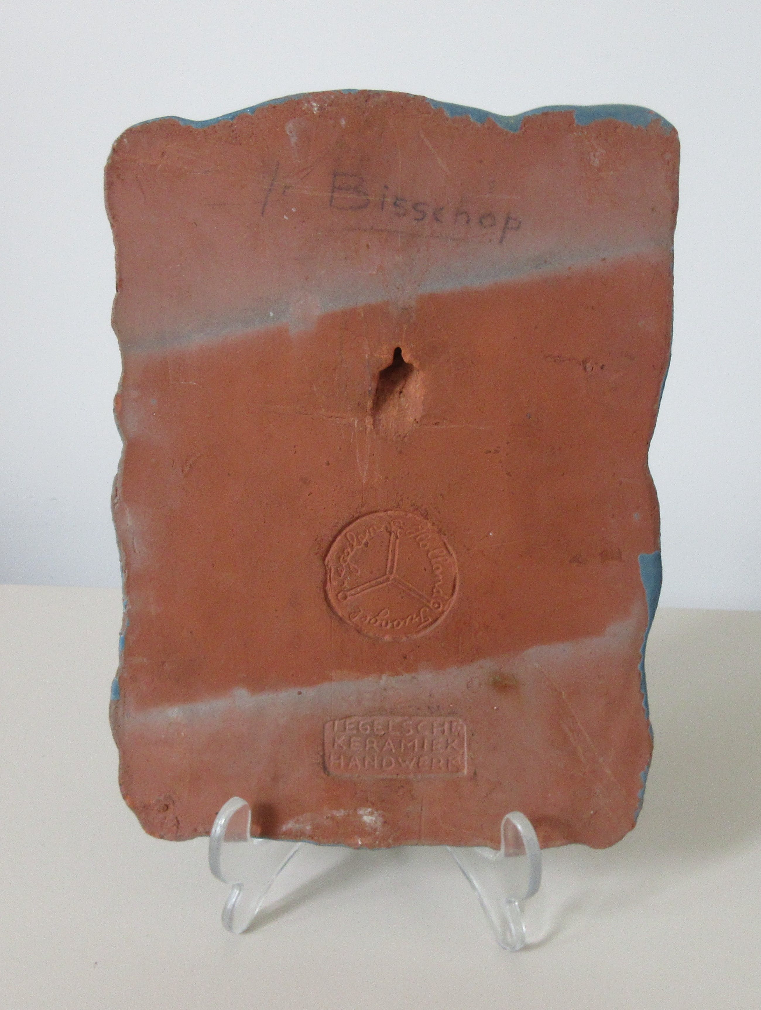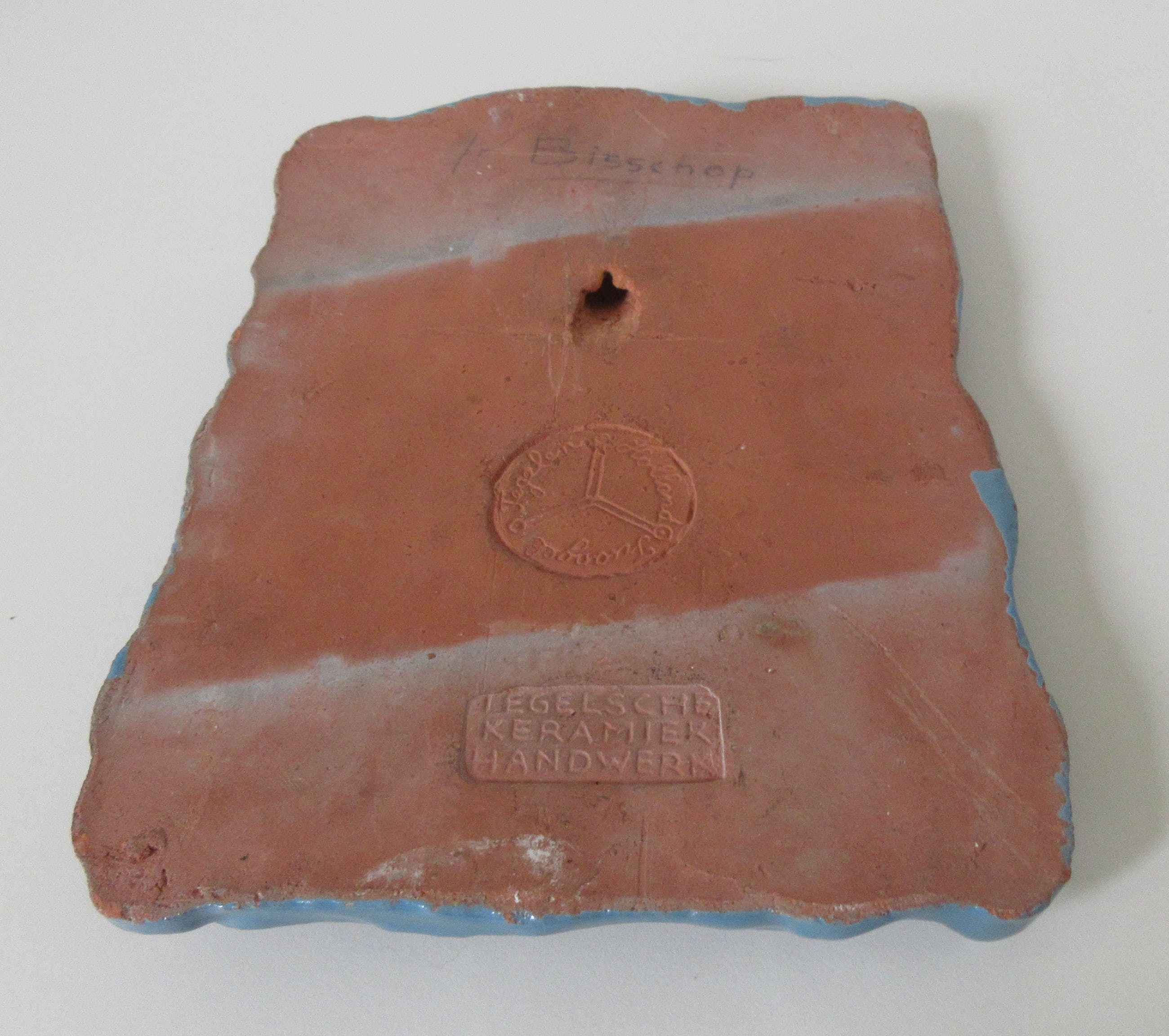 Blauwe geglazuurde aardewerken Patronaatstegel uitgevoerd bij de Russel Tiglia uit Tegelen en ontworpen door de beeldhouwer Wim Harzingh. Rechts onderin is het werk gesigneerd en het is aan de achterzijde gemerkt met ingedrukte blindmerken De Triangel en Tegelsche Keramiek Handwerk.