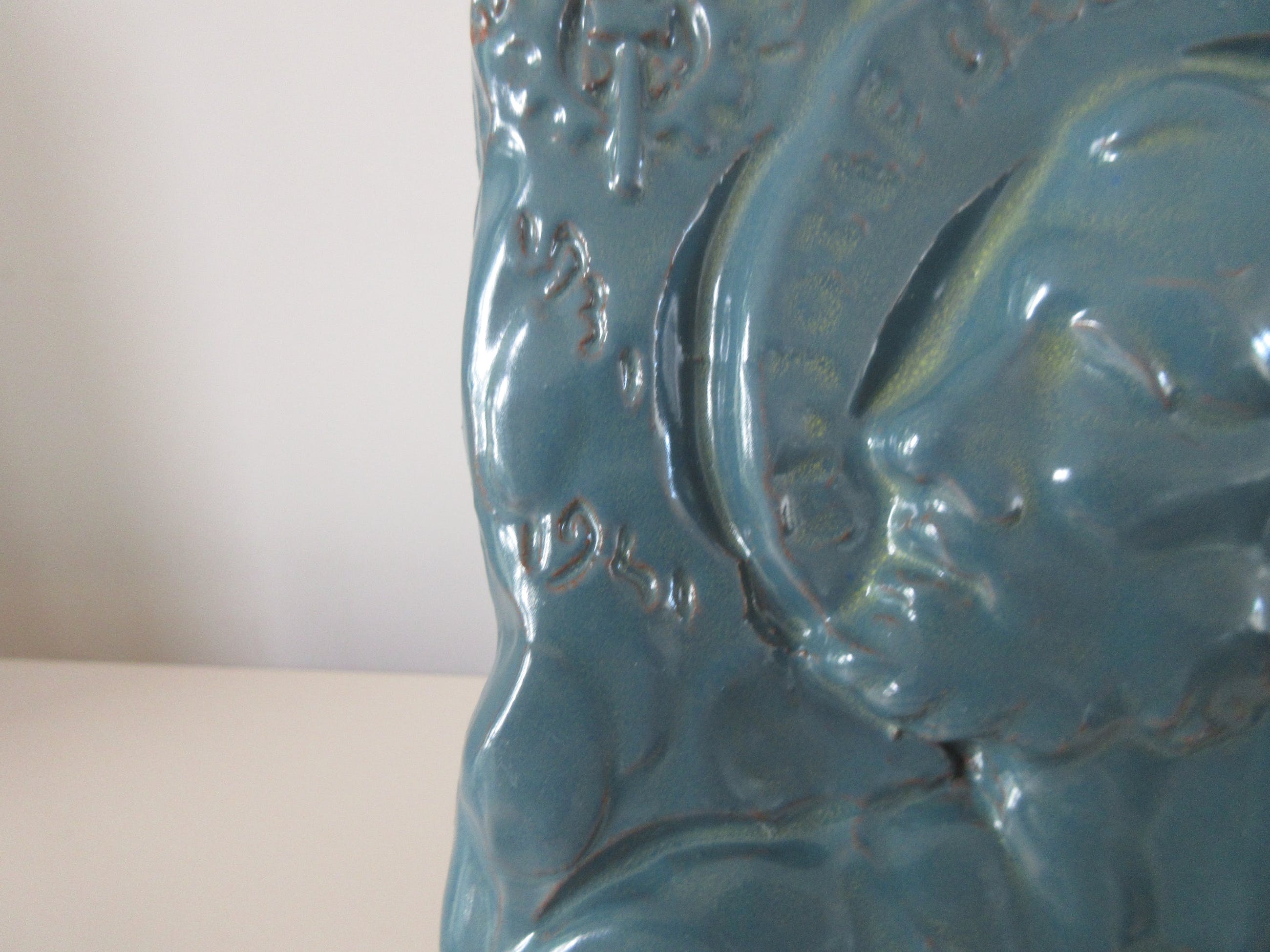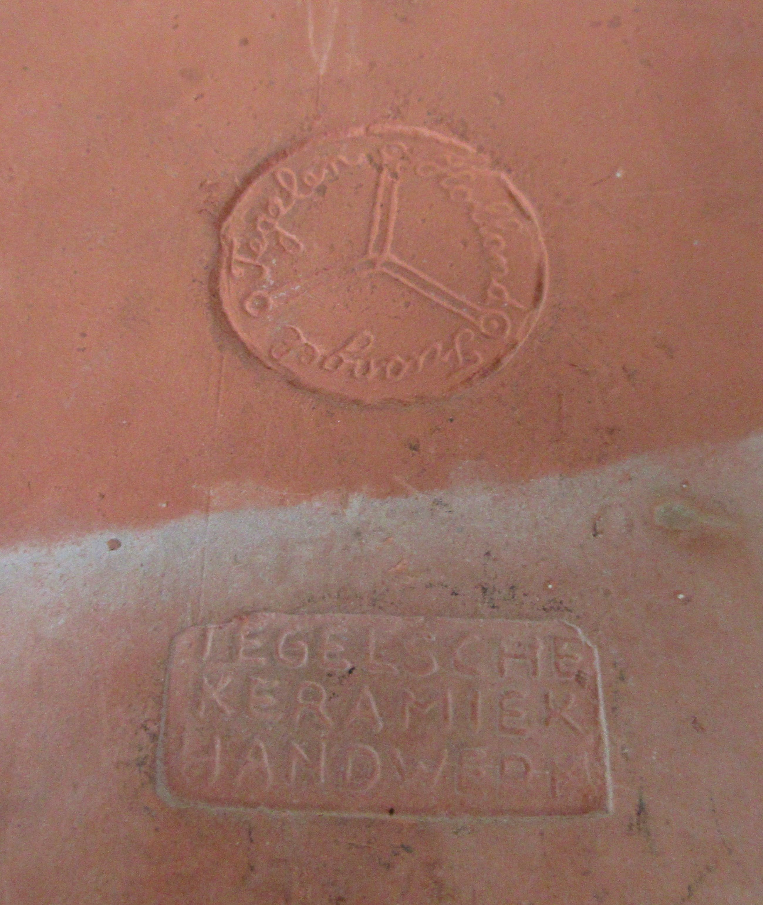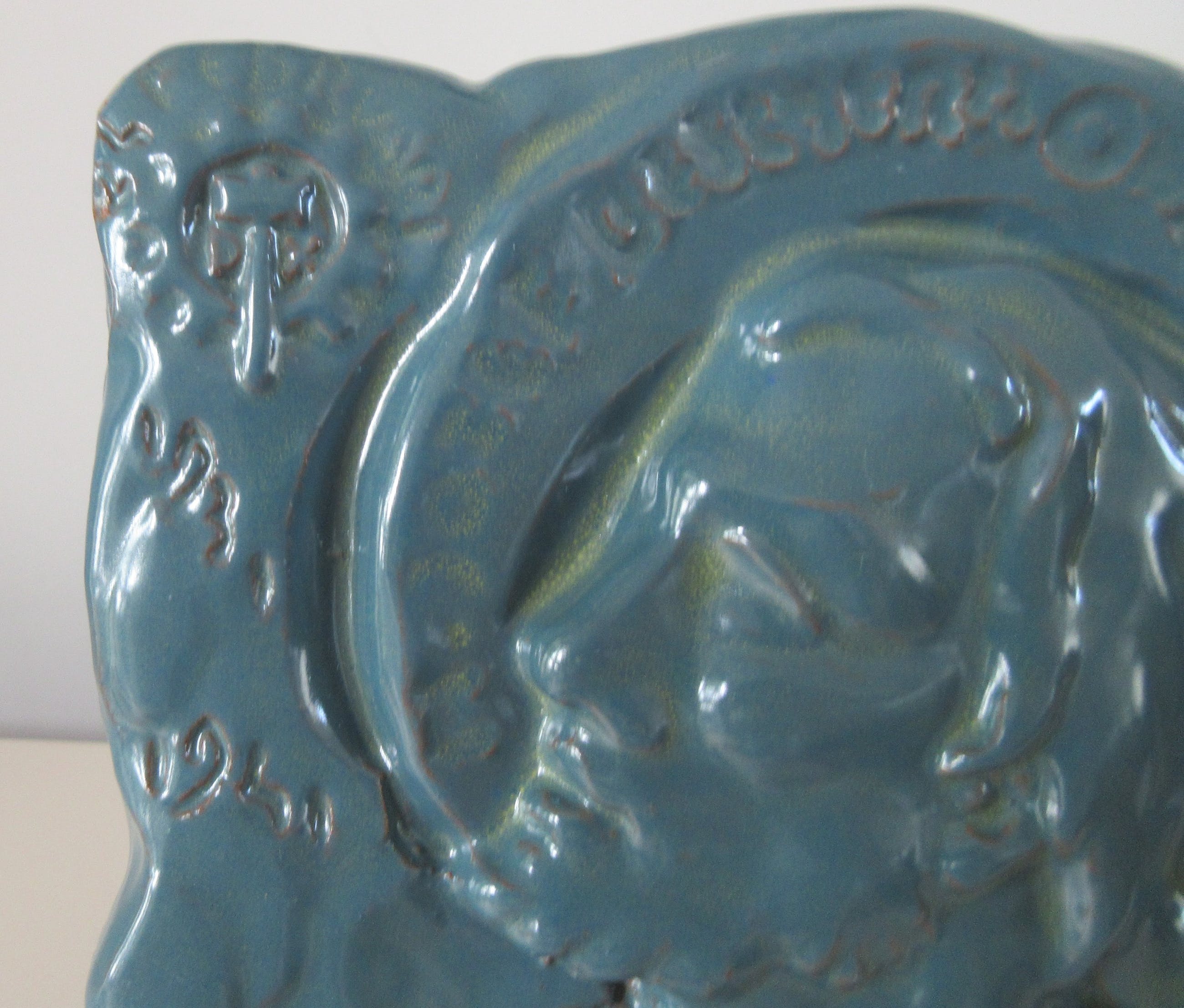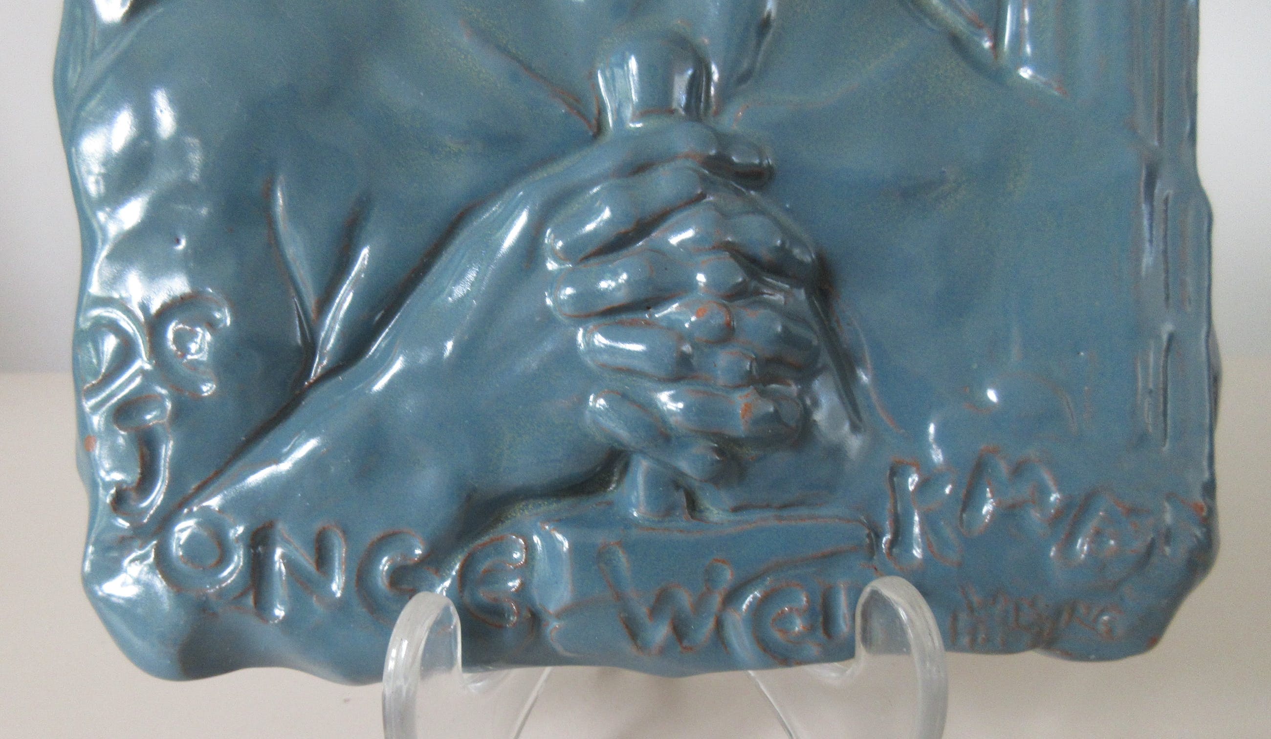 Blauwe geglazuurde aardewerken Patronaatstegel uitgevoerd bij de Russel Tiglia uit Tegelen en ontworpen door de beeldhouwer Wim Harzingh. Rechts onderin is het werk gesigneerd en het is aan de achterzijde gemerkt met ingedrukte blindmerken De Triangel en Tegelsche Keramiek Handwerk.