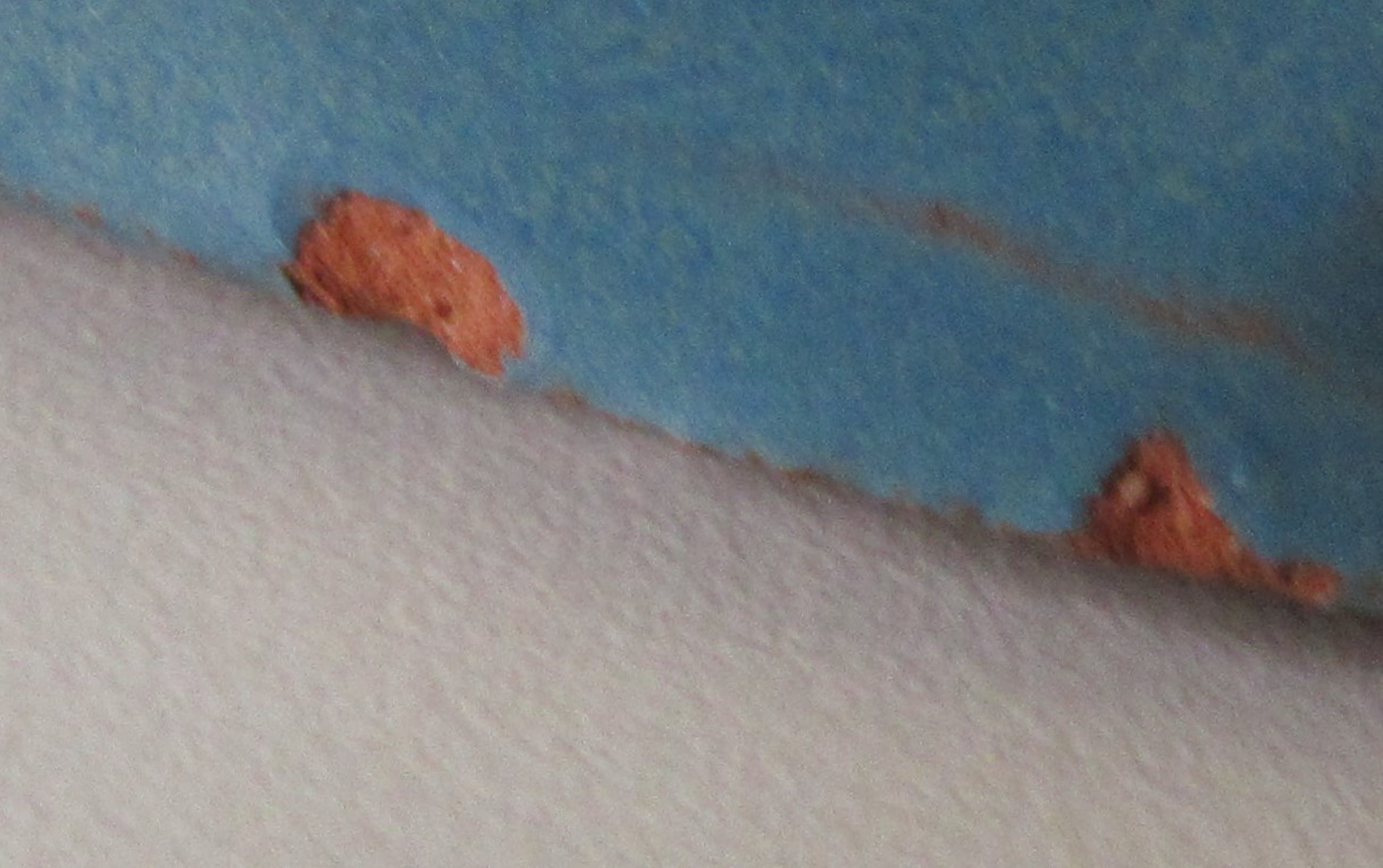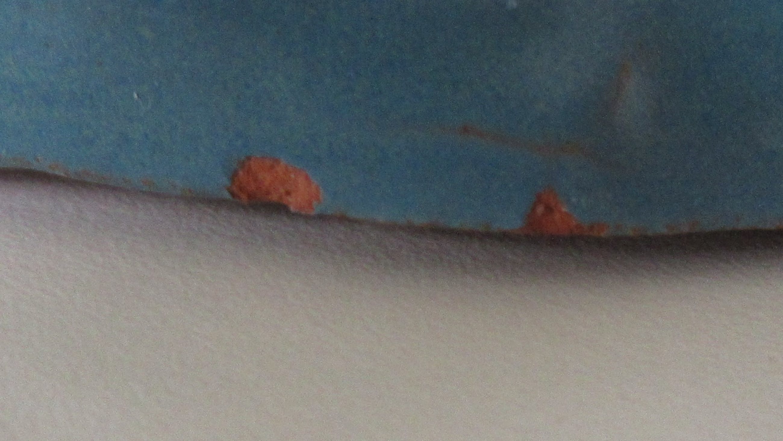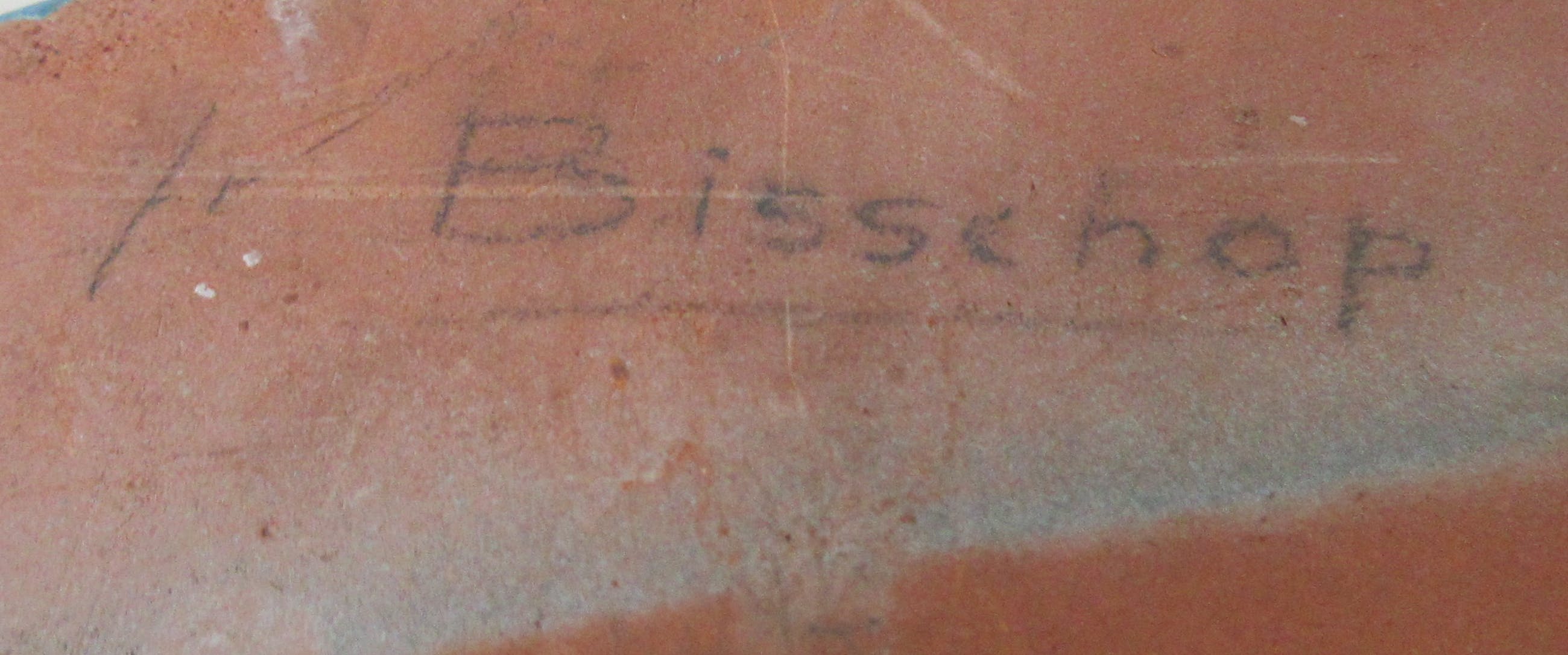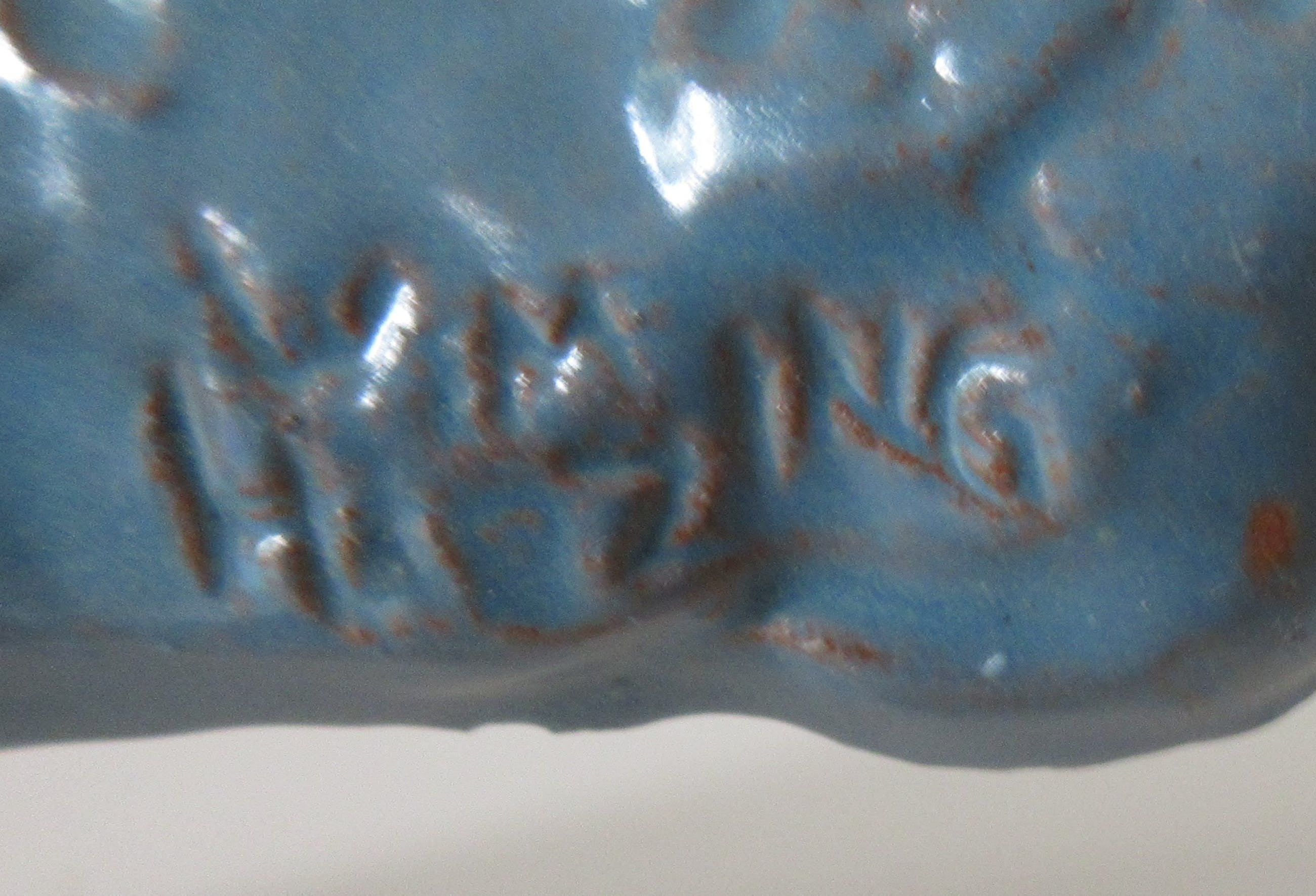 Blauwe geglazuurde aardewerken Patronaatstegel uitgevoerd bij de Russel Tiglia uit Tegelen en ontworpen door de beeldhouwer Wim Harzingh. Rechts onderin is het werk gesigneerd en het is aan de achterzijde gemerkt met ingedrukte blindmerken De Triangel en Tegelsche Keramiek Handwerk.