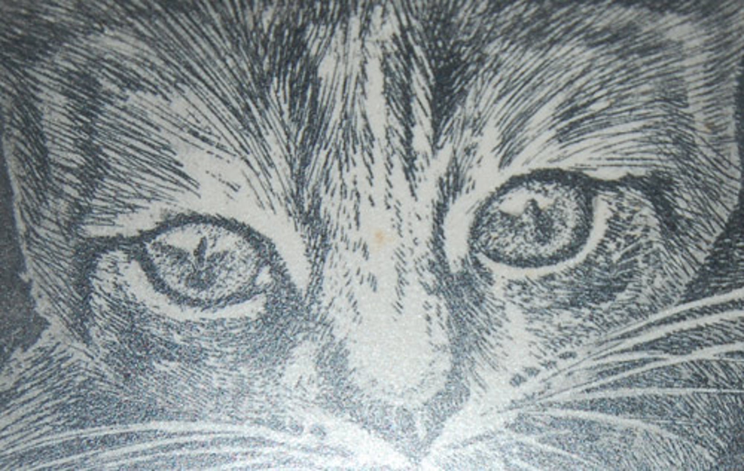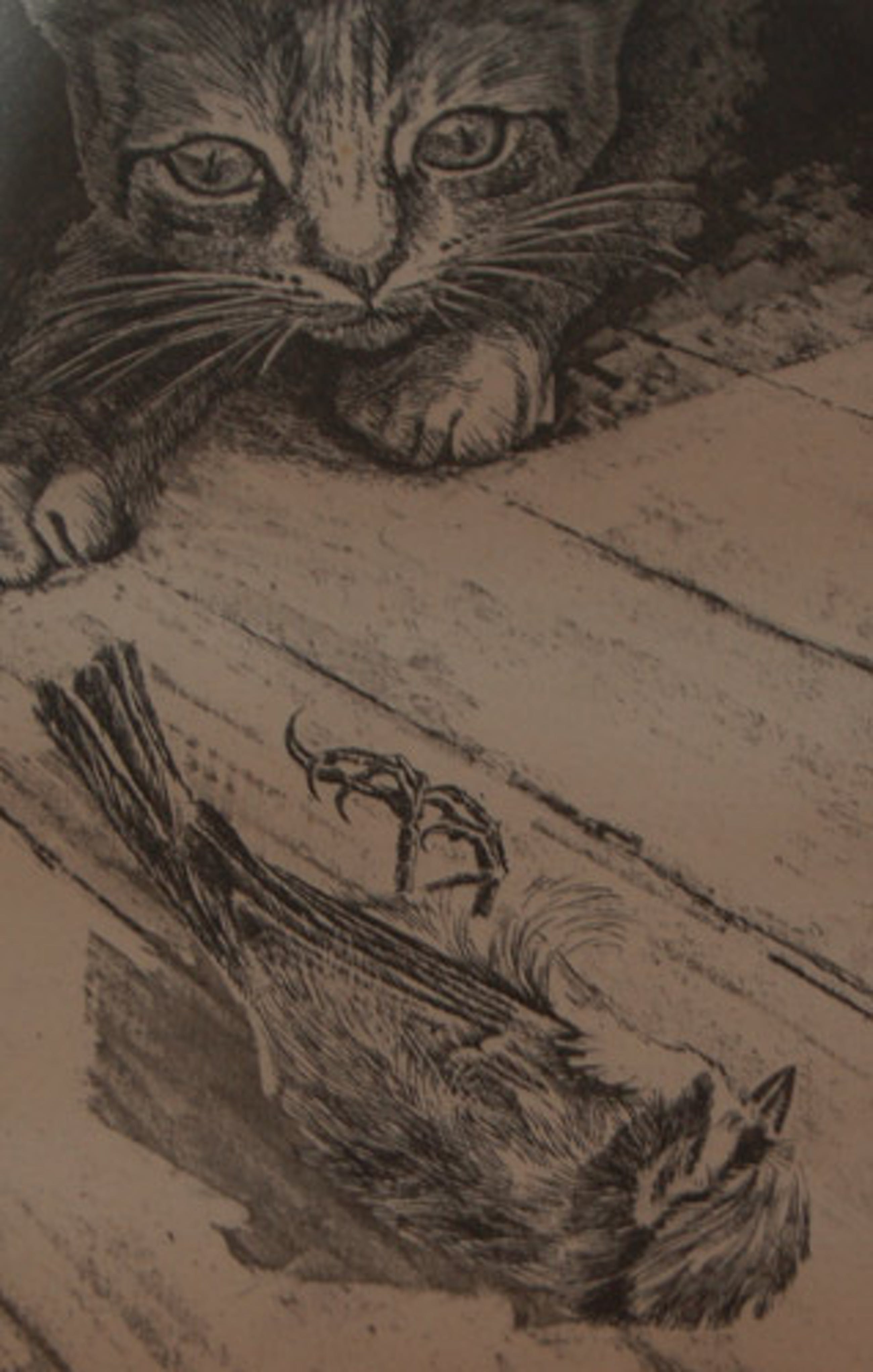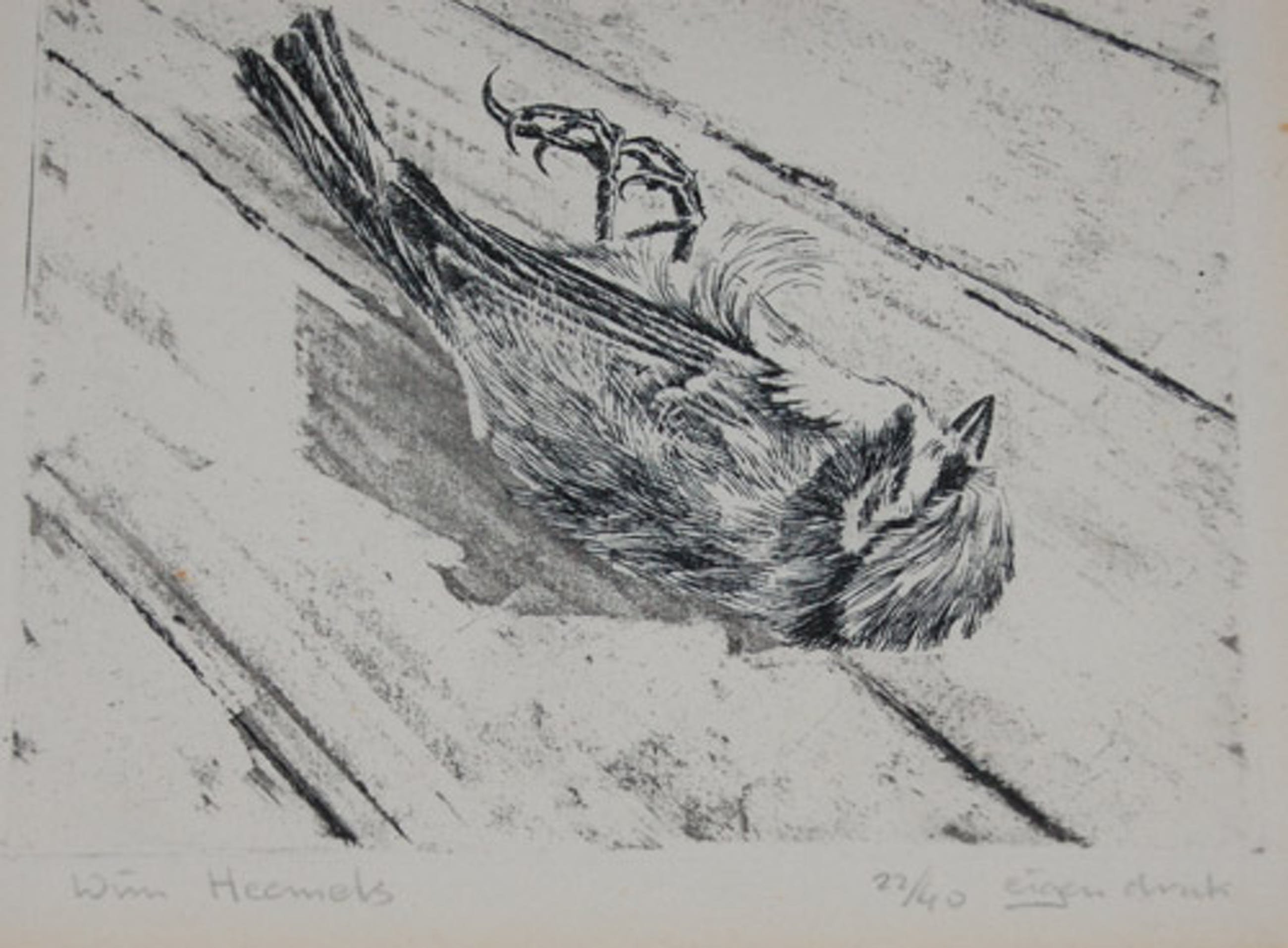 Kat met dode mus Beeldend kunstenaar: Wim Heemels 1943- , docent beeldende vorming Roermond Techniek: ets Oplage: 22/40 Gesigneerd:Wim Heemels - eigen druk Afmeting:12 x 17 cm Met lijst: 28 x 35 cm Conditie: mooie staat, professioneel ingelijst
