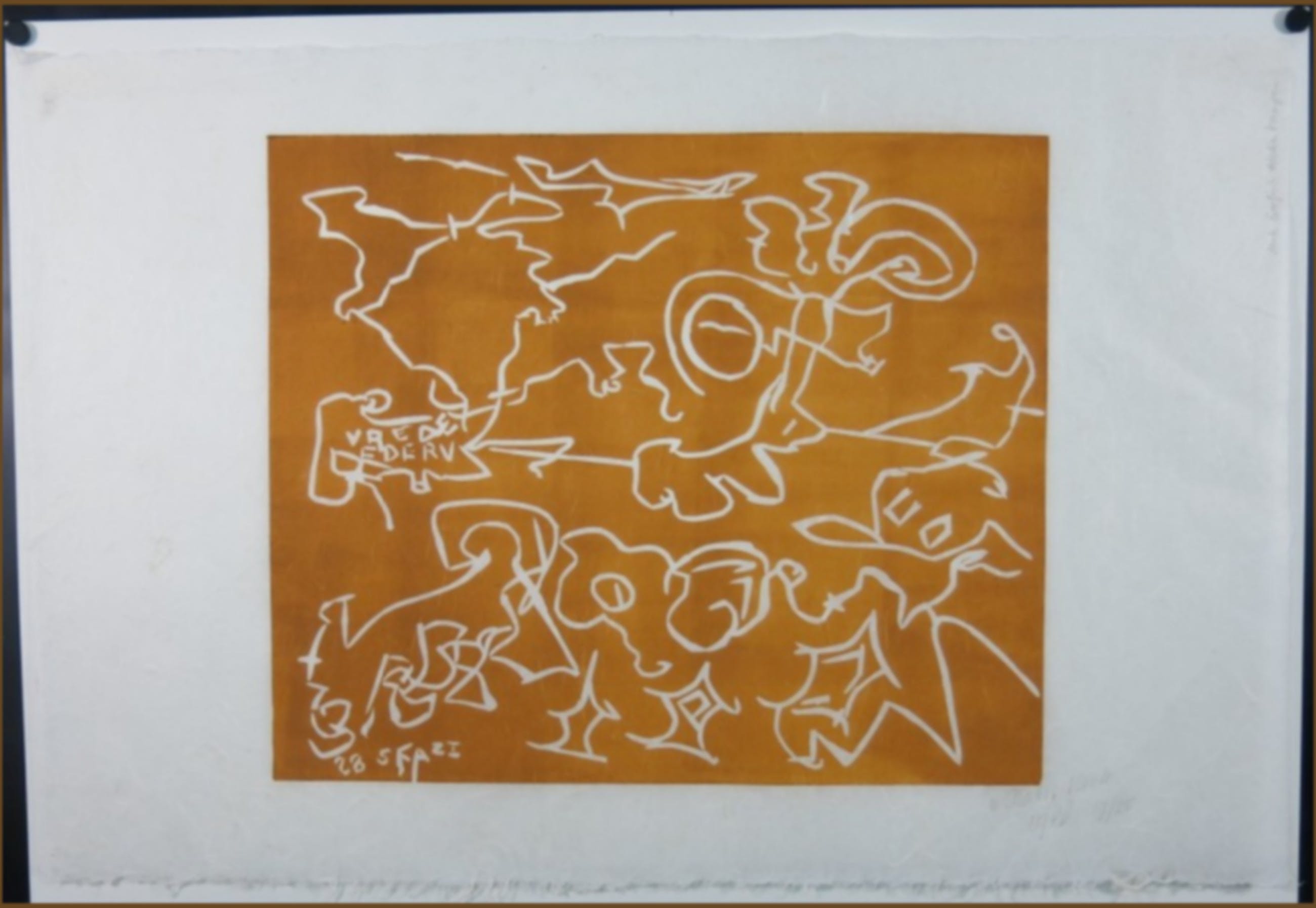 Materiaal: Lino op geschept Rijstpapier, bovenhoeken bevestigd op board.