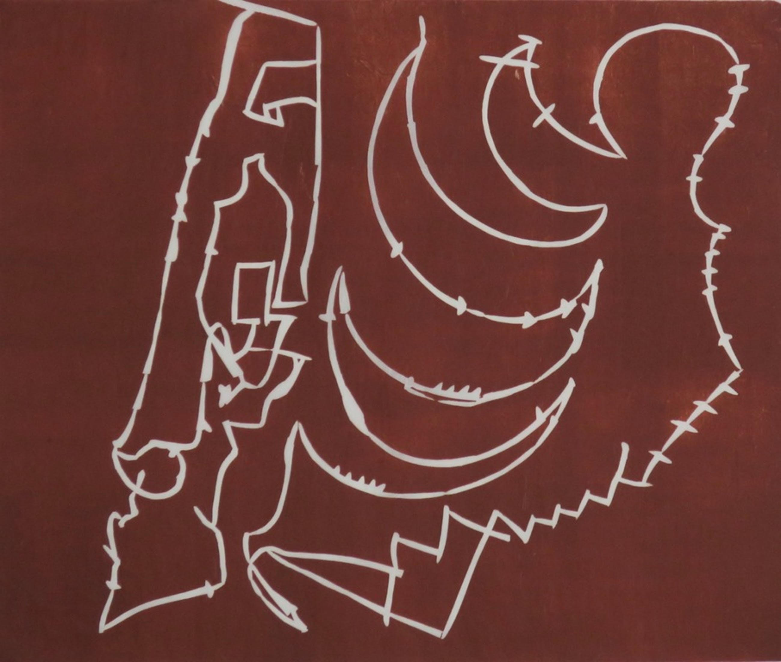 Materiaal: Lino op geschept Rijstpapier, bovenhoeken bevestigd op board.