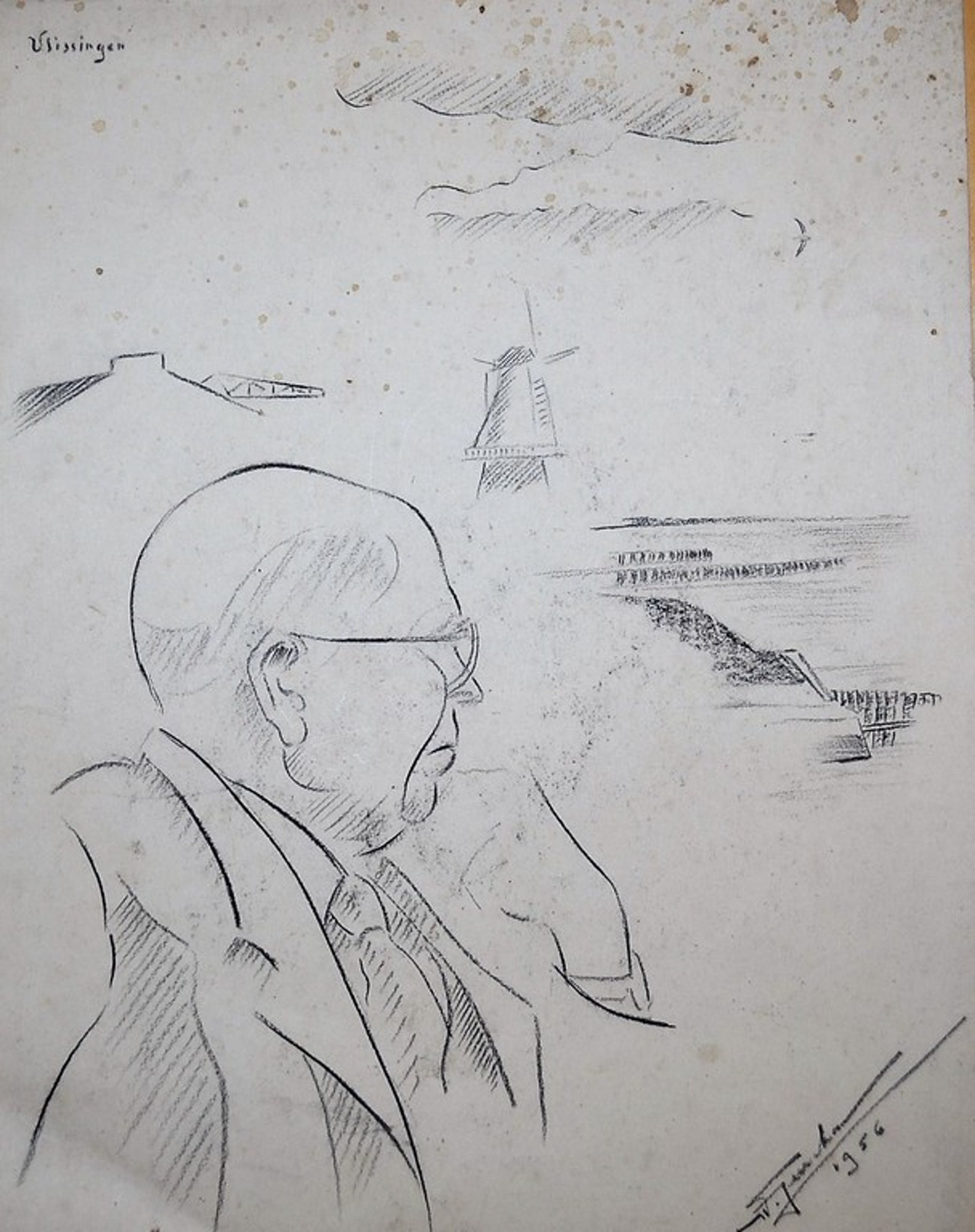 Tekening door Wim Jurcka, getiteld vlissingen. Gesigneerd en gedateerd, 1954. Man, zee en molen. Afmeting 24 bij 31 cm.