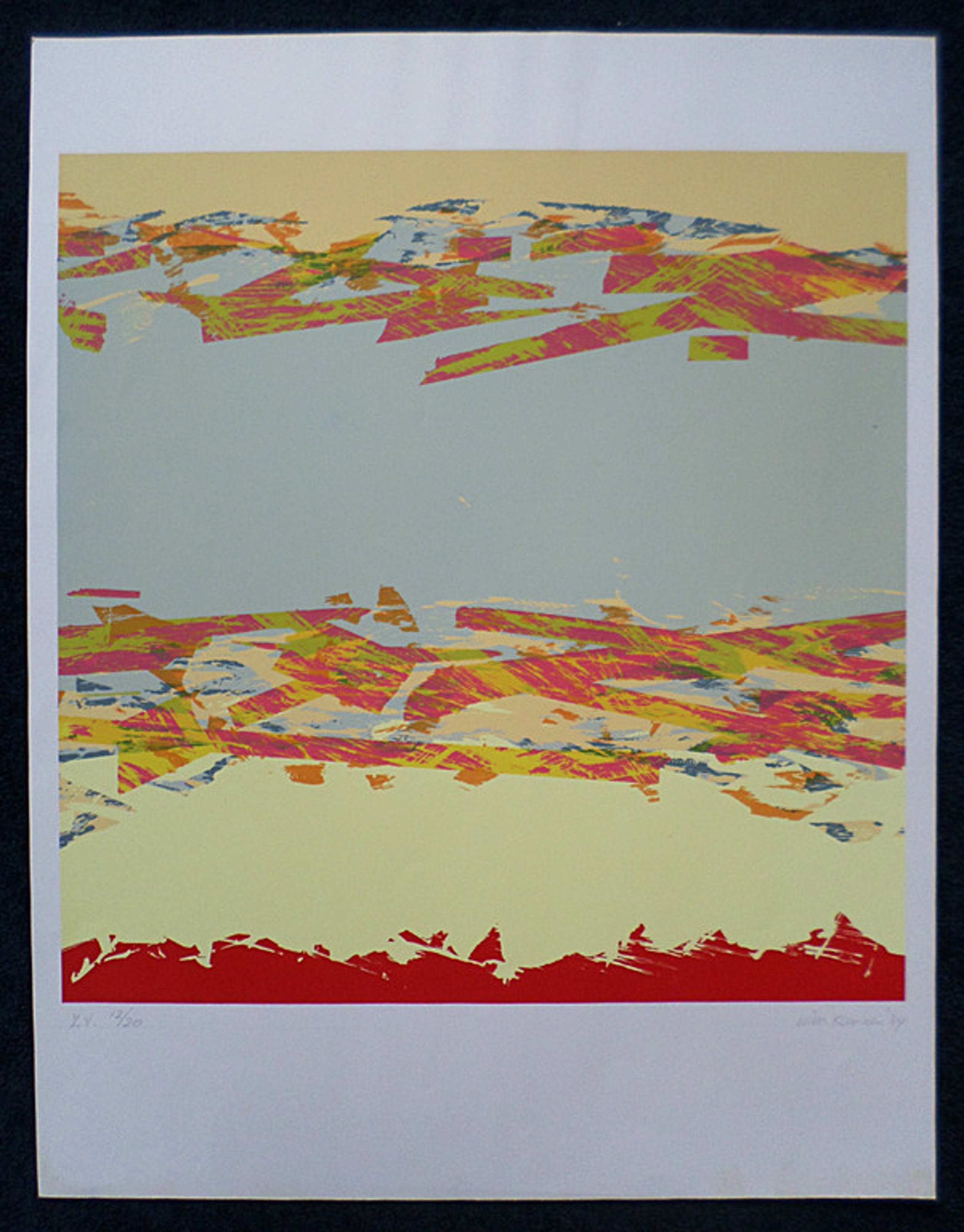 Karakteristieke zeefdruk van Wim Kunnen op dik glad papier. Handgesigneerd, gedateerd (1984) en genummerd (12 uit een oplage van slechts 20 stuks). Werk is in uitstekende conditie, nooit ingelijst geweest. Afkomstig uit de kunstcollectie van ABN AMRO.