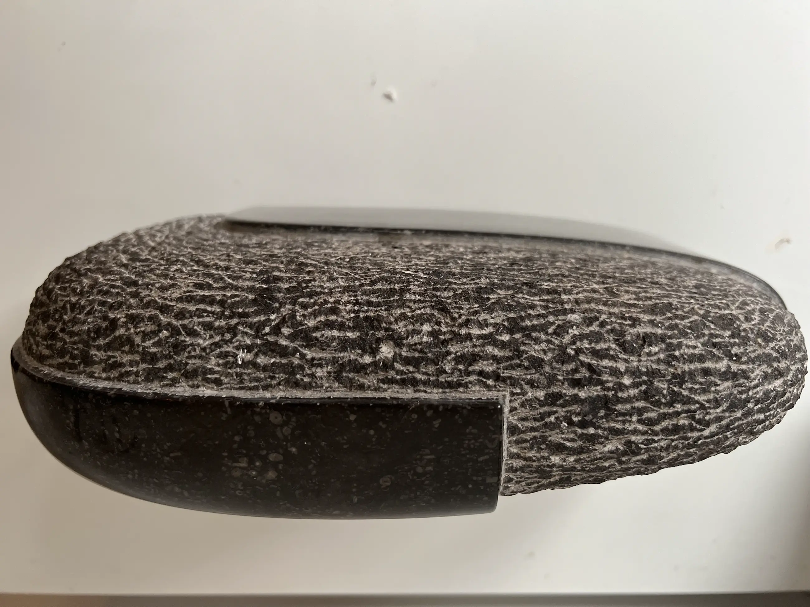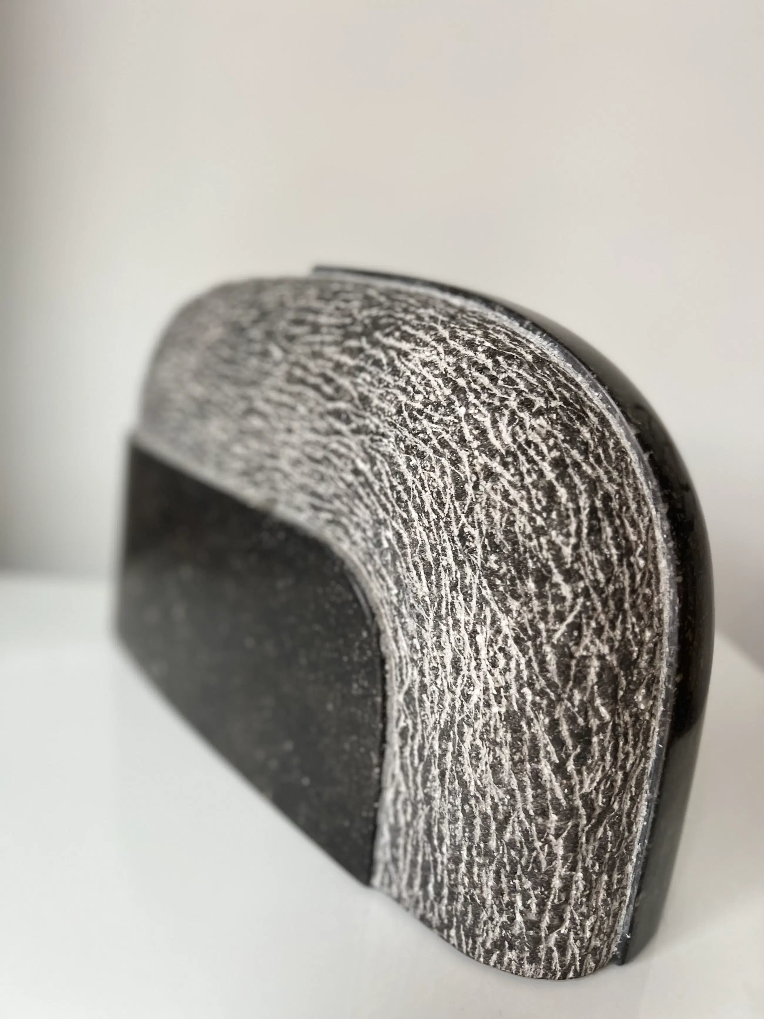 Strak vorm gegeven sculptuur uit hardsteen. Deels ruw deels gepolijst.
