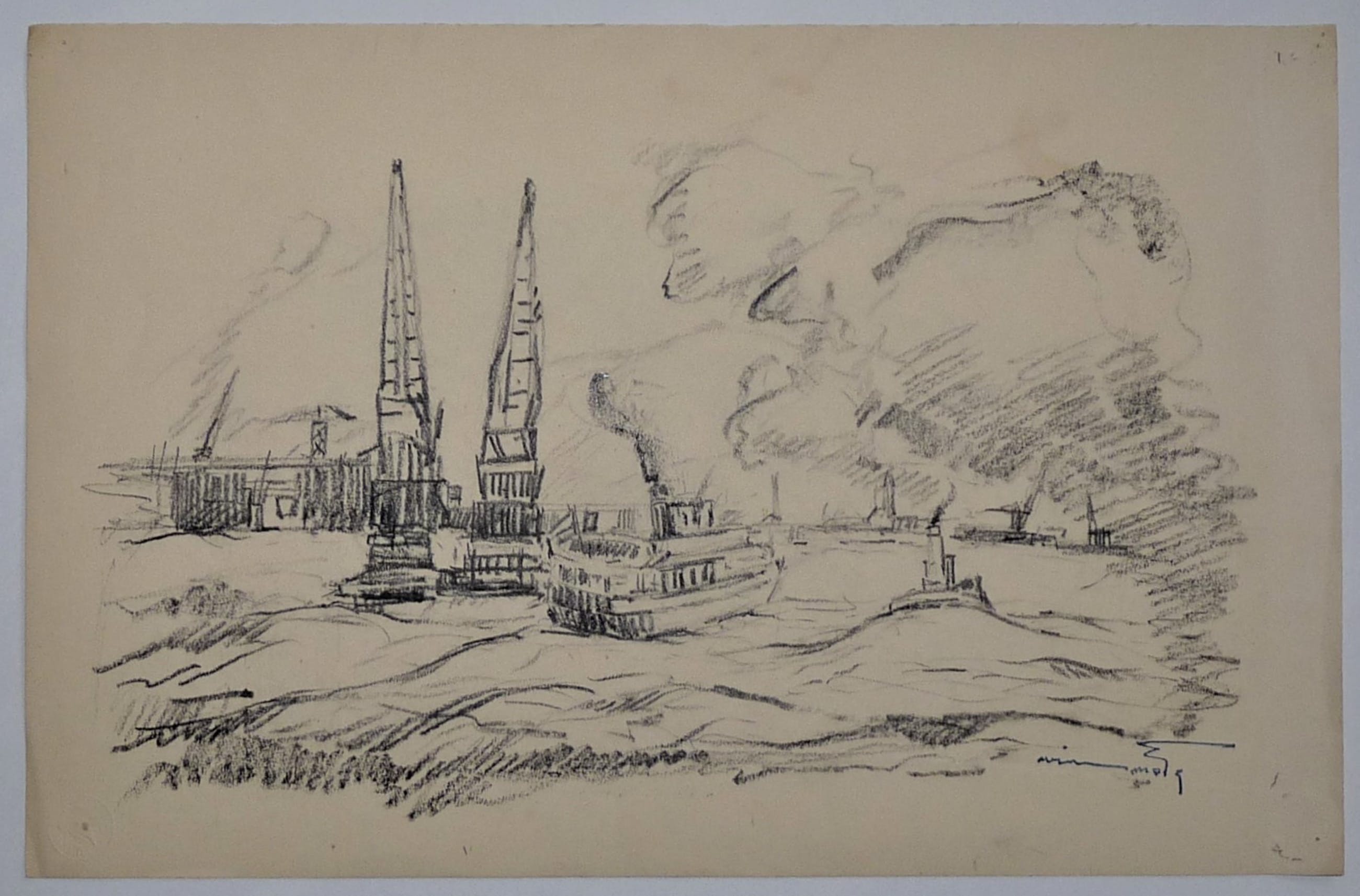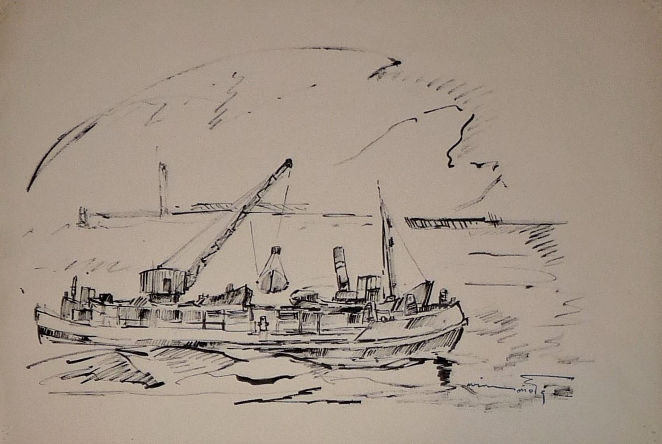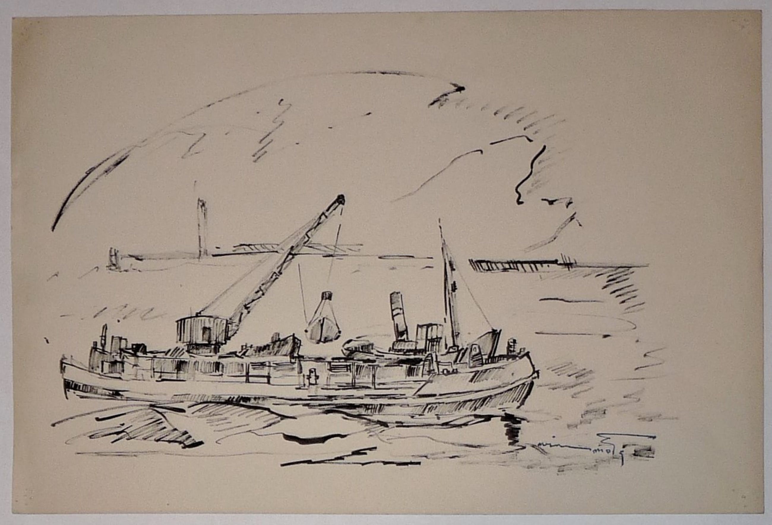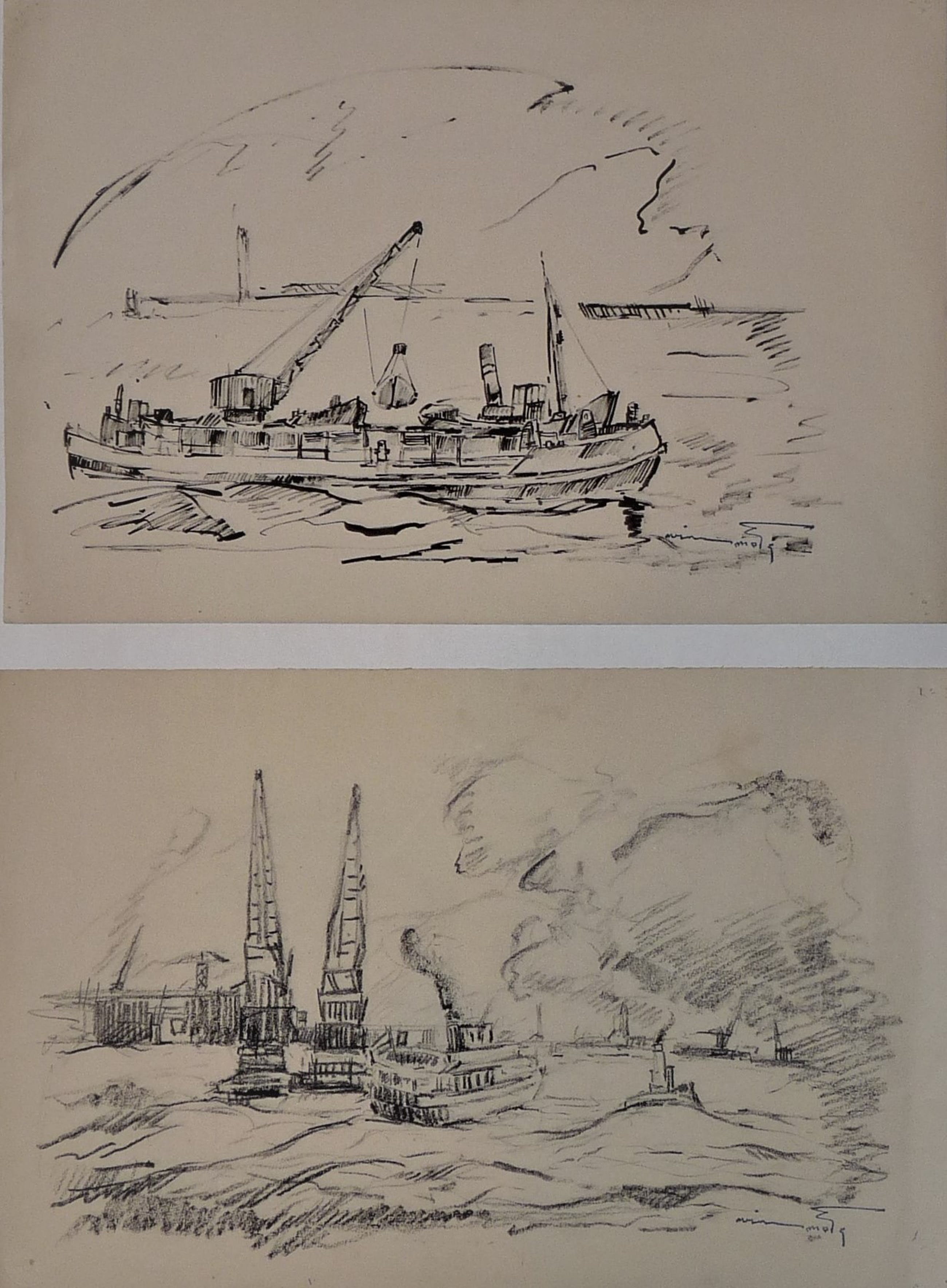 * 2 tekeningen van havengezichten/werkzaamheden door de bekende Rotterdamse kunstenaar Wim Motz. * 1 tekening is in pen en -inkt. De andere tekening is met siberisch krijt gedaan. *Beide tekeningen uit nalatenschap zijn voorzien van atelierstempel Wim Motz. *Hoogstwaarschijnlijk zijn beide tekeningen in de jaren 50 gemaakt.
