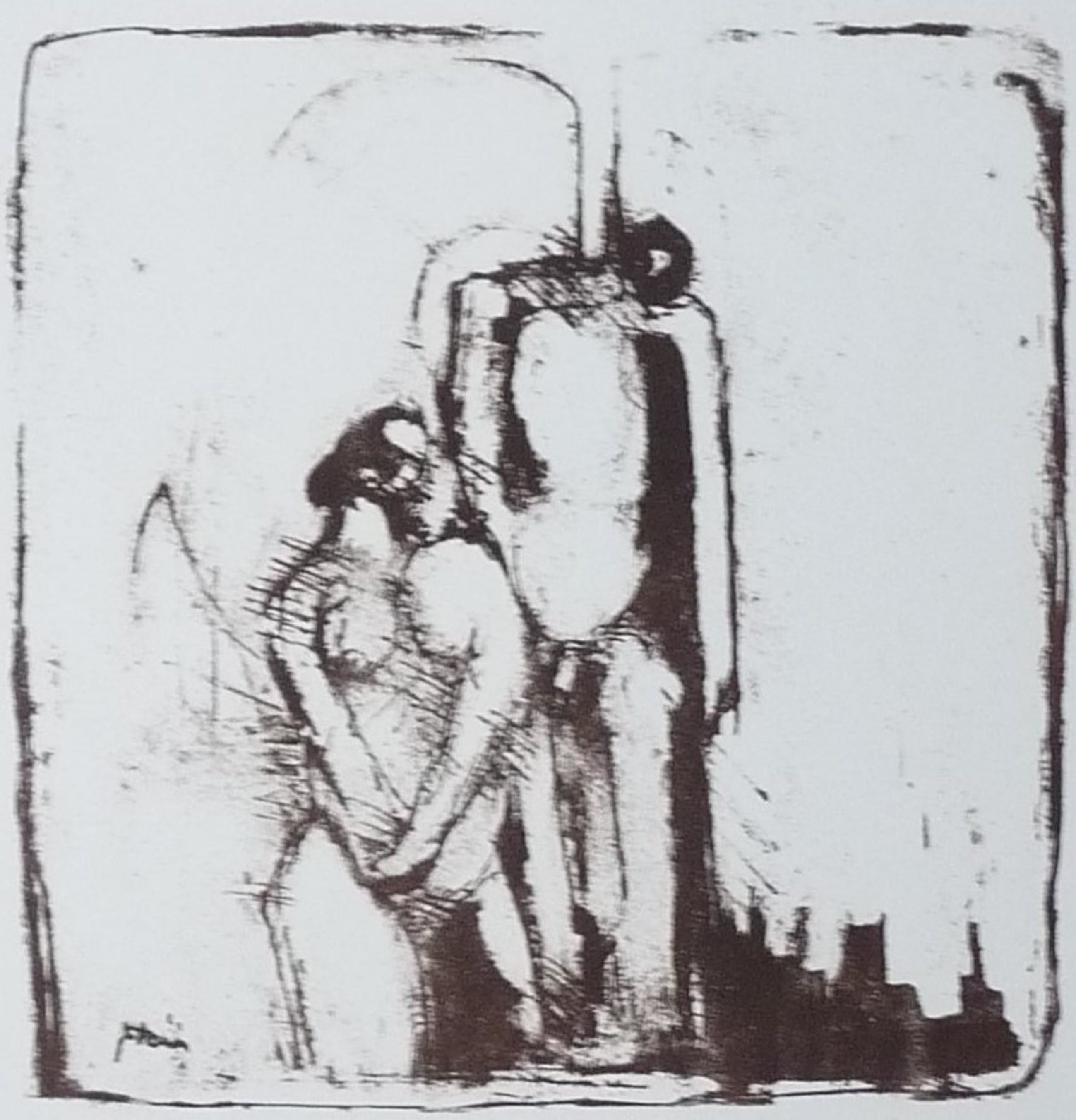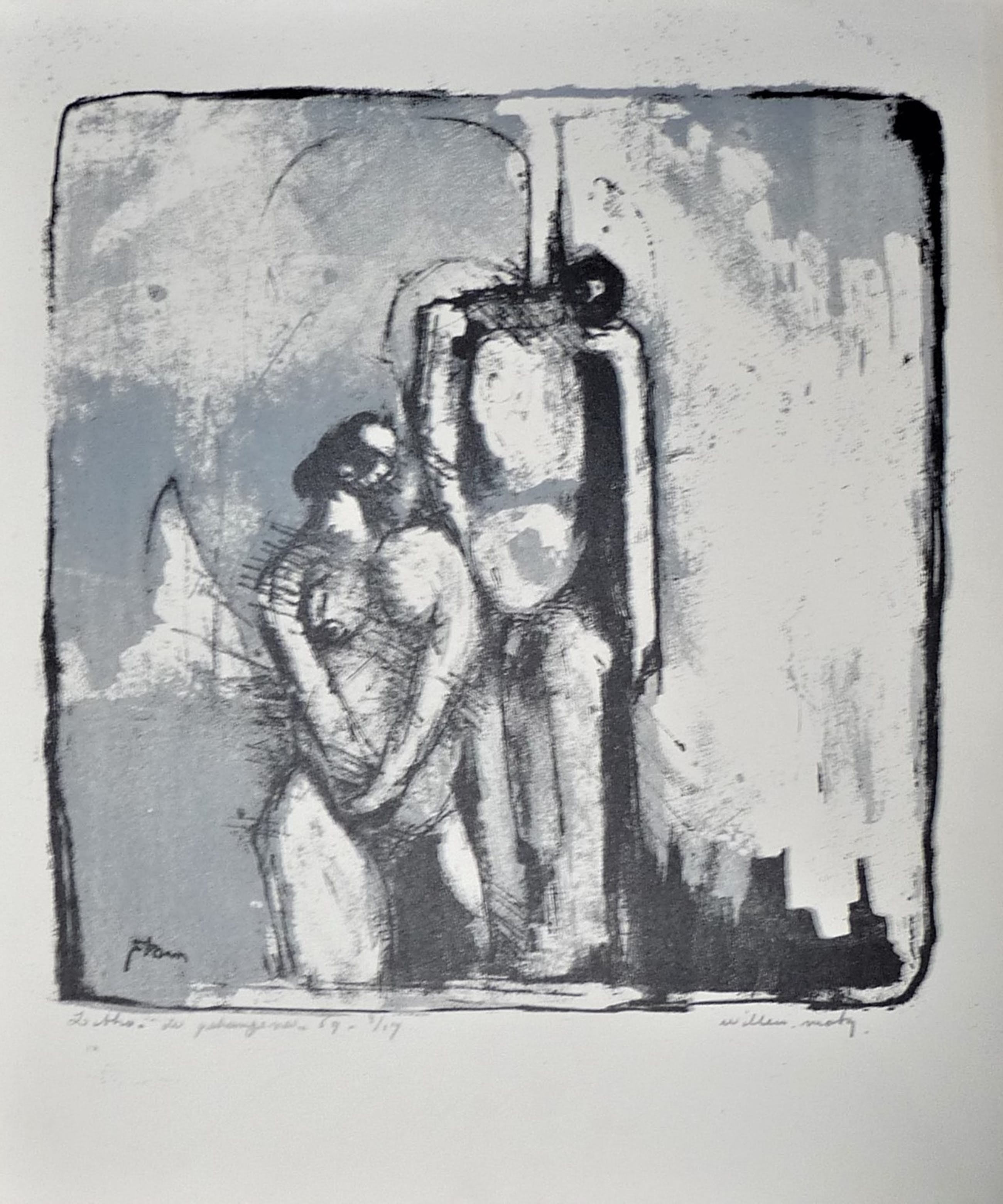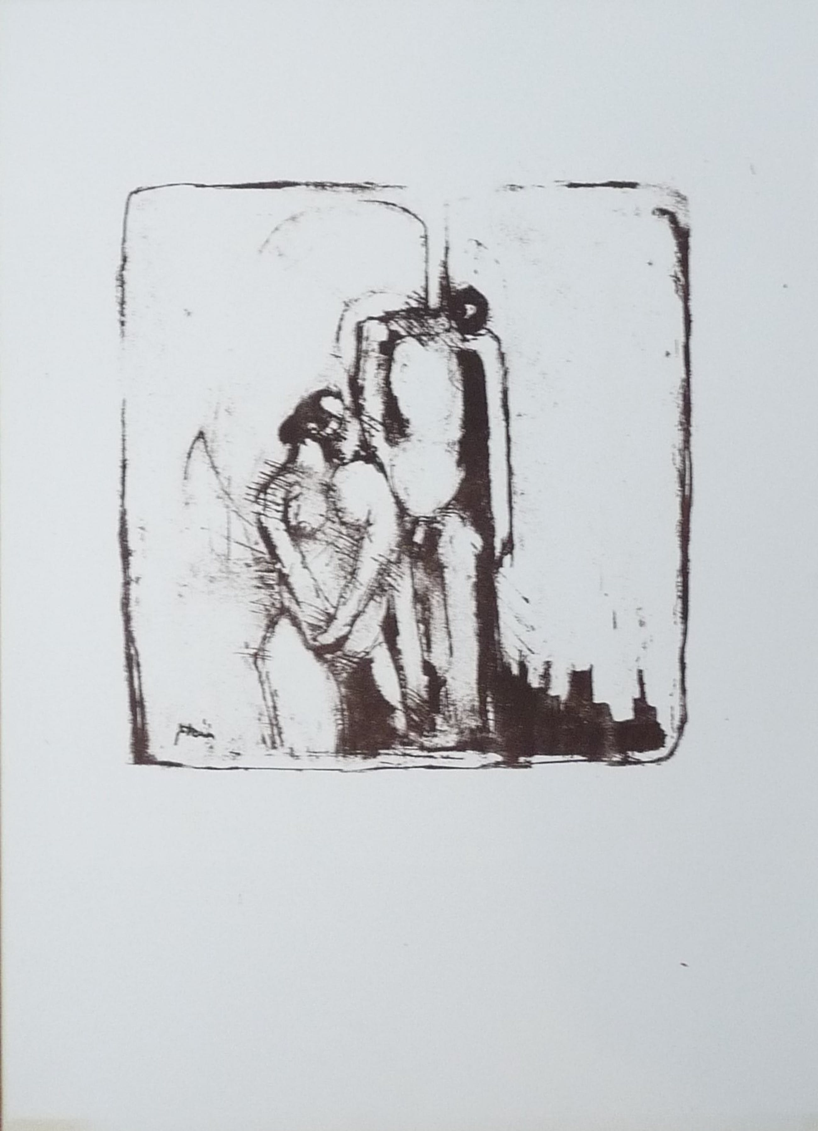 *Litho met zwart en grijs in kleine oplage gedrukt van 17 exemplaren. door de Rotterdamse kunstenaar Wim Motz met de titel: de gehangene.